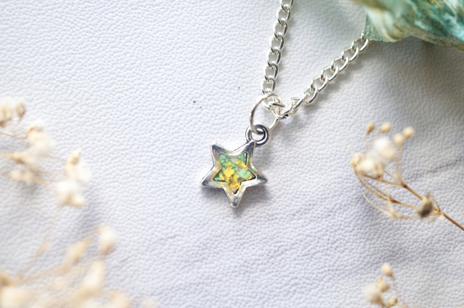Real Dried Flowers in Resin Star Necklace in Green and Yellow