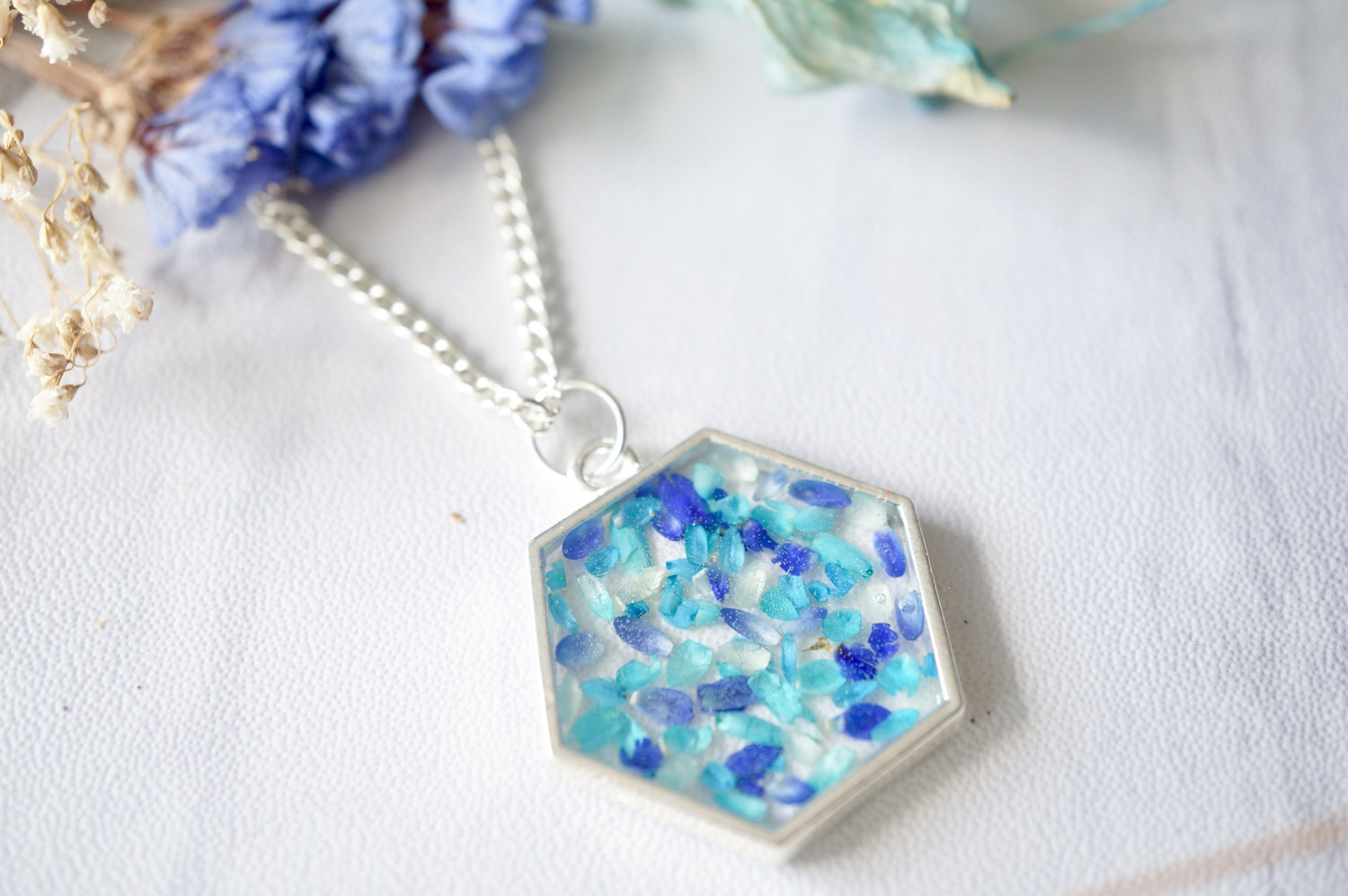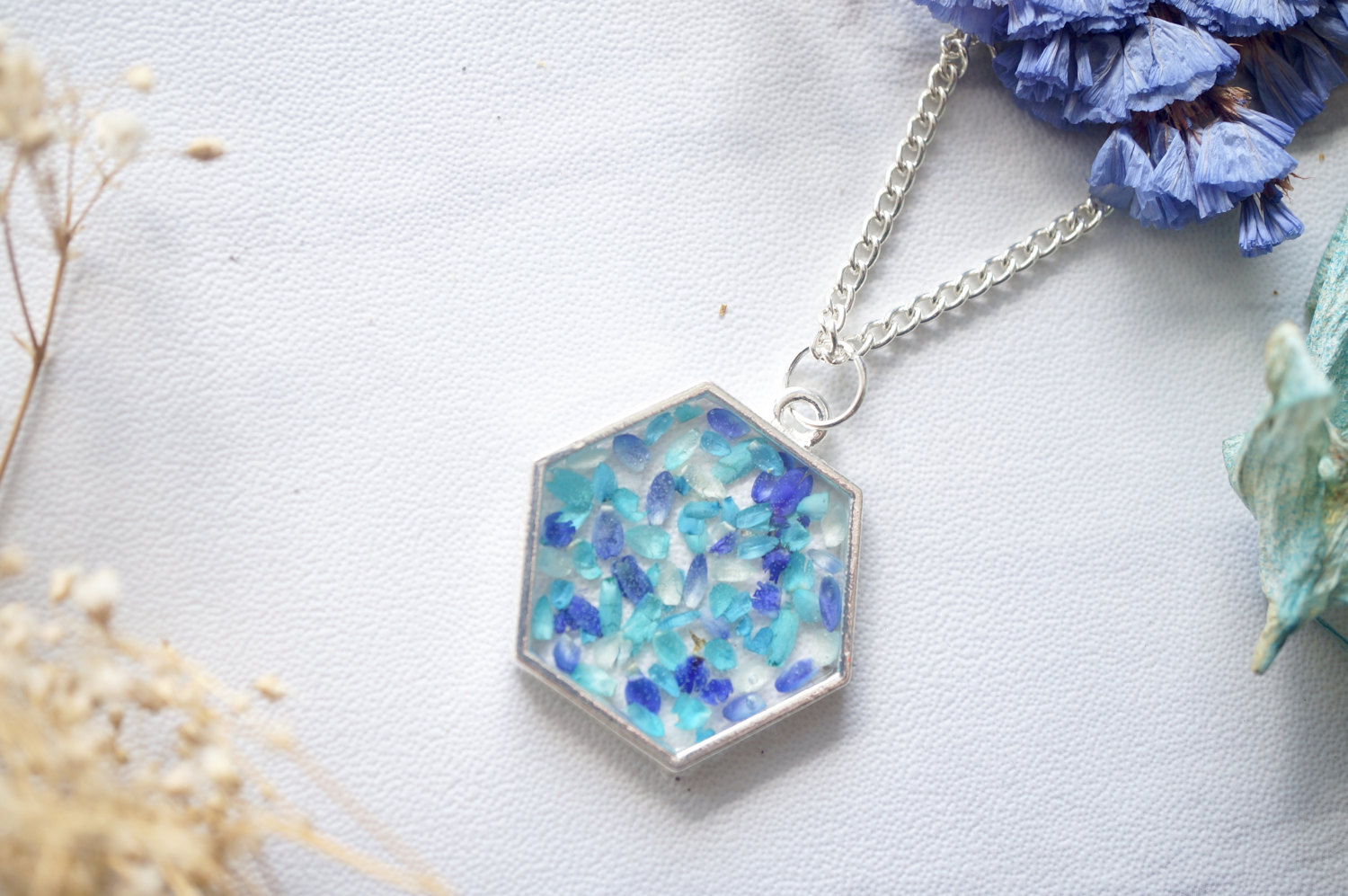 Real Dried Flowers in Resin Silver Hexagon Necklace in Blue Teal Mix