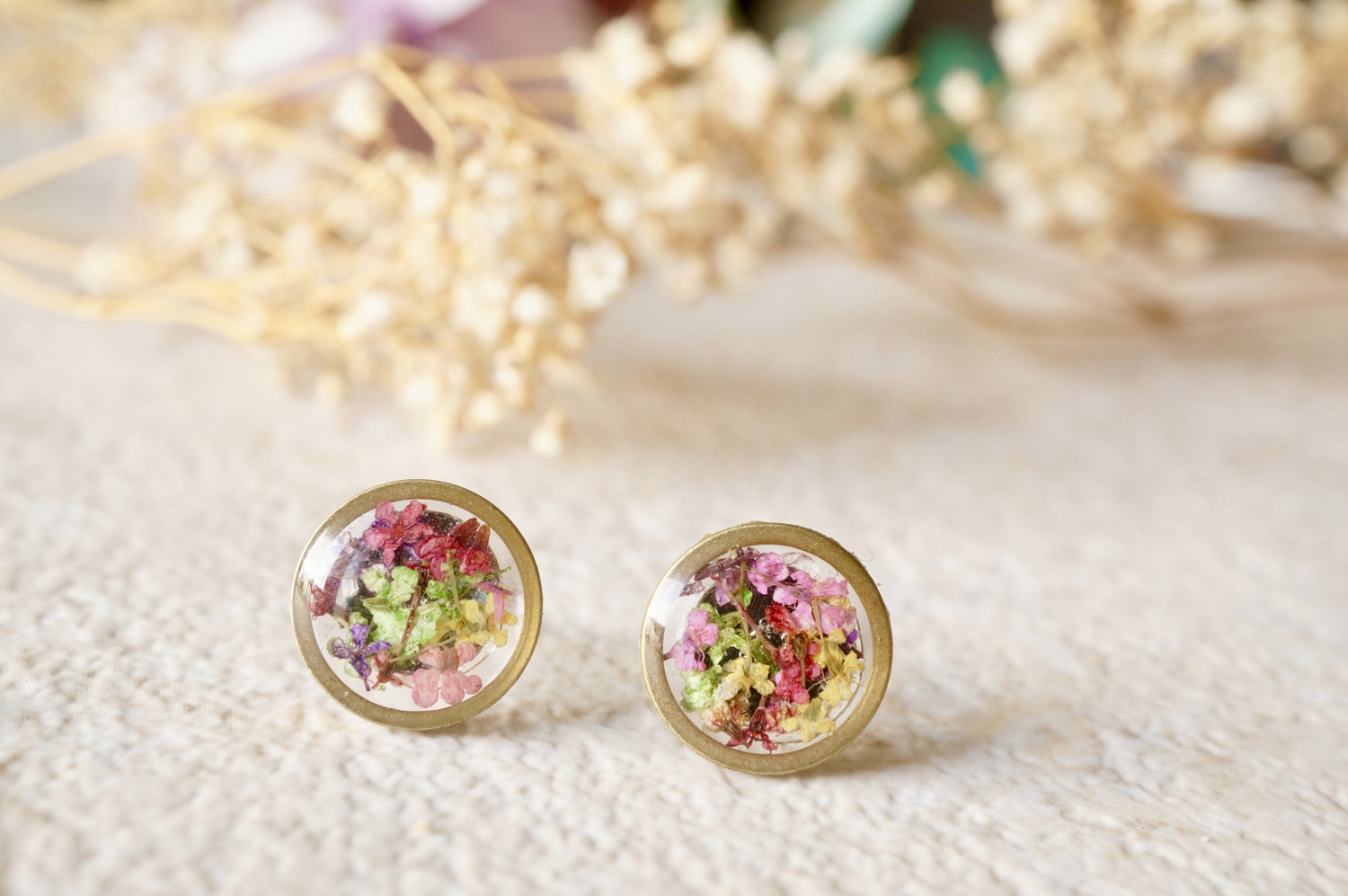 Real Dried Flowers and Resin Circle Stud Earrings in Purple Yellow Pink Red Green Mix