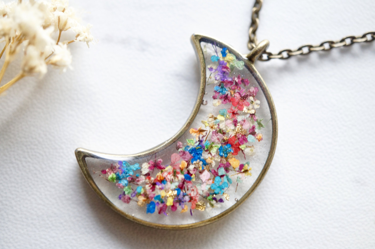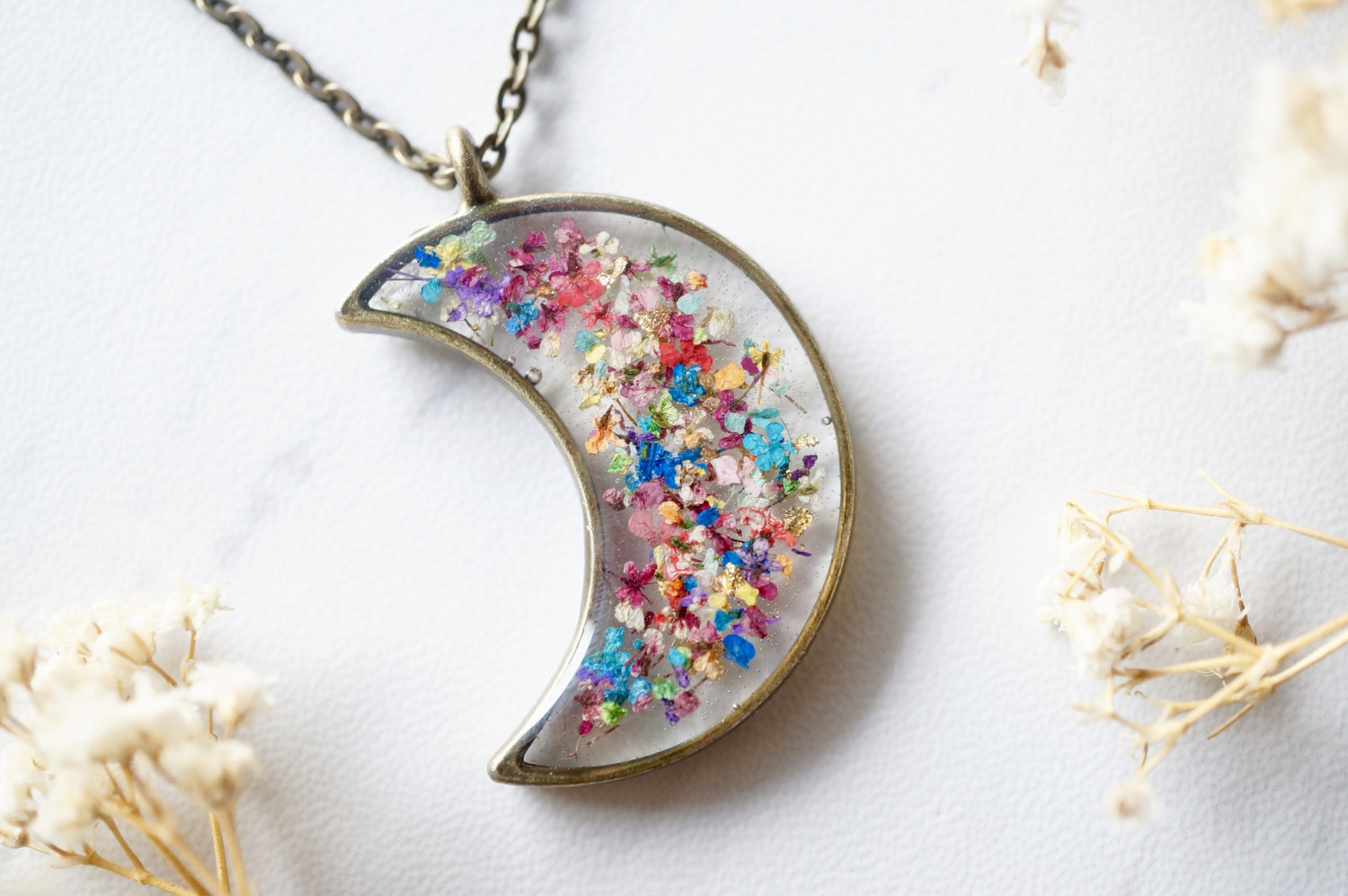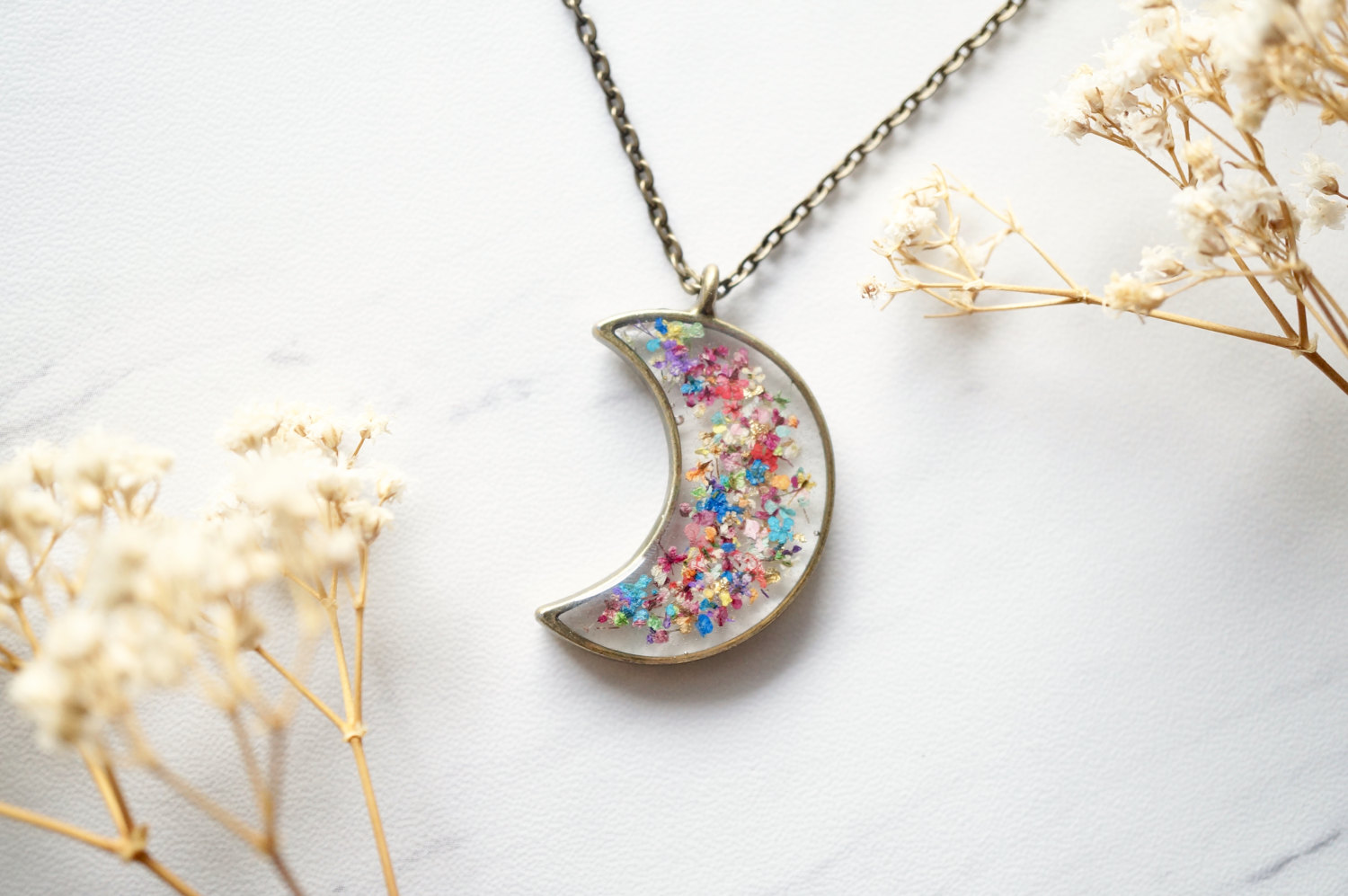 Real Dried Flowers and Resin Moon Necklace in Party Mix