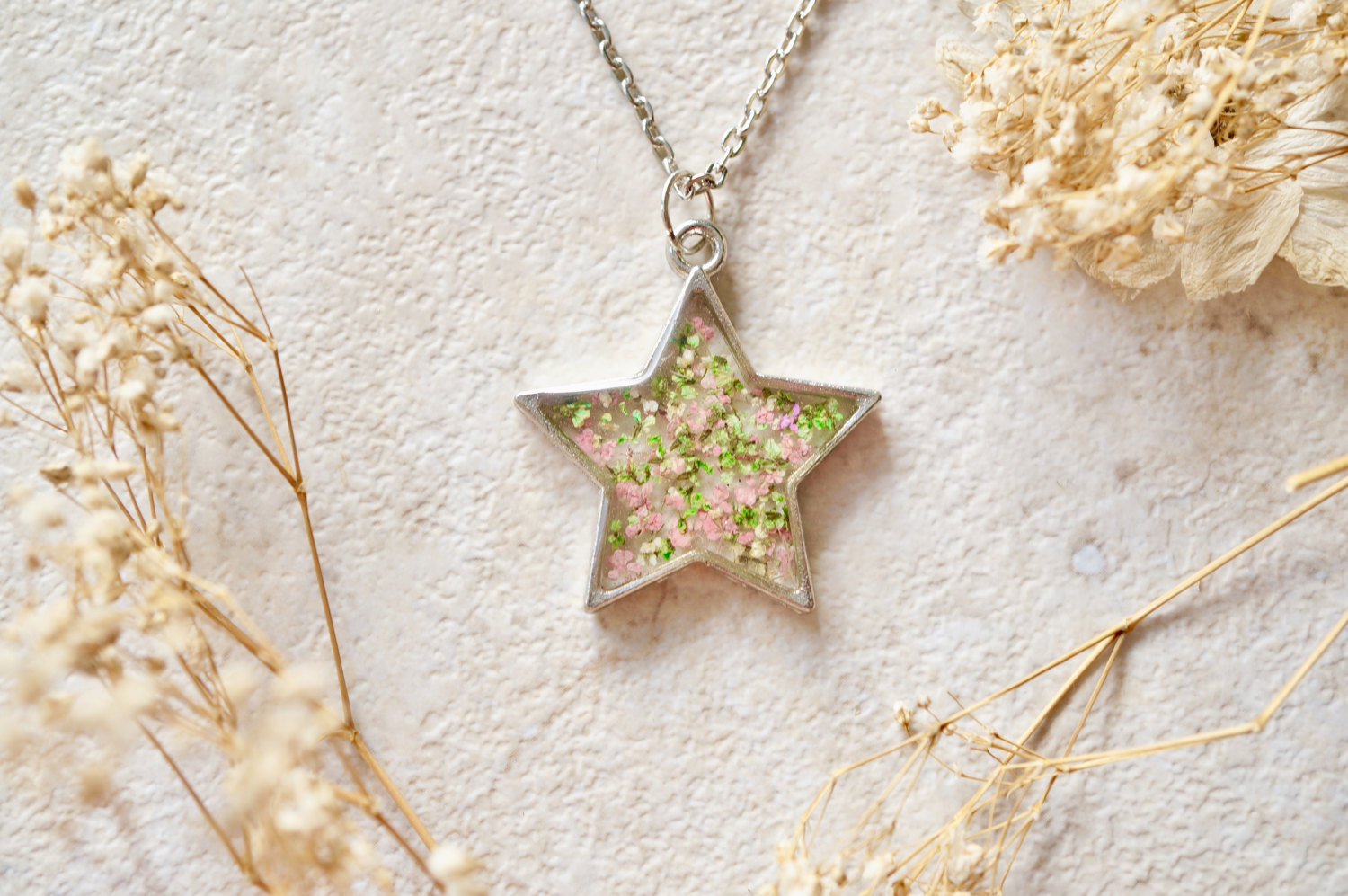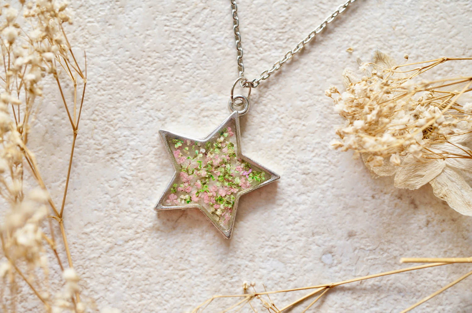 Real Pressed Flower and Resin Star Necklace in Pink Green