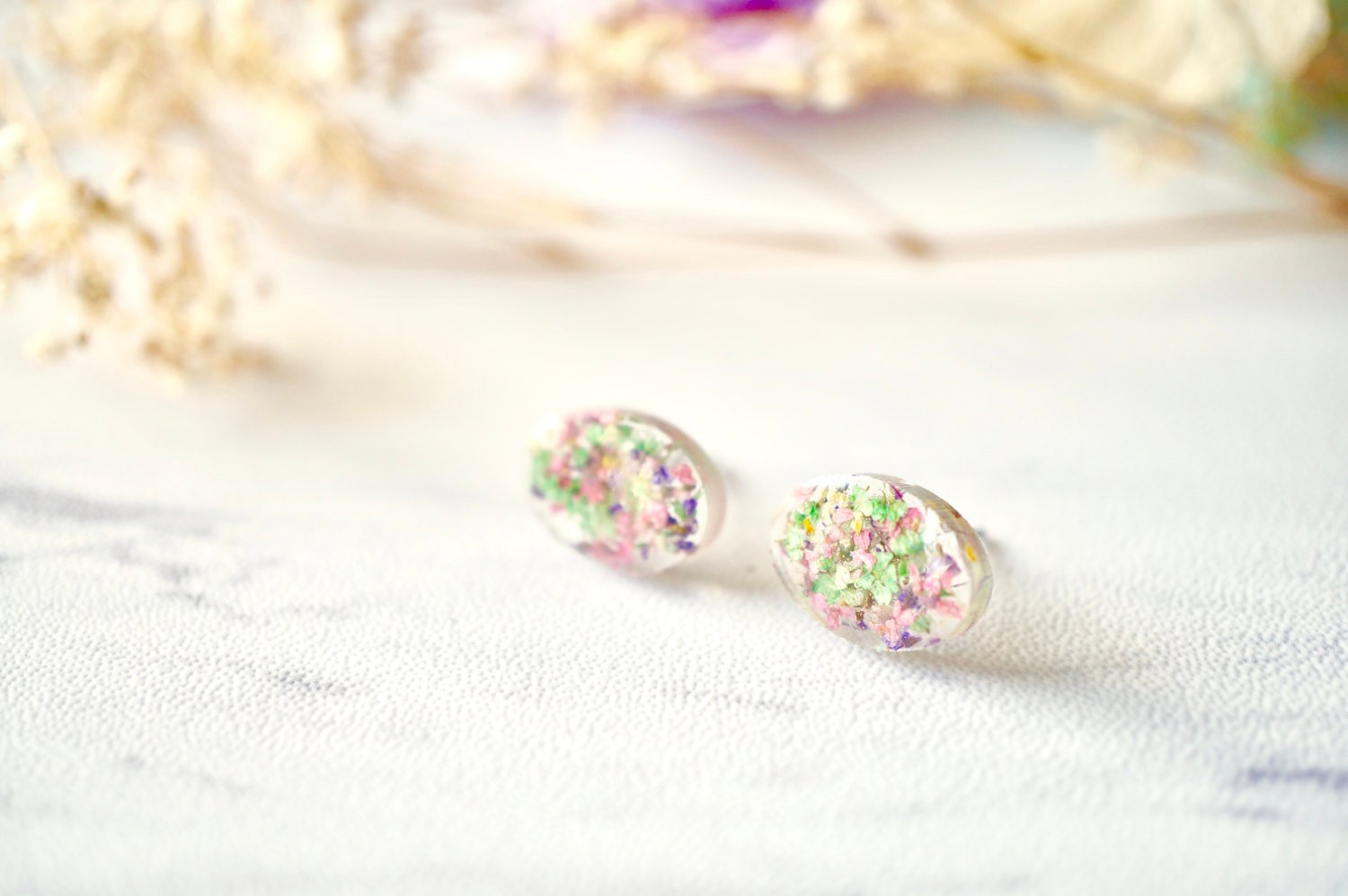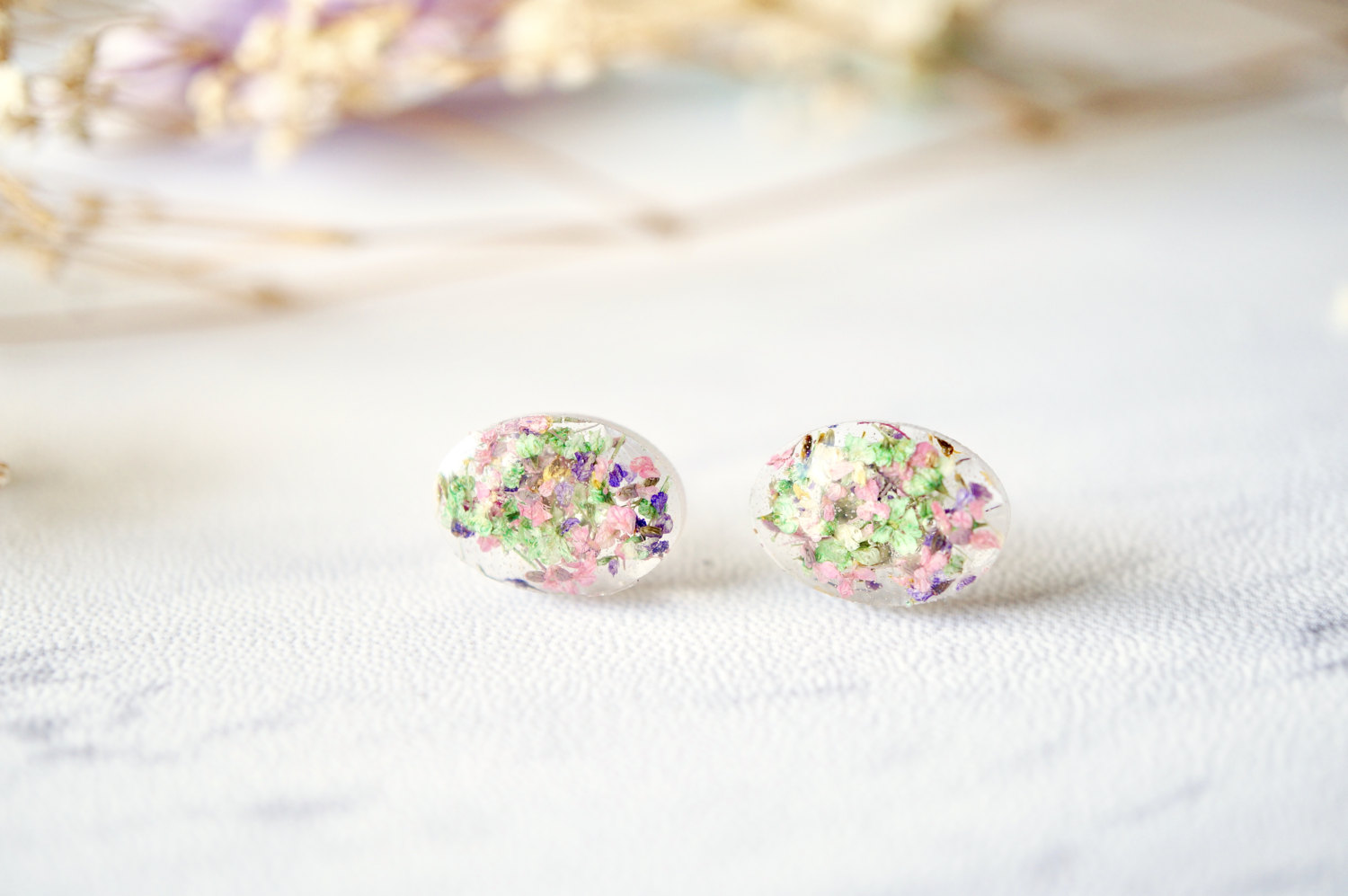 Real Dried Flowers and Resin Oval Stud Earrings in Purple Pink Green