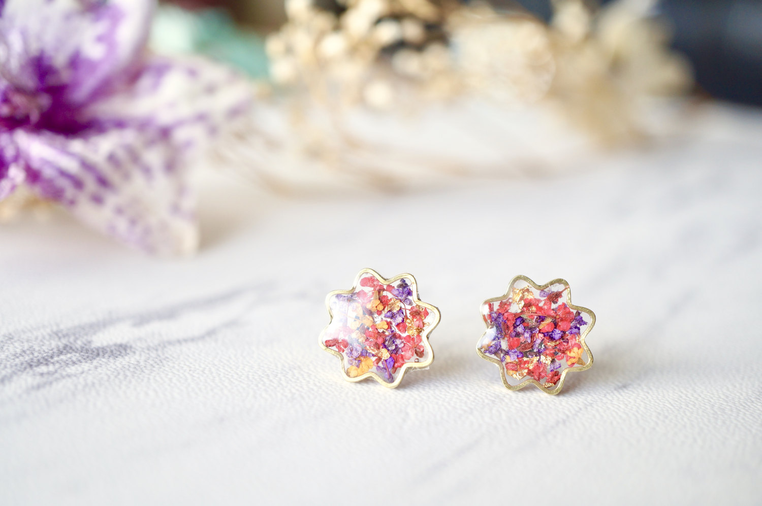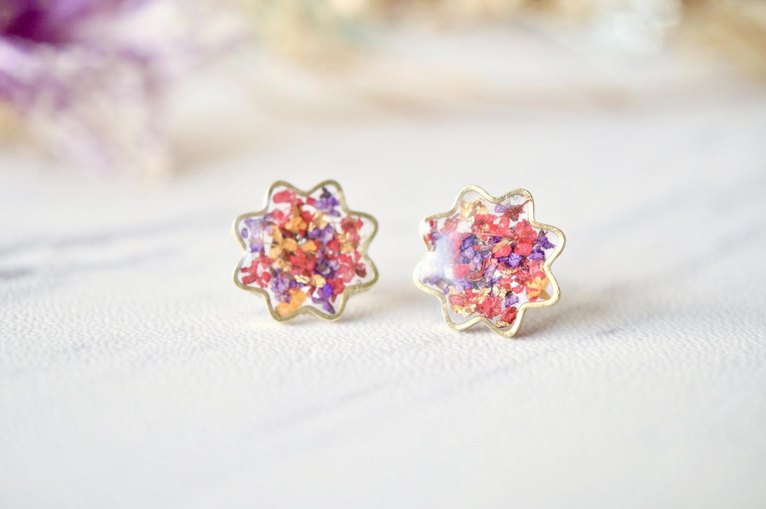 Real Dried Flowers and Resin Flower Stud Earrings in Red Purple Orange Mix