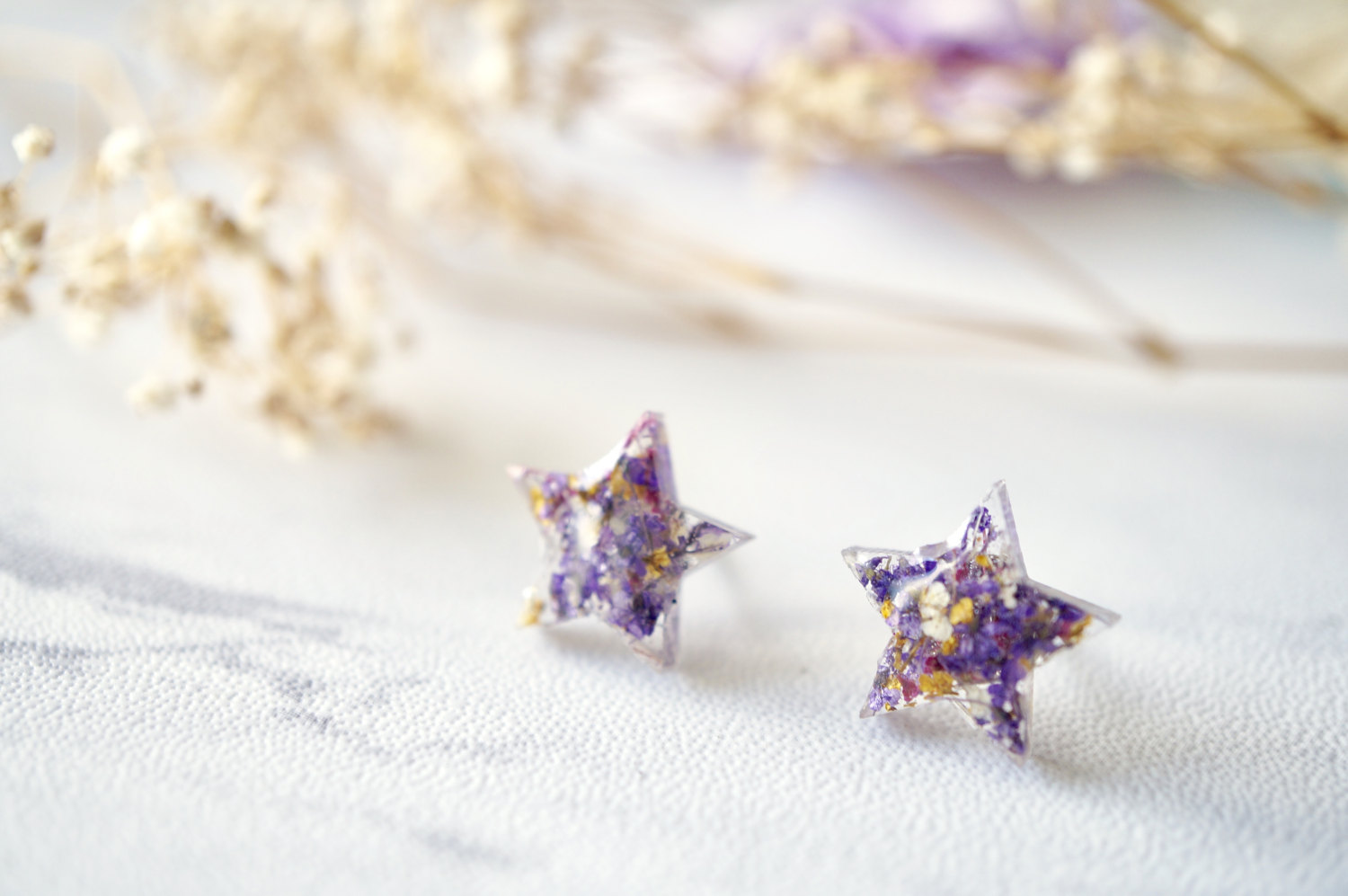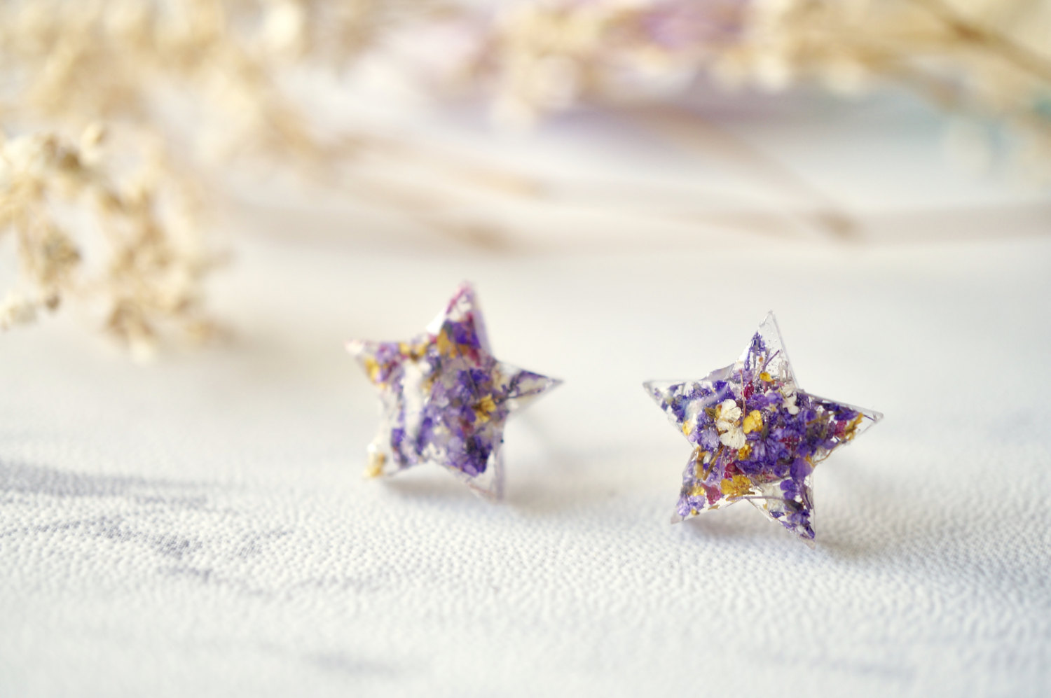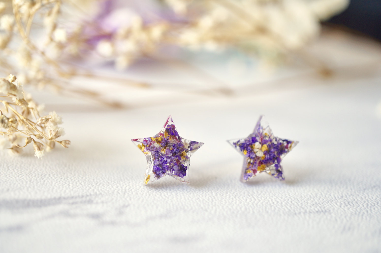 Real Dried Flowers and Resin Star Stud Earrings in Purple Pink Yellow