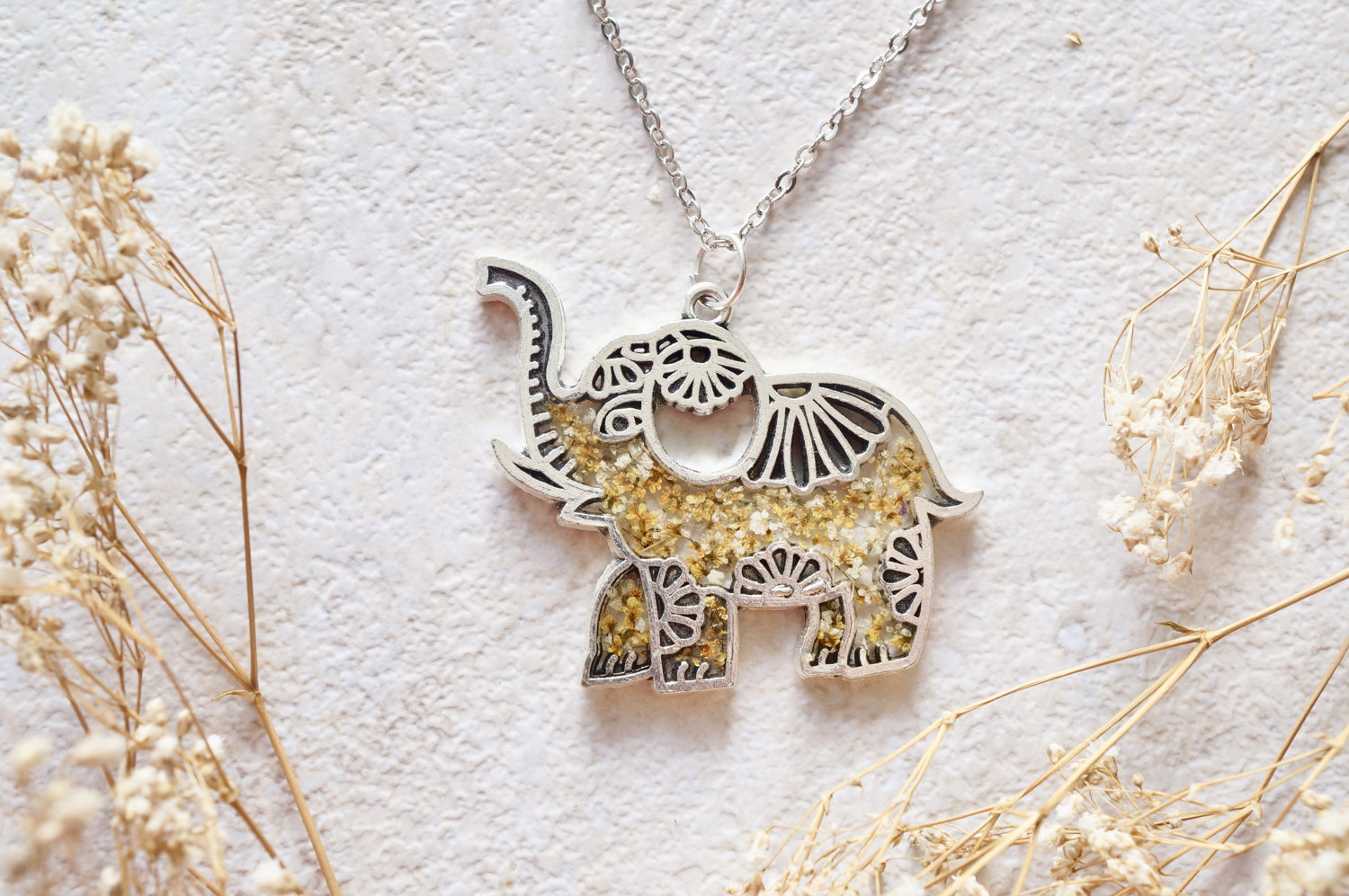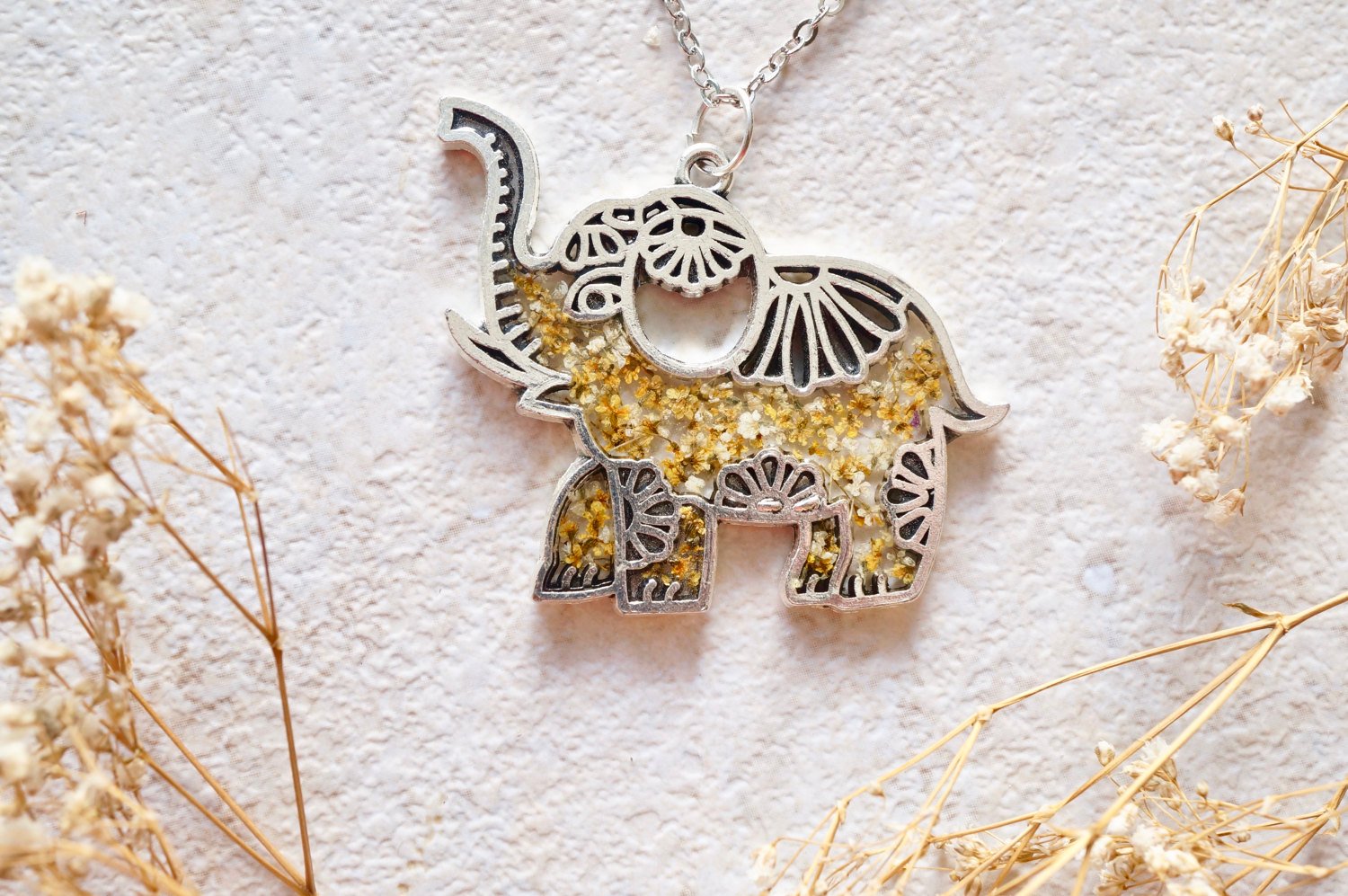 Real Dried Flowers in Resin Silver Tribal Elephant Necklace in Yellow White Mix
