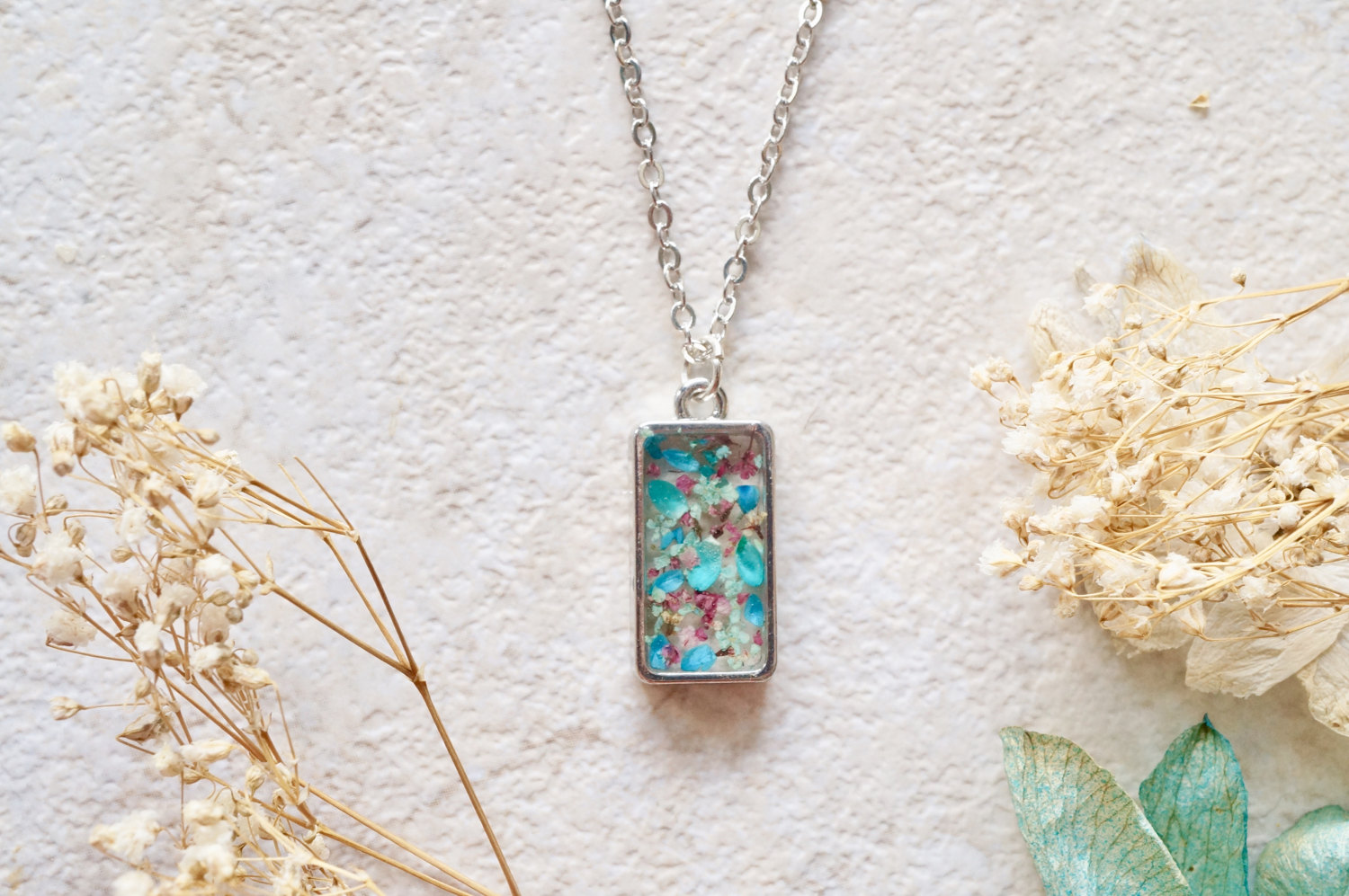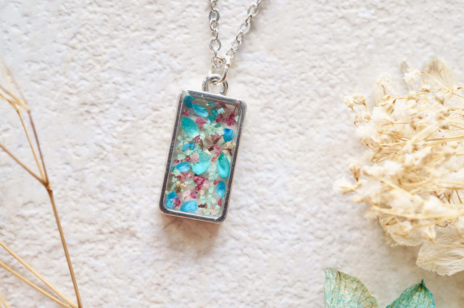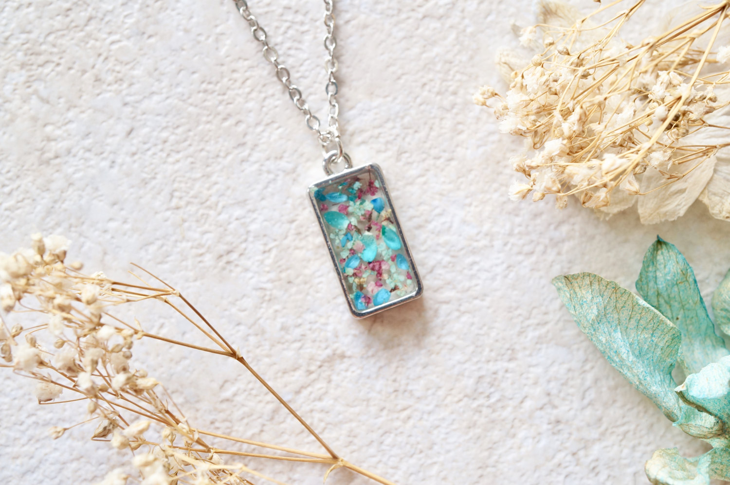 Real Dried Flowers in Resin Necklace in Blue Mint Pink