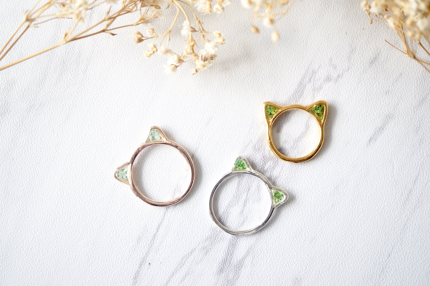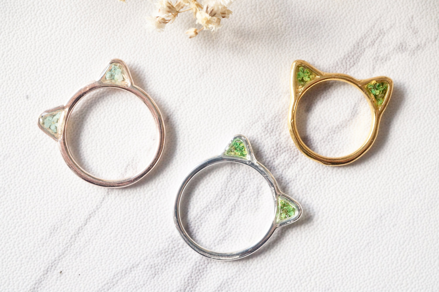 This adorable cat ring is handmade with real pressed flowers encased in resin inside the ears! This beautiful metal silver cat and flower ring is like wearing a piece of nature.