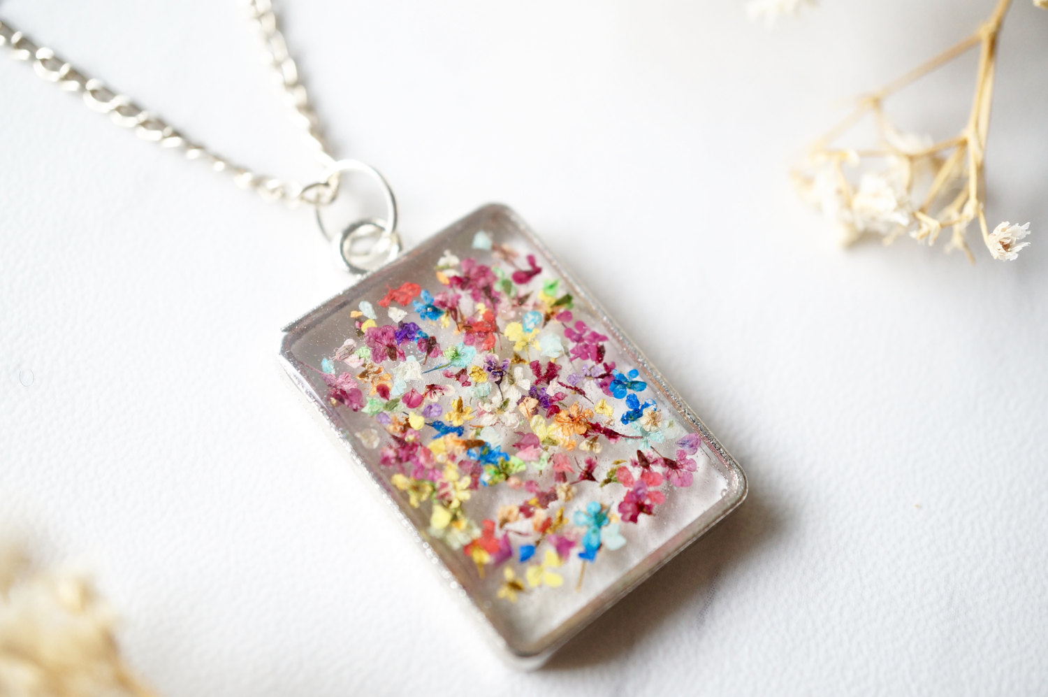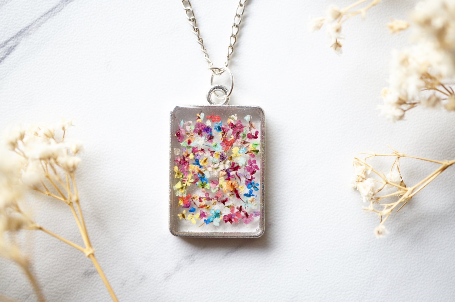 Real Dried Flowers in Resin Necklace, Silver Square in Party Mix