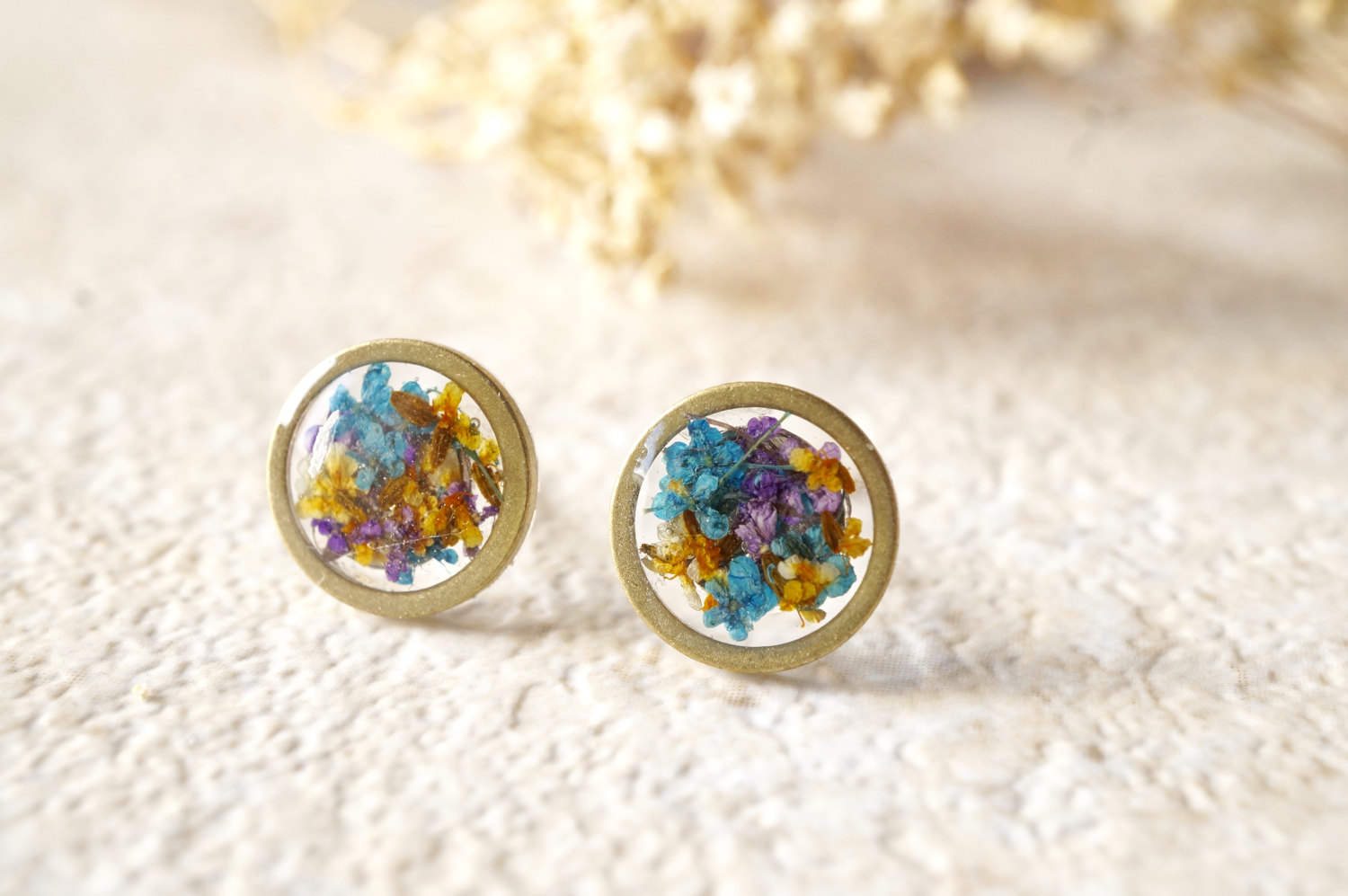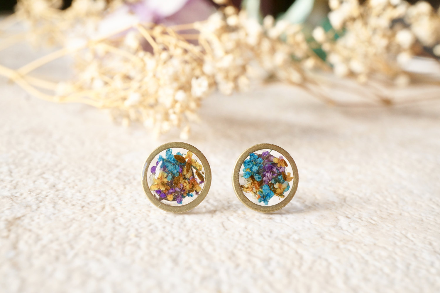 Real Dried Flowers and Resin Circle Stud Earrings in Purple Orange Blue