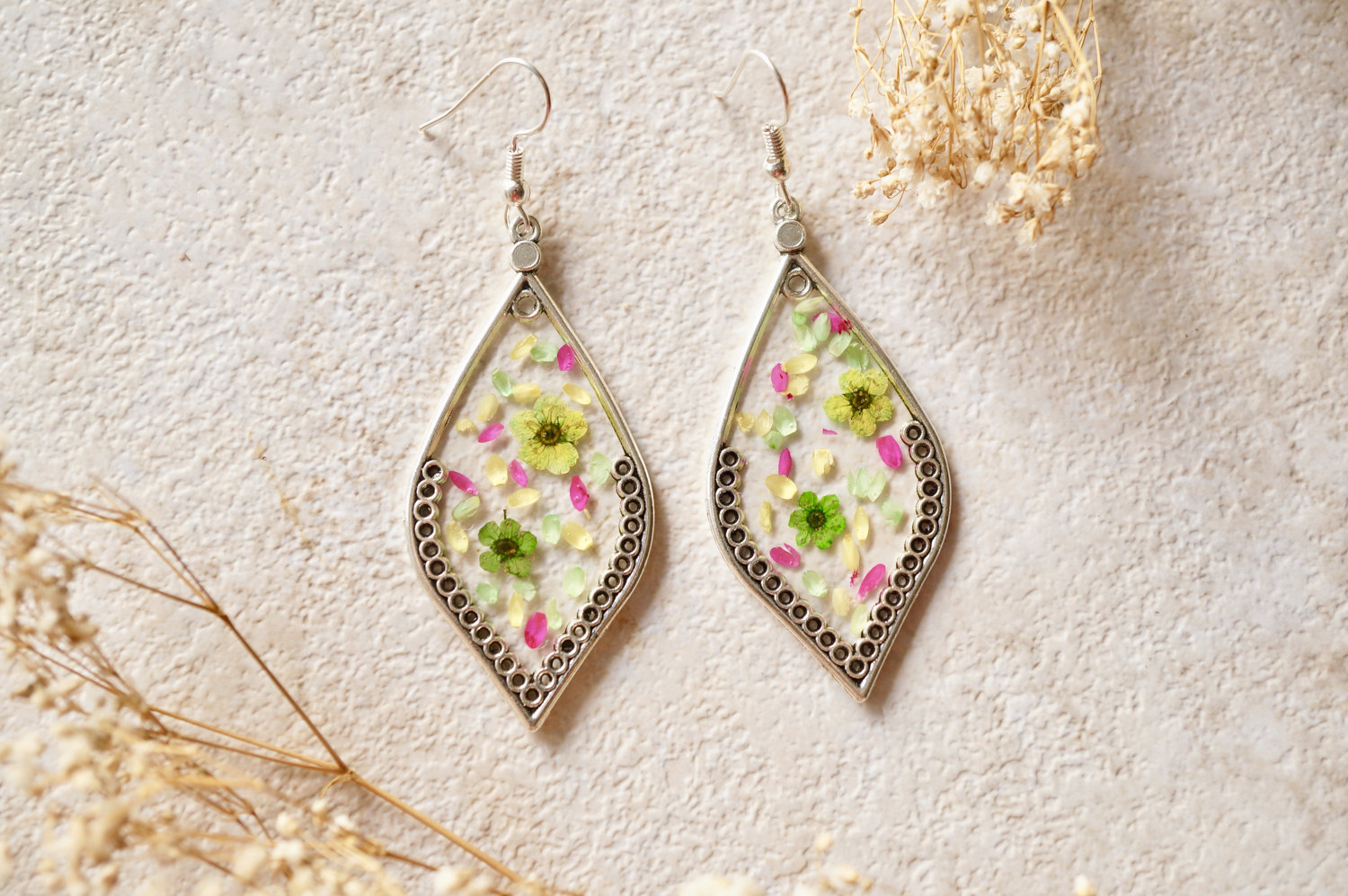 These earrings are handmade with real pressed flowers encased in resin. Surrounded by a beautiful silver frame, these earrings are like wearing a piece of nature. Ear hooks are nickel free zinc alloy, great for sensitive ears.
