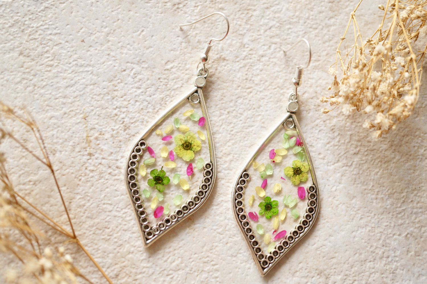 Real Dried Flowers and Resin Earrings in Green White Pink