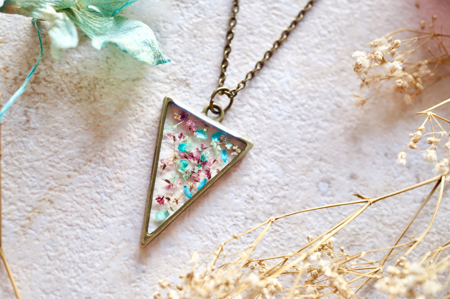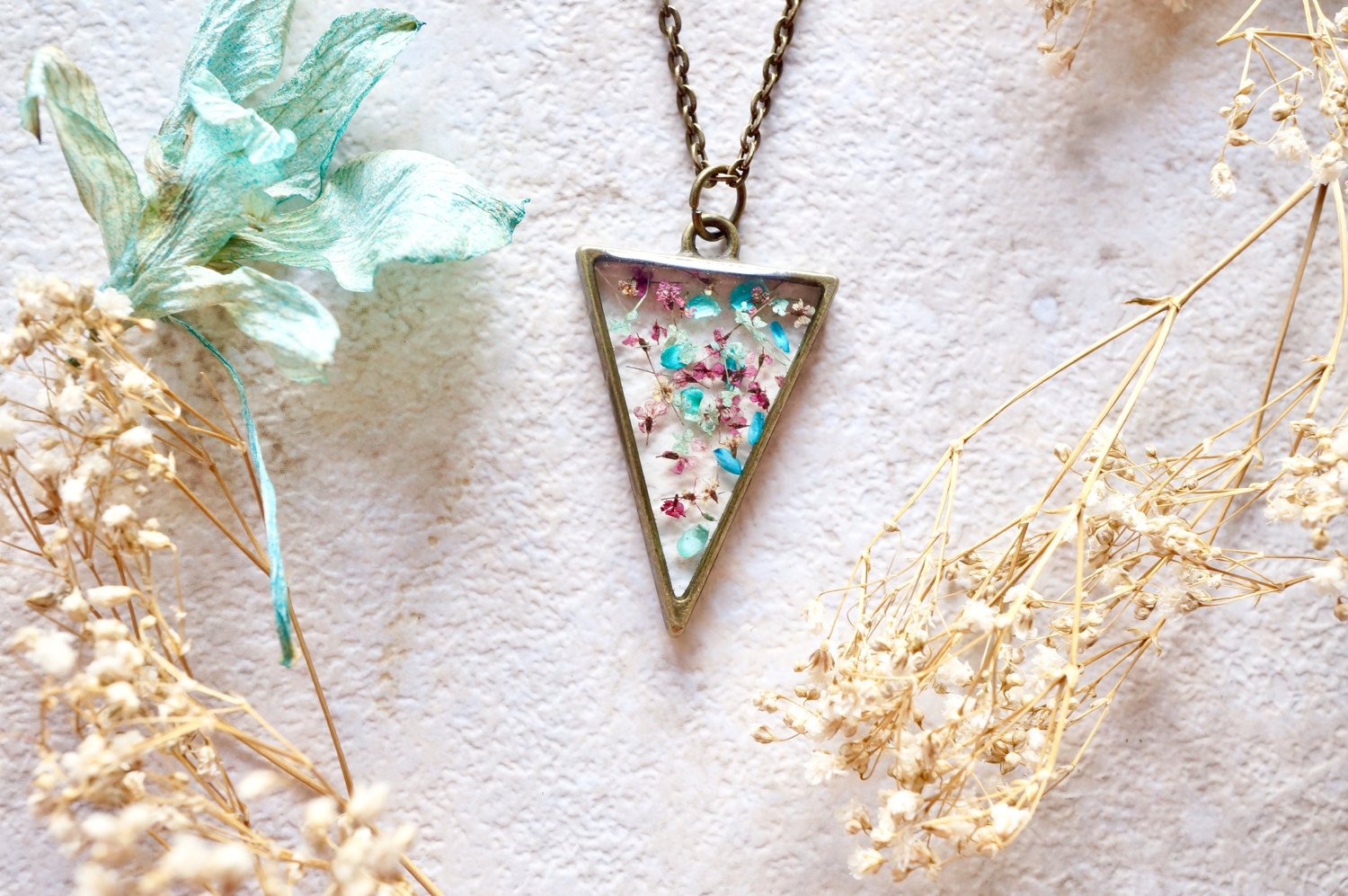 Real Dried Flowers in Resin Necklace, Triangle in Pink Blue Mint