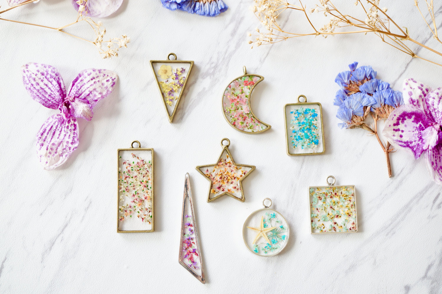 These necklaces are handmade with real pressed flowers encased in resin. Surrounded by a beautiful metal bronze frame, this necklace is like wearing a piece of nature. Each piece is one of a kind. Sometimes we will use the same color combination, but no two are exactly alike!