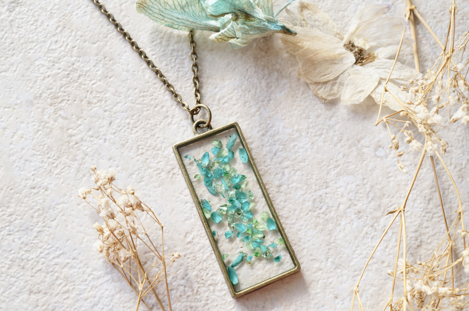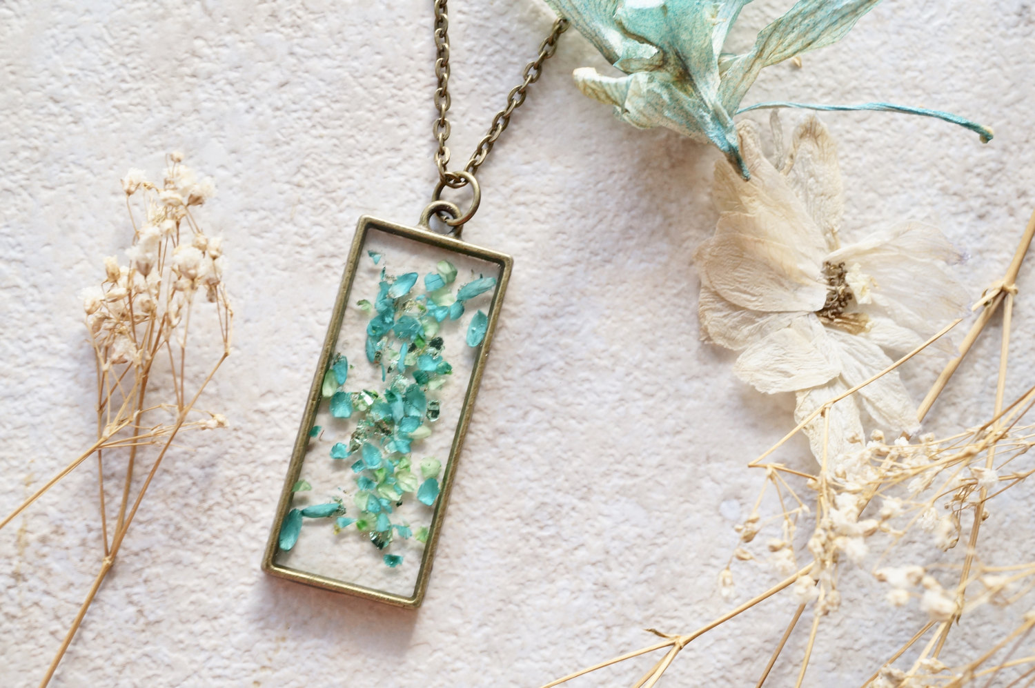 Real Dried Flowers and Resin Necklace, Rectangle Teal and Mint with Teal Flakes