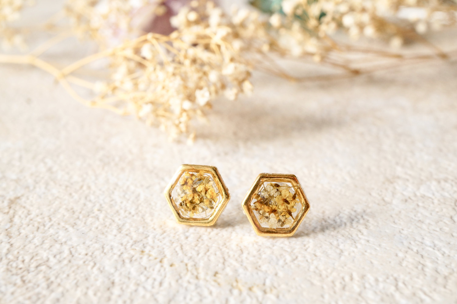 Real Dried Flowers and Resin Hexagon Gold Stud Earrings in Yellow and White