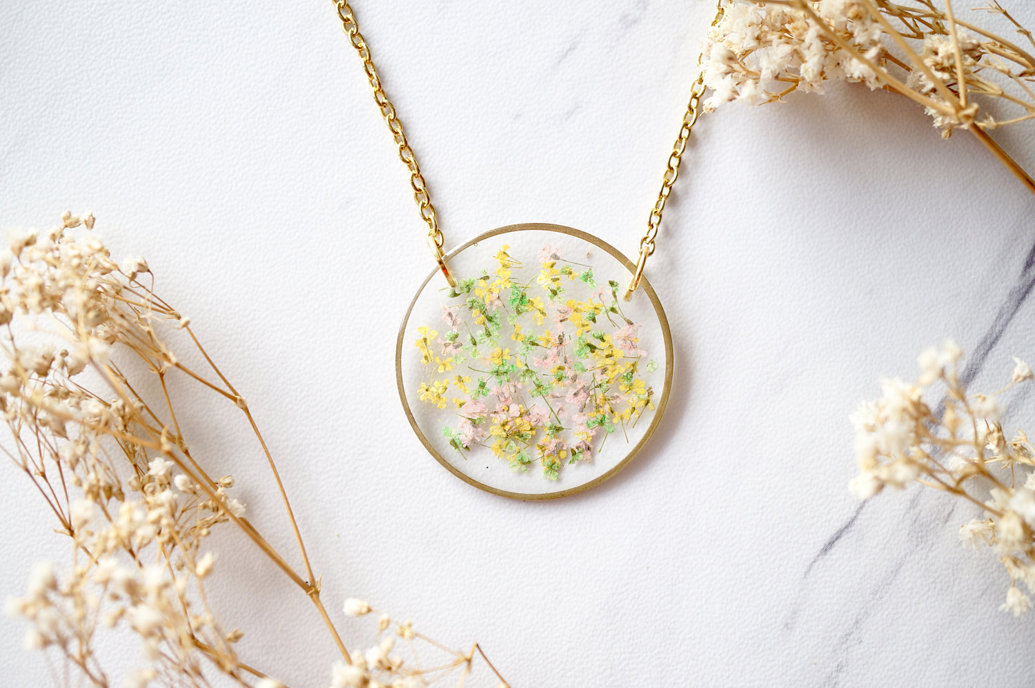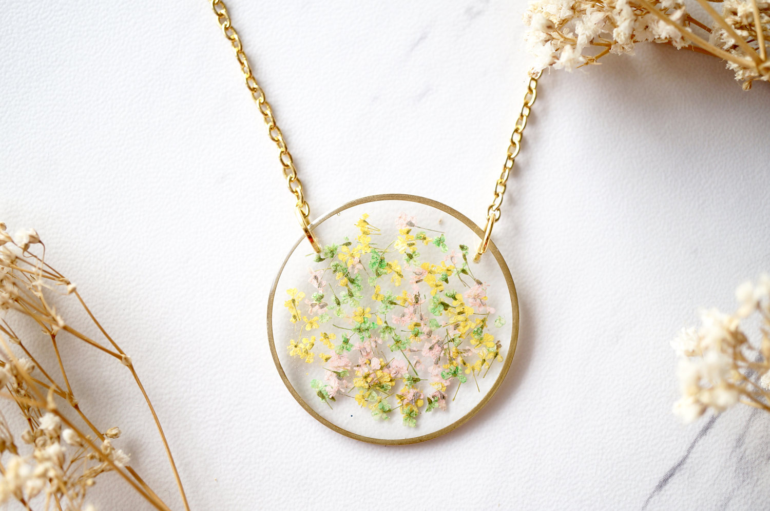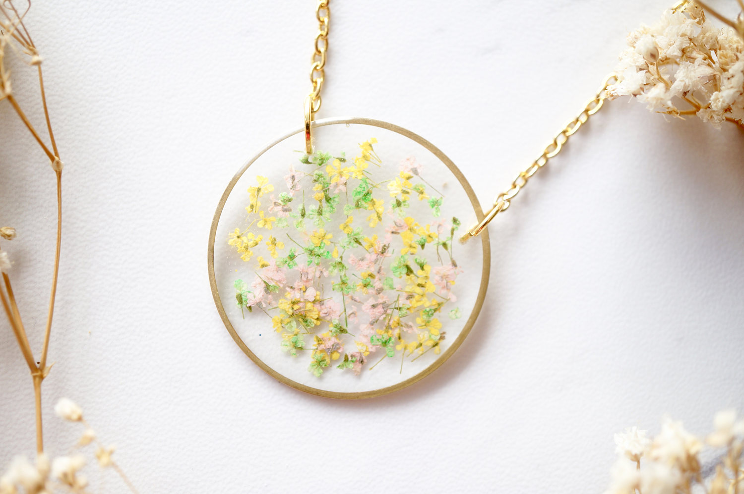 Real Dried Flowers in Resin Necklace, Gold Circle in Pink Yellow Green