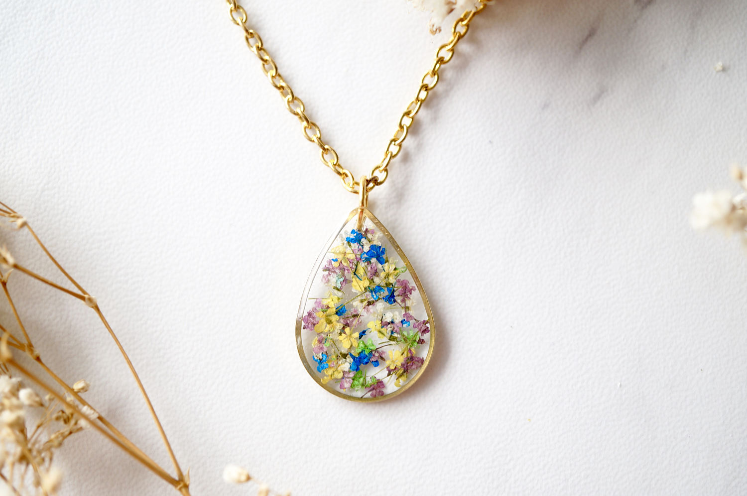 Real Dried Flowers and Resin Necklace, Gold Teardrop in Purple Yellow White Blue Green