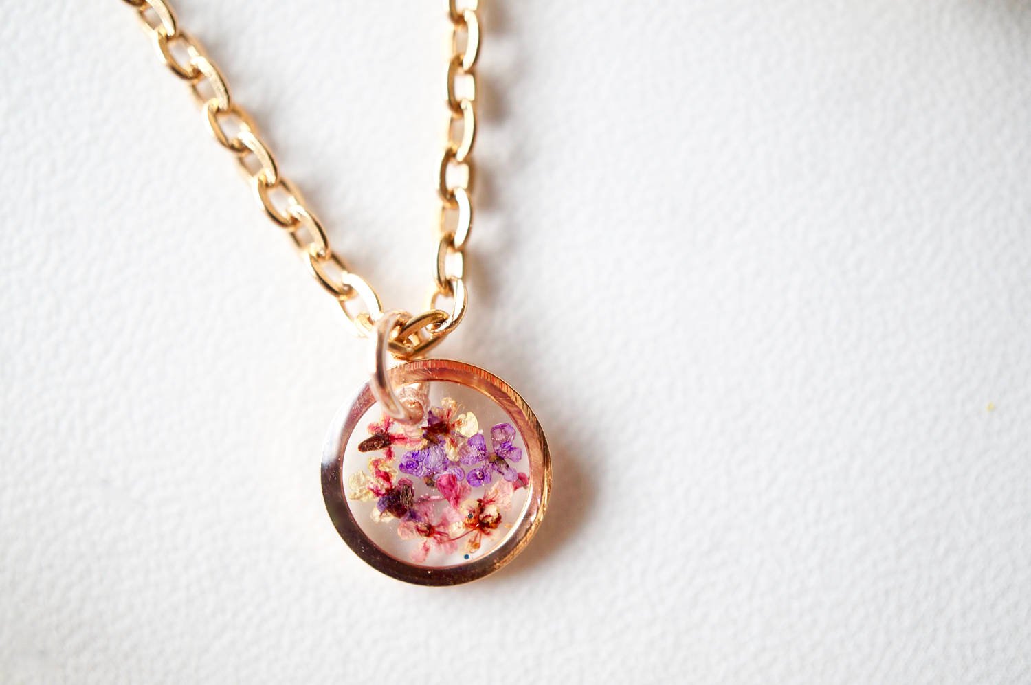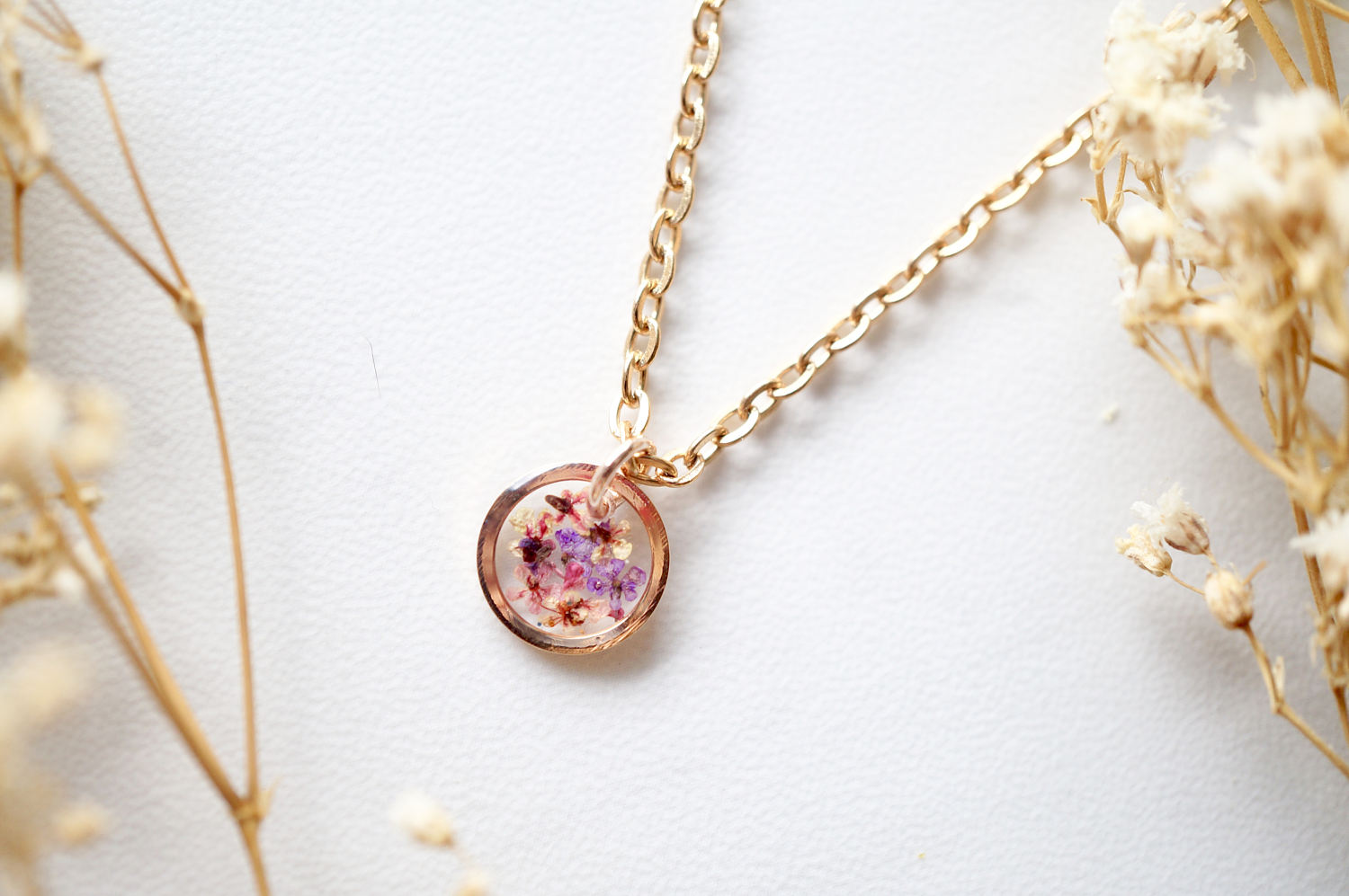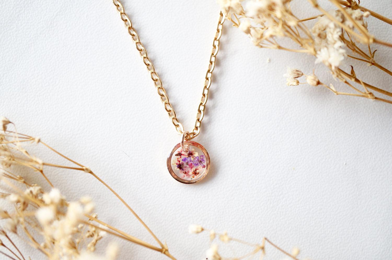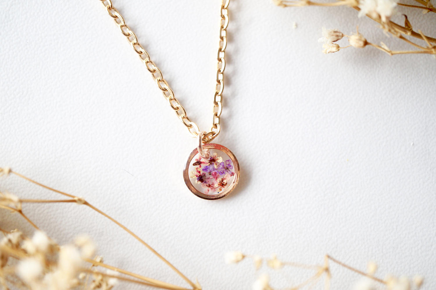 Real Dried Flowers in Resin Necklace, Small Rose Gold Circle in Pinks and Purple