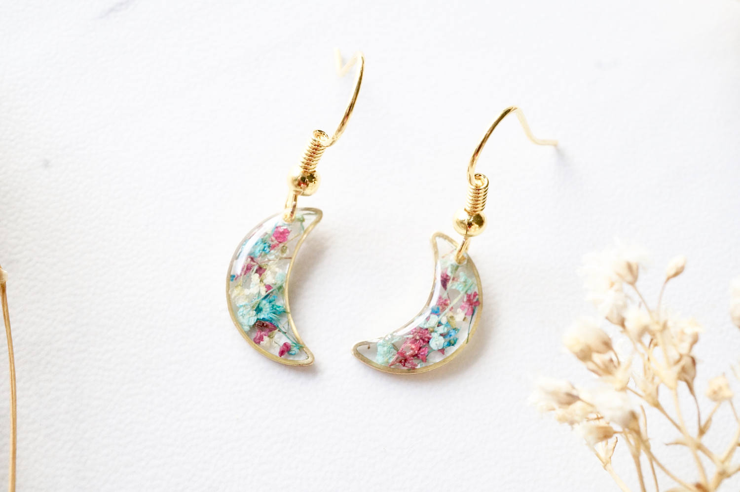Real Dried Flowers and Resin Earrings, Gold Moons in Maroon Mint Teal White