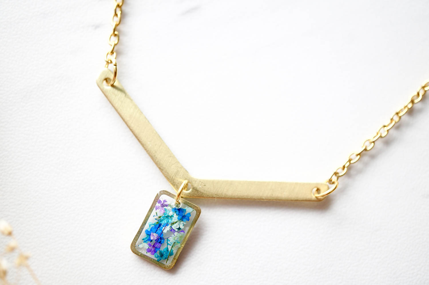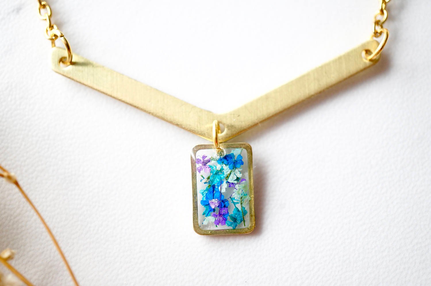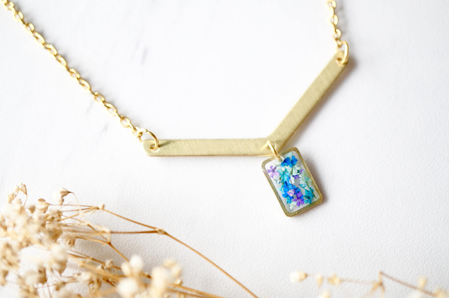 Real Dried Flowers in Resin Necklace, Gold Arrow and Rectangle in Purple Blue Mint Teal