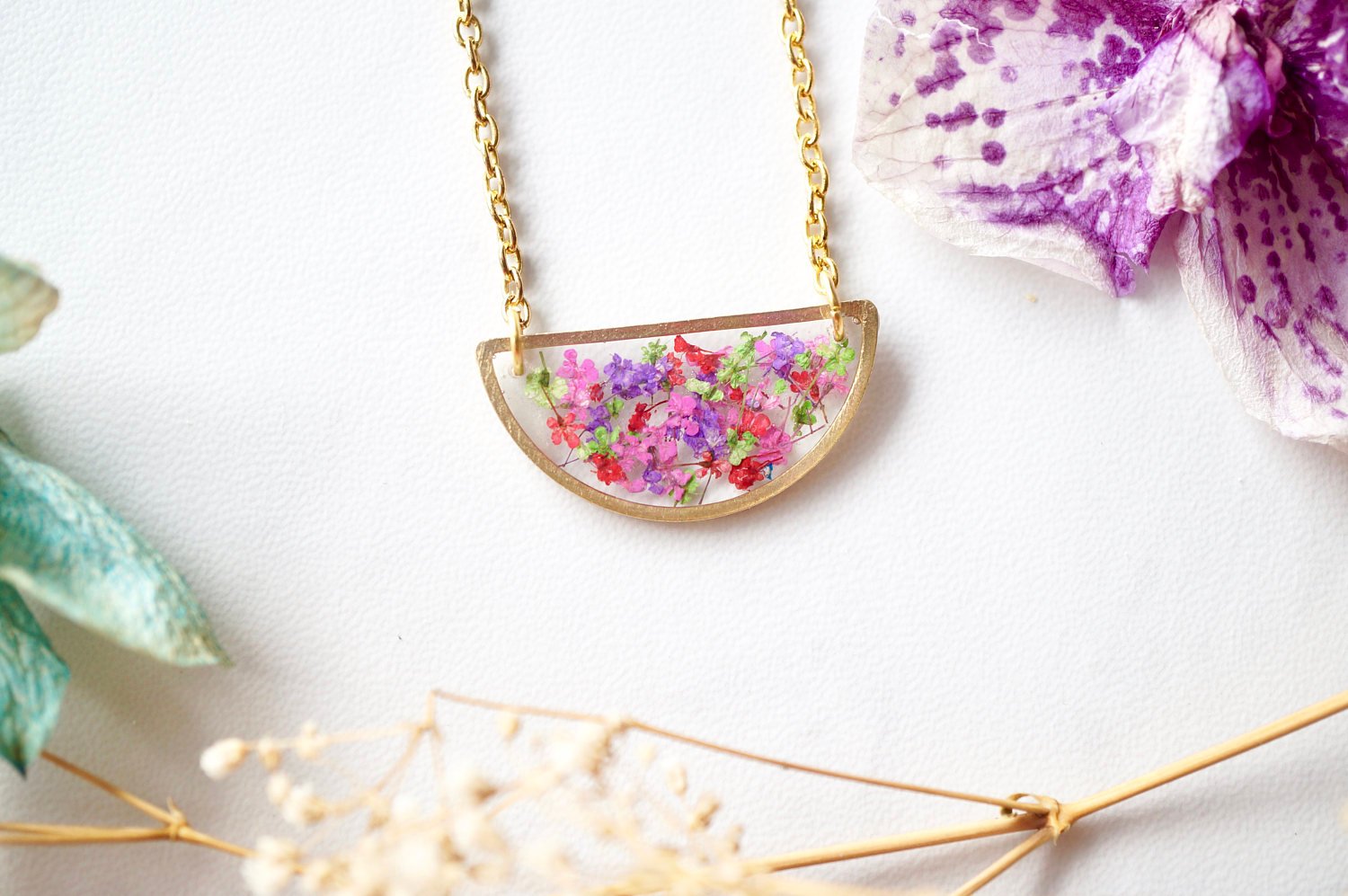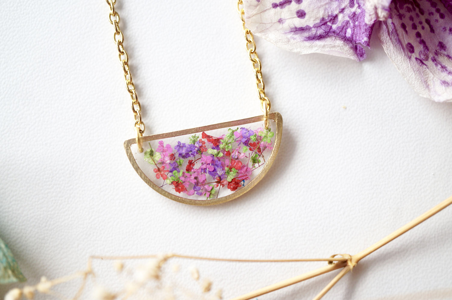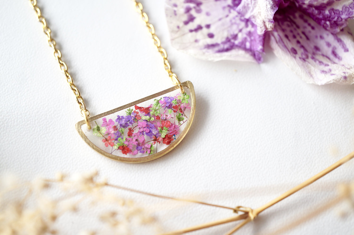 Real Dried Flowers in Resin Necklace, Half Circle in Purple Red Purple Green