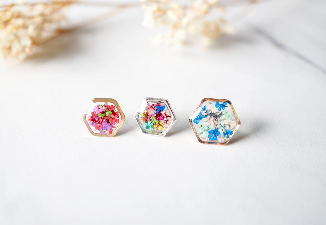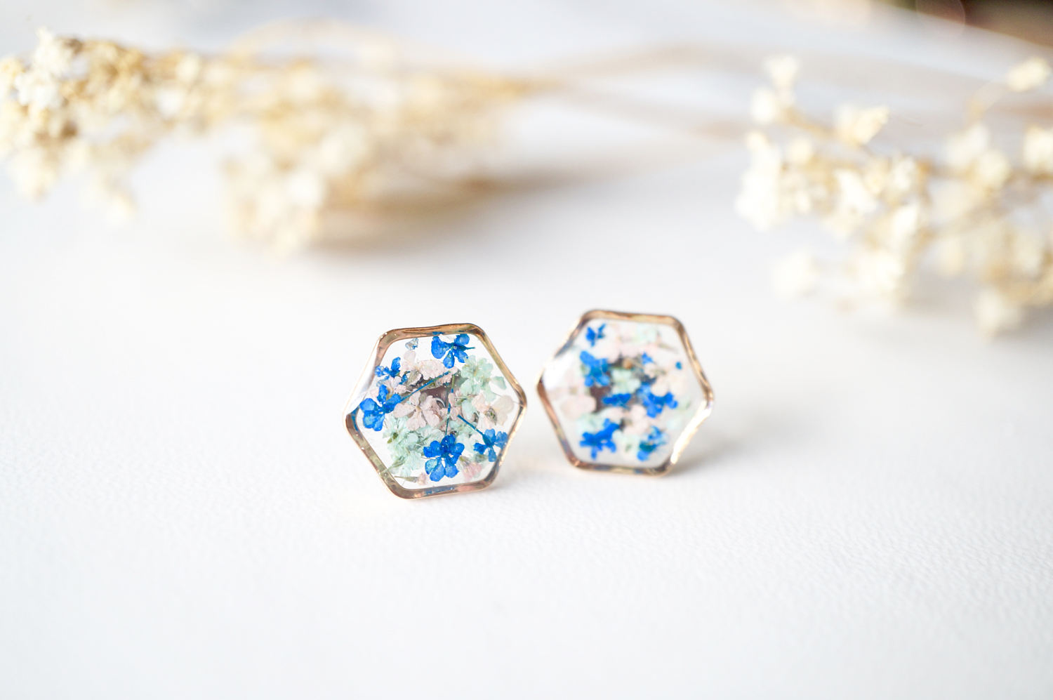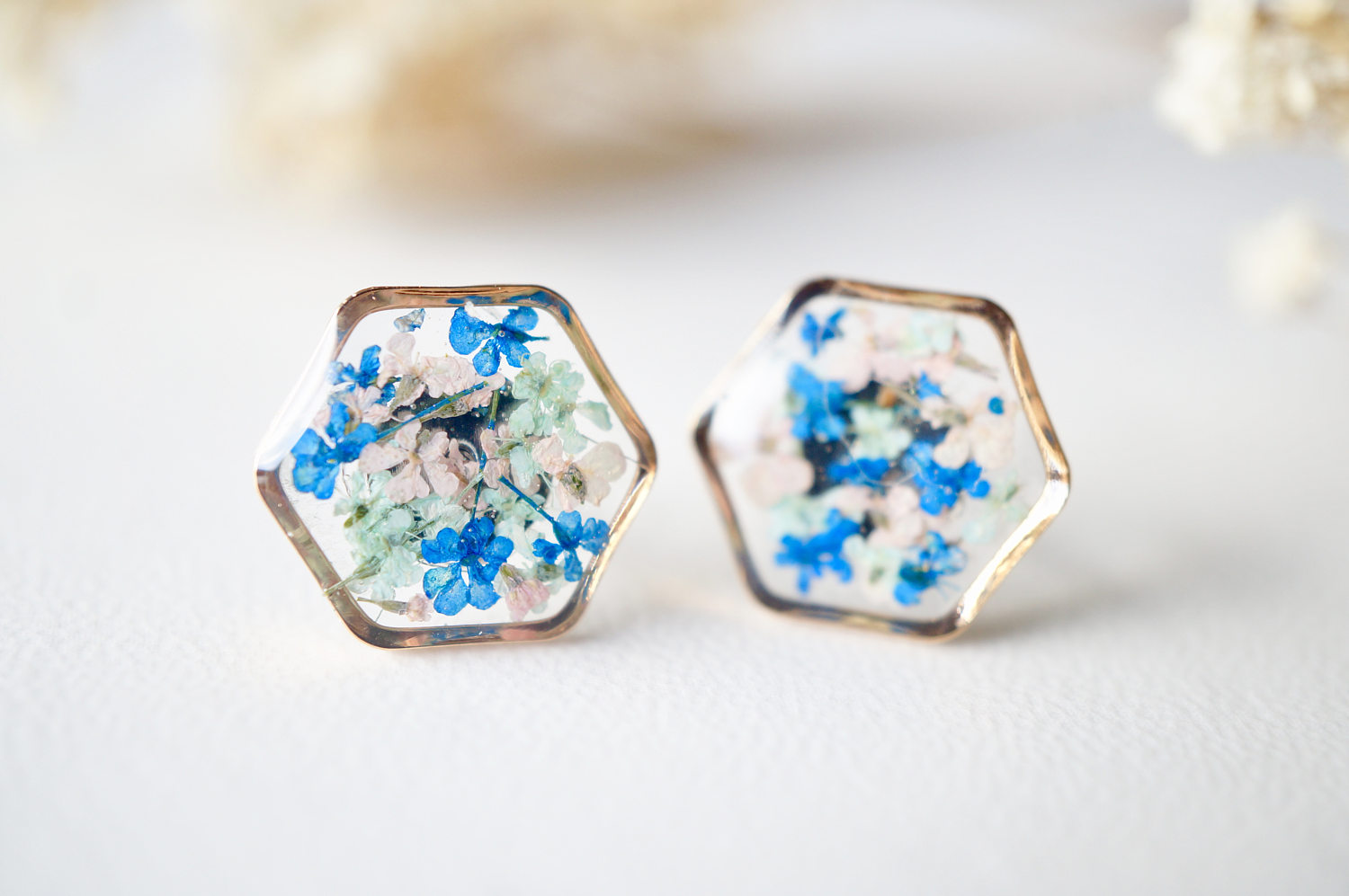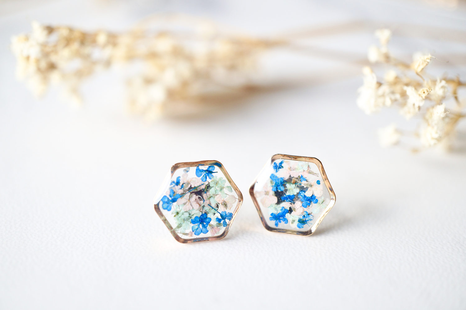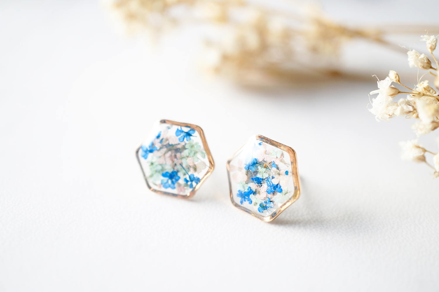 Real Dried Flowers and Resin Stud Earrings, Rose Gold Hexagon in Blue Mint Pink