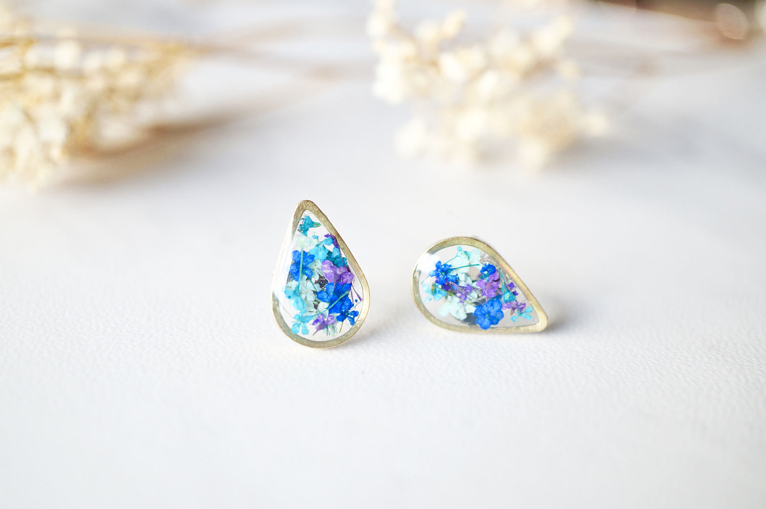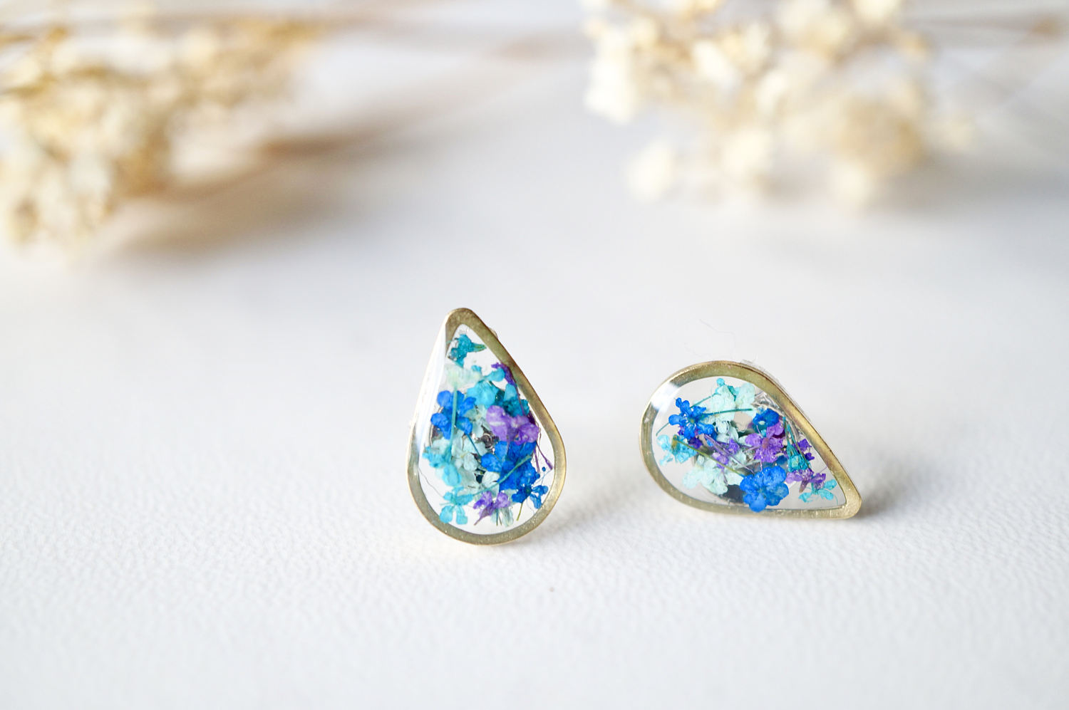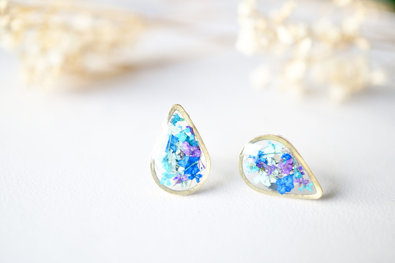 Real Dried Flowers and Resin Stud Earrings, Gold Teardrop in Mint Teal Purple Blue