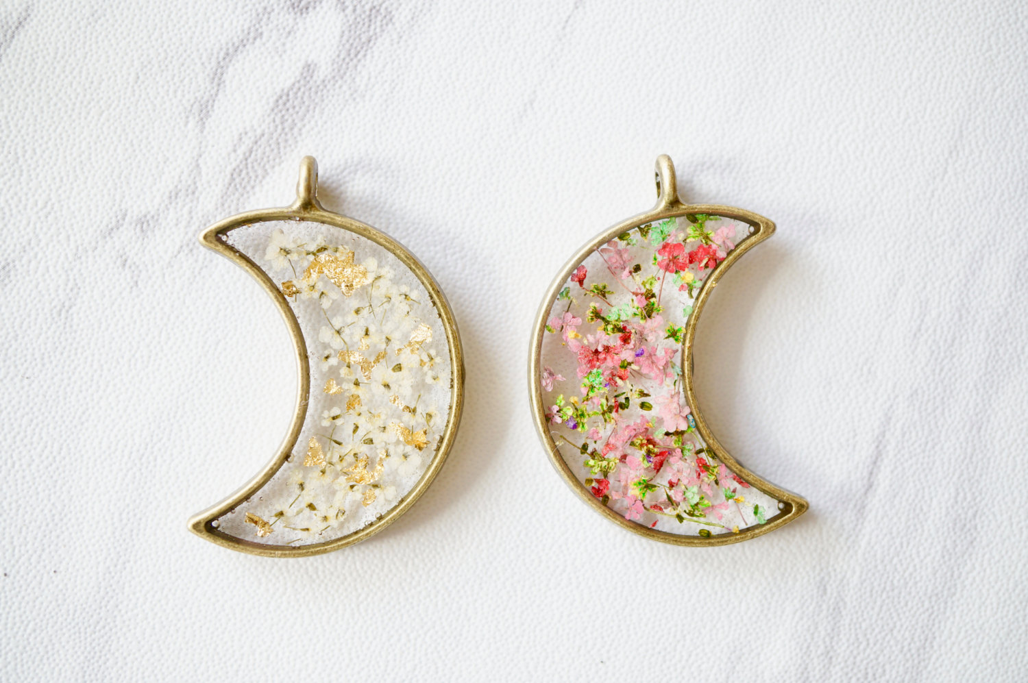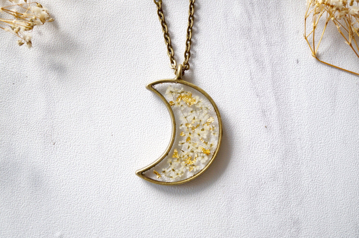 Real Pressed Flower and Resin Moon Necklace in White and Gold Foil Mix