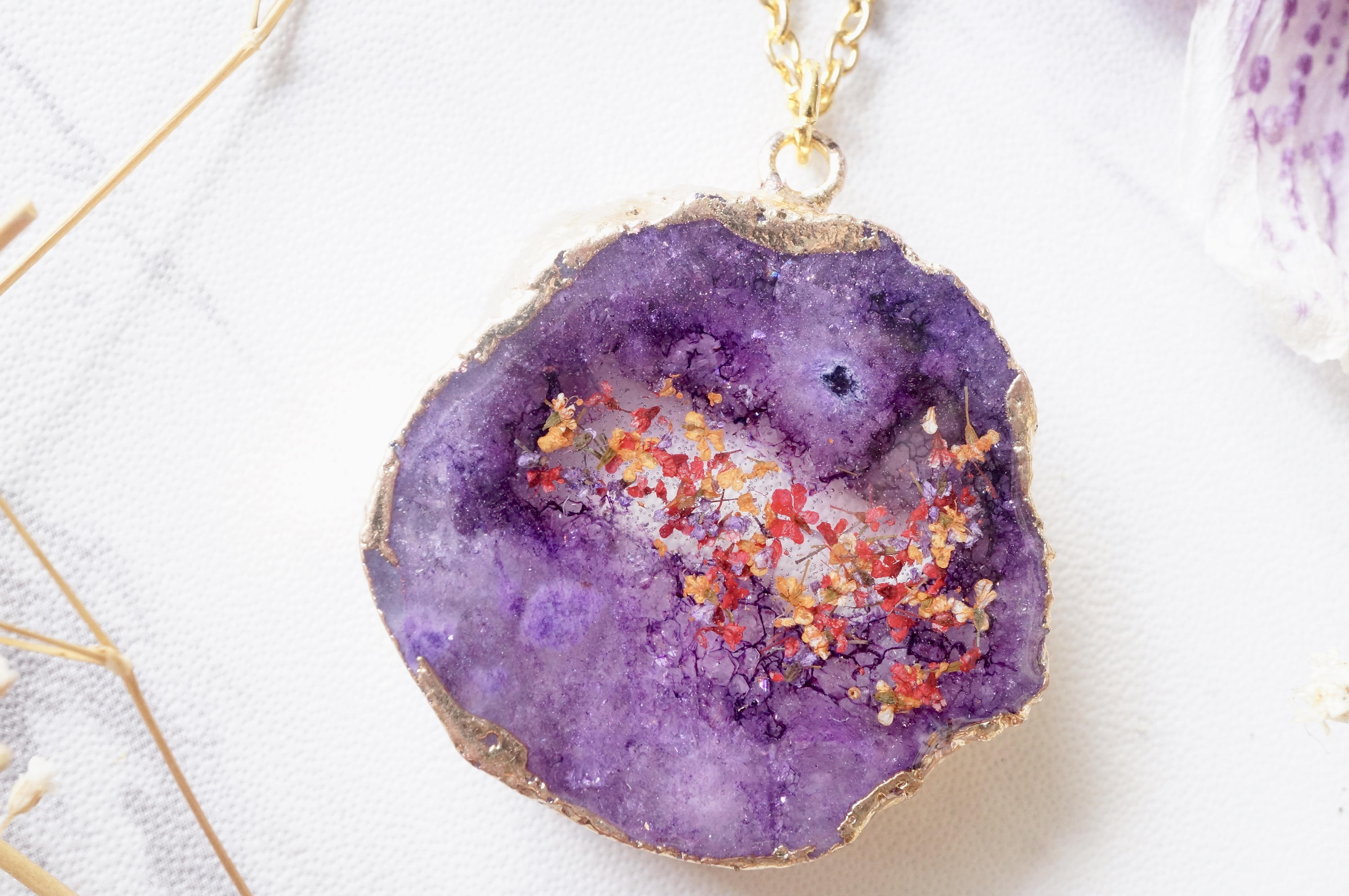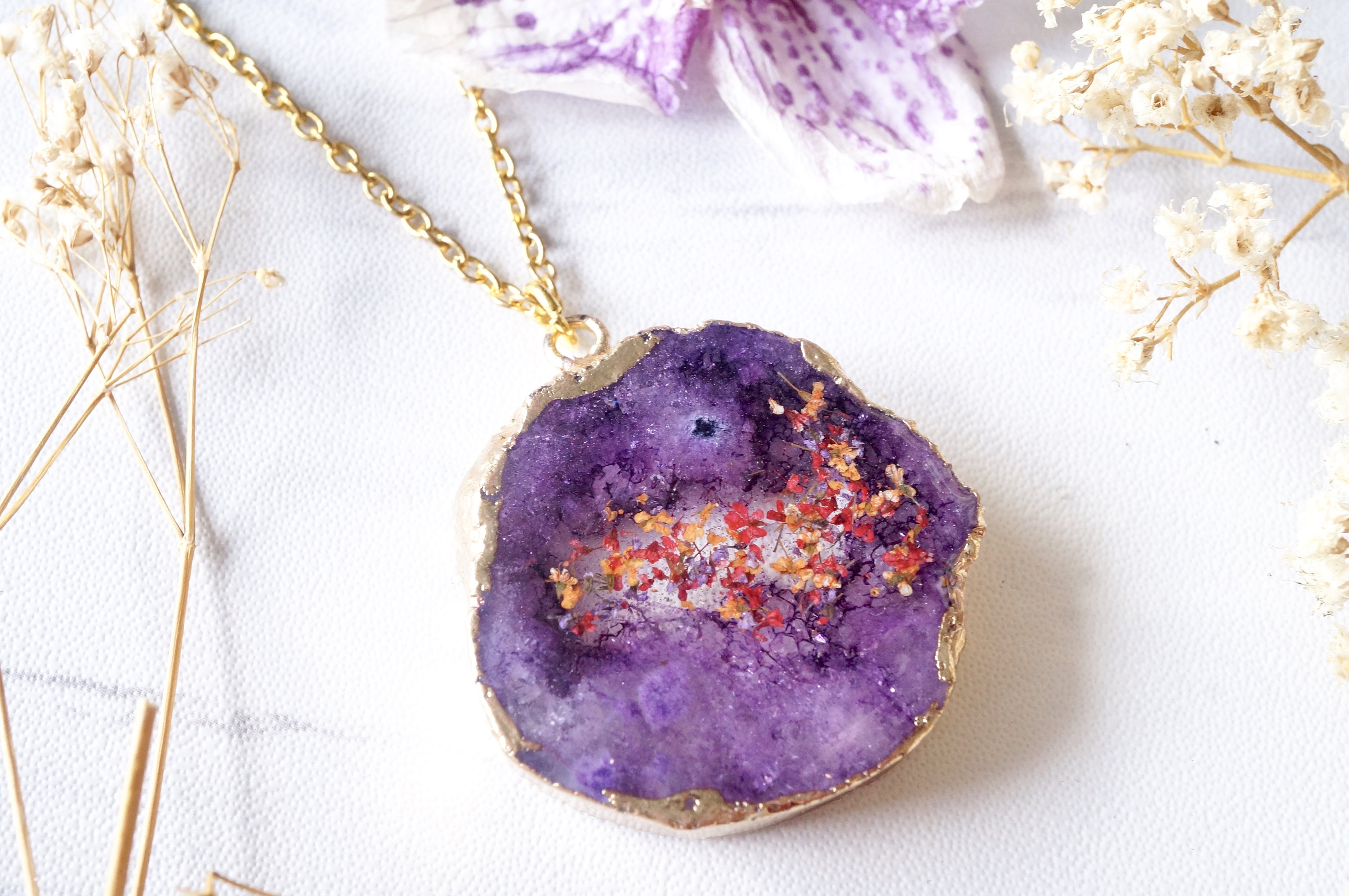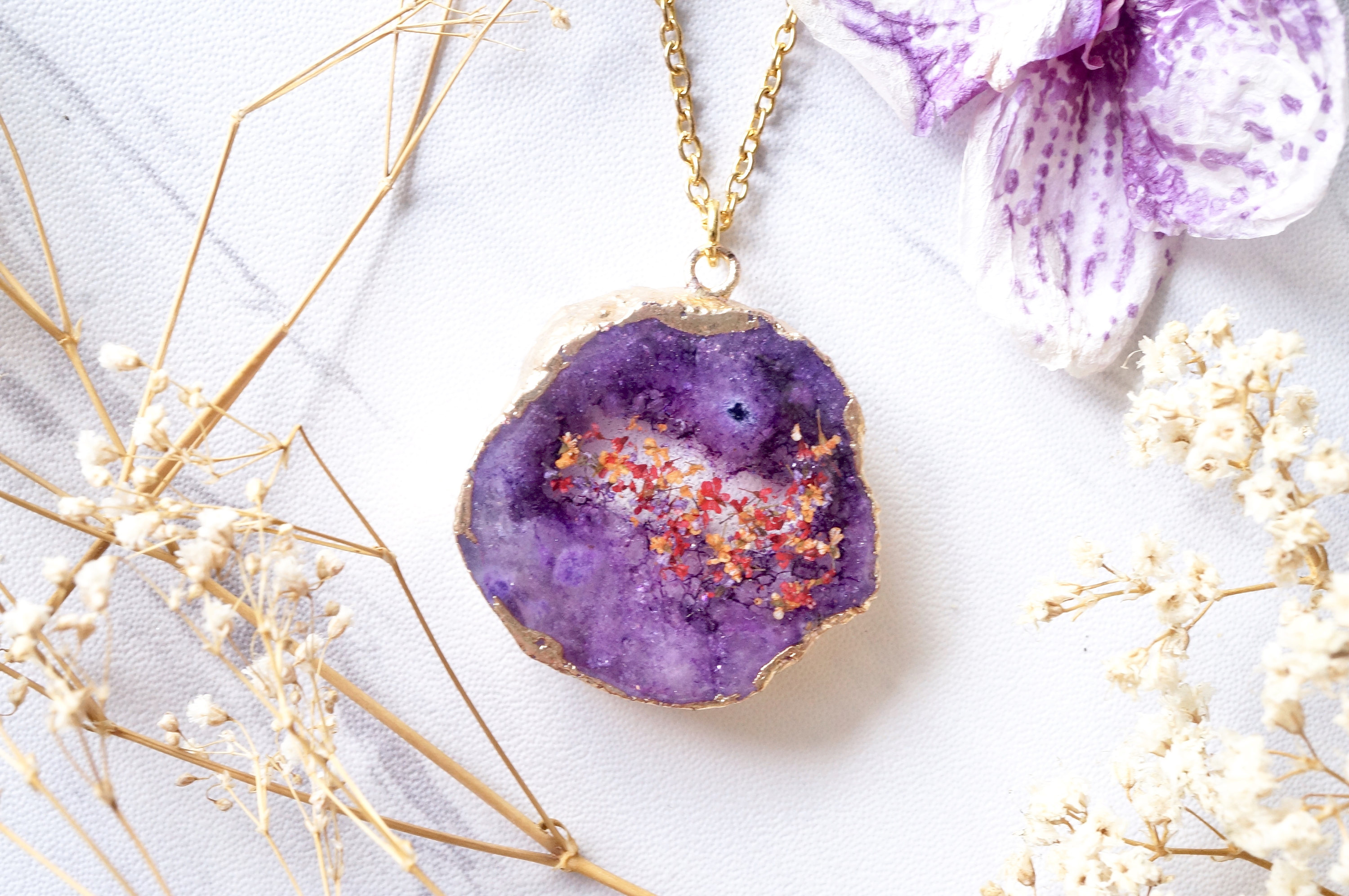 Real Dried Flowers and Resin Necklace, Purple Druzy Geode in Red Orange Purple