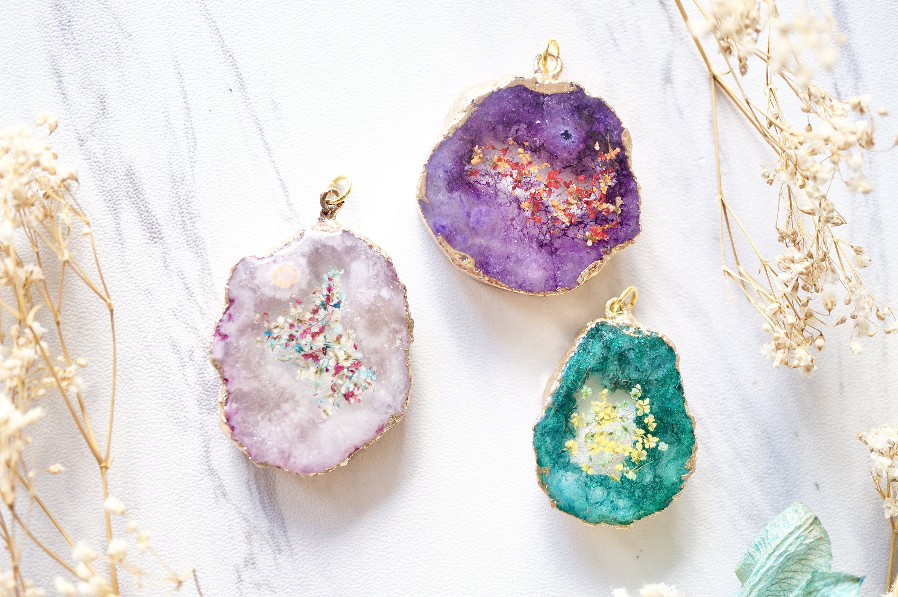 These necklaces are handmade with real pressed flowers encased in resin. Surrounded by a beautiful real druzy geode, this necklace is like wearing a piece of nature. Each piece is one of a kind. Sometimes we will use the same color combination, but no two are exactly alike!