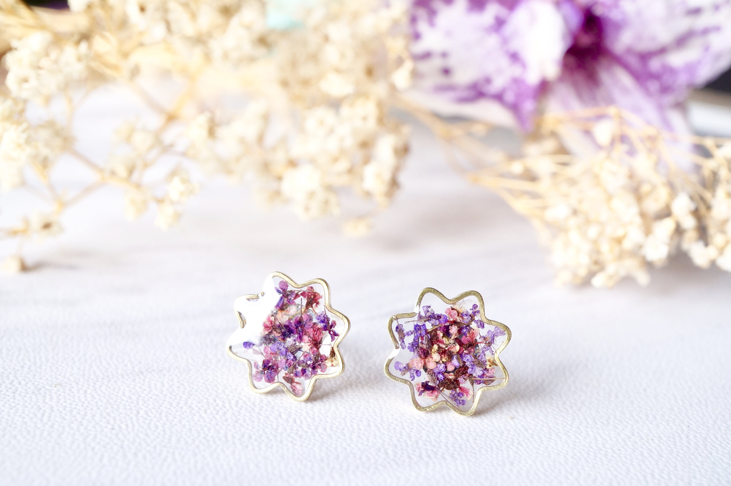 Real Dried Flowers and Resin Flower Stud Earrings in Purples