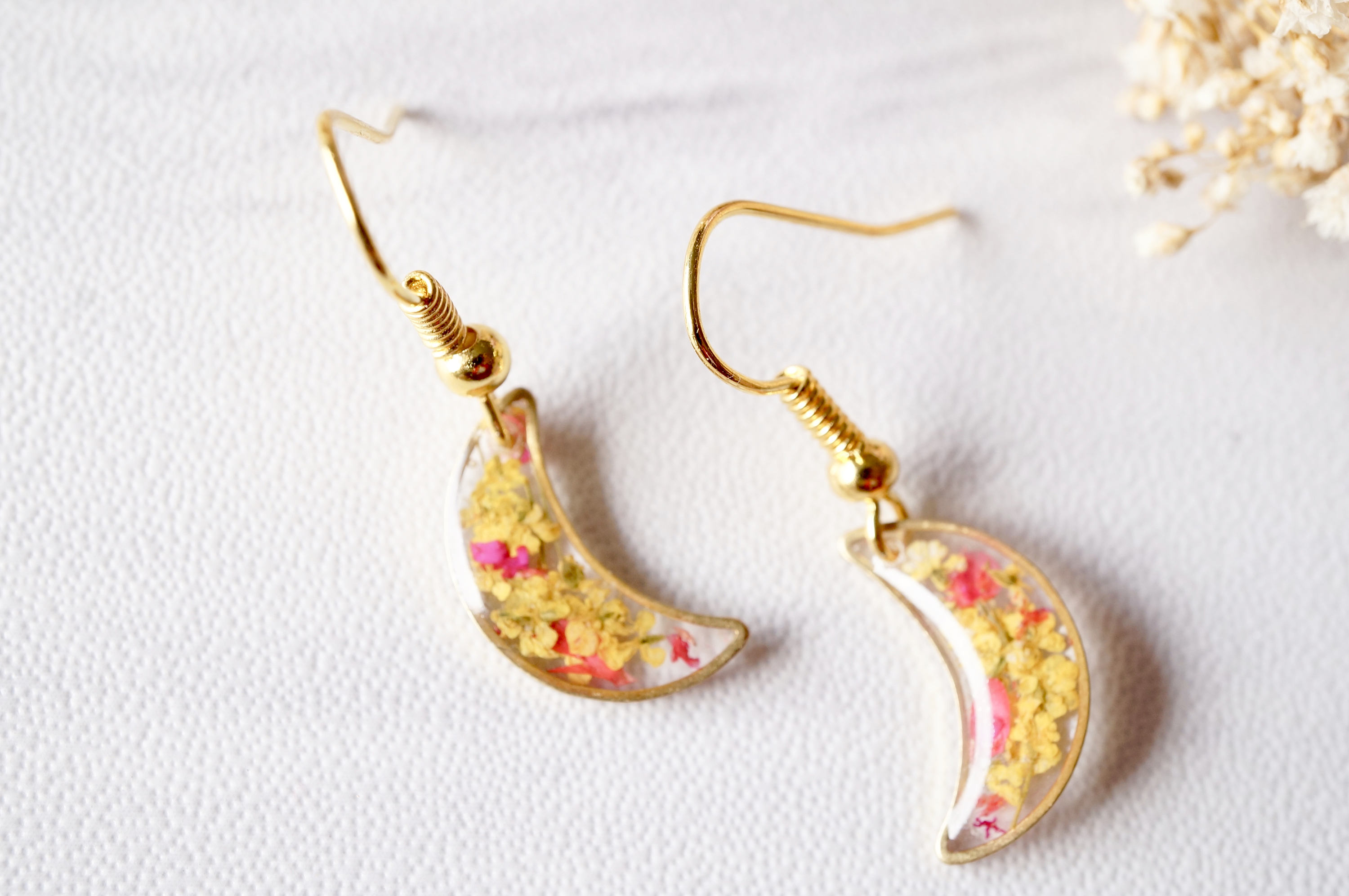Real Dried Flowers and Resin Earrings, Gold Moons in Yellow and Red