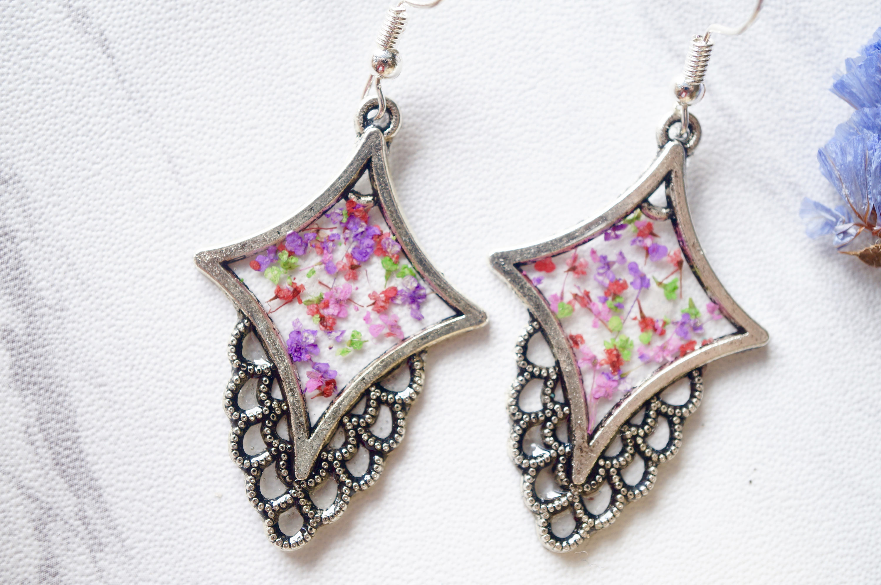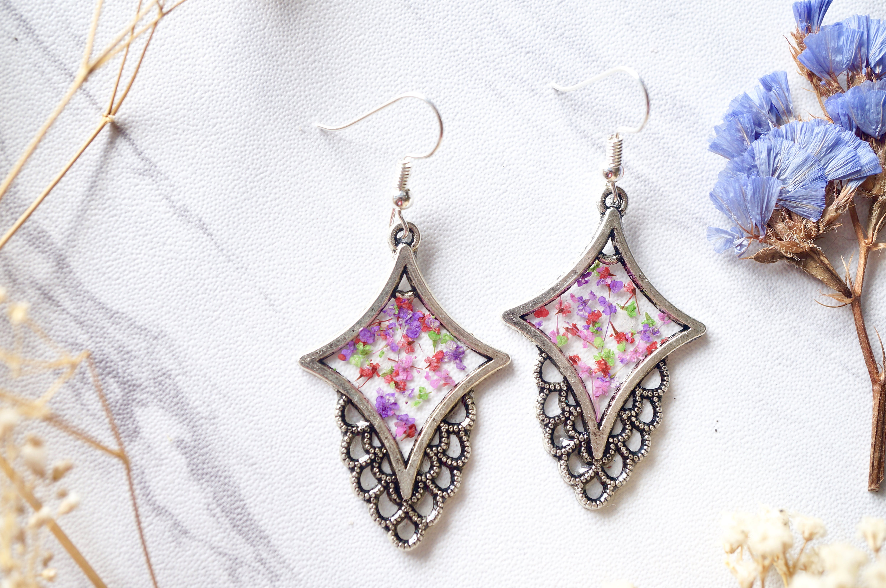 These earrings are handmade with real pressed flowers encased in resin. Surrounded by a beautiful silver frame, these earrings are like wearing a piece of nature. Ear hooks are nickel free zinc alloy, great for sensitive ears.