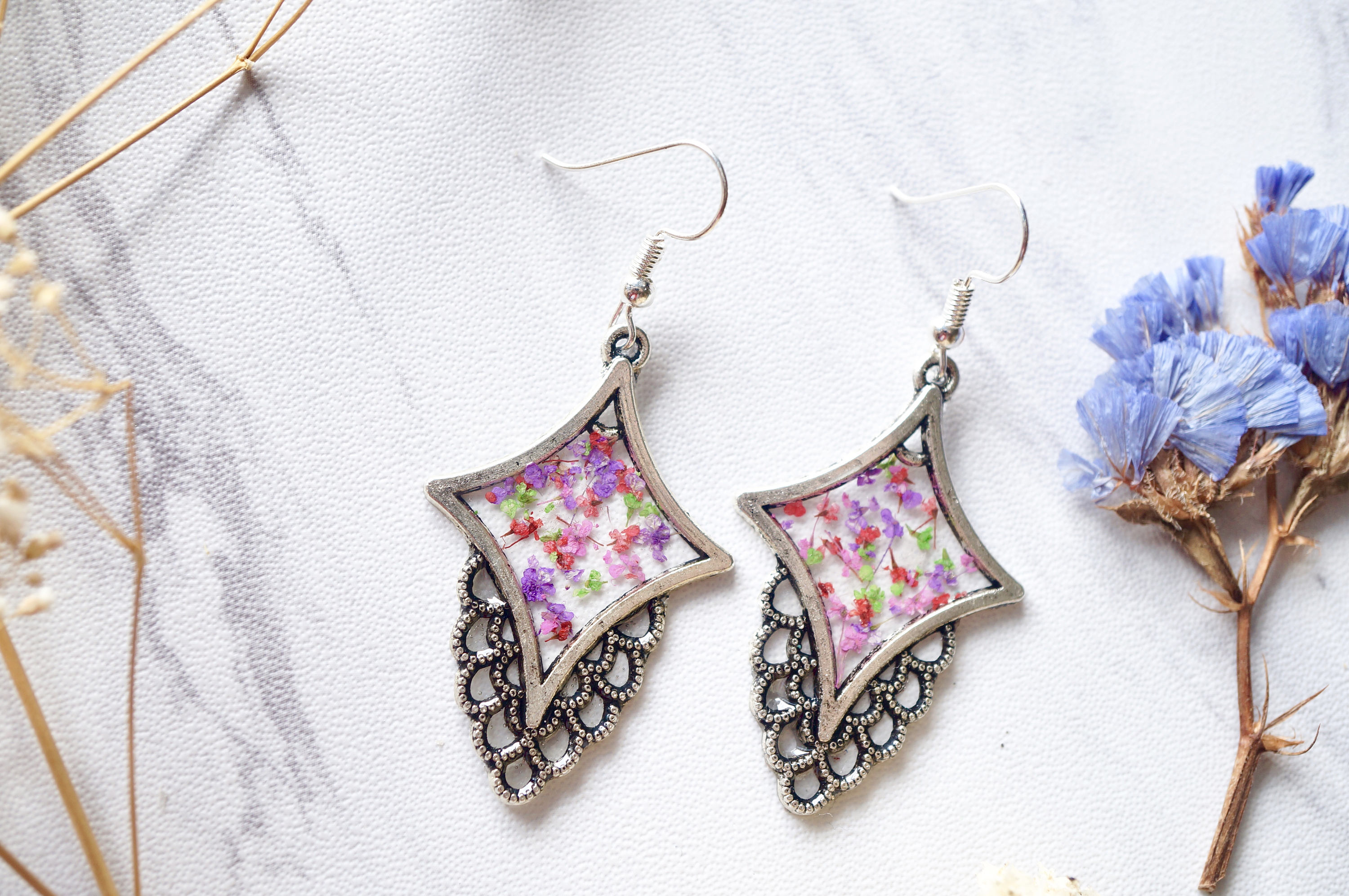 Real Dried Flowers and Resin Earrings in Pink Purple Red Green
