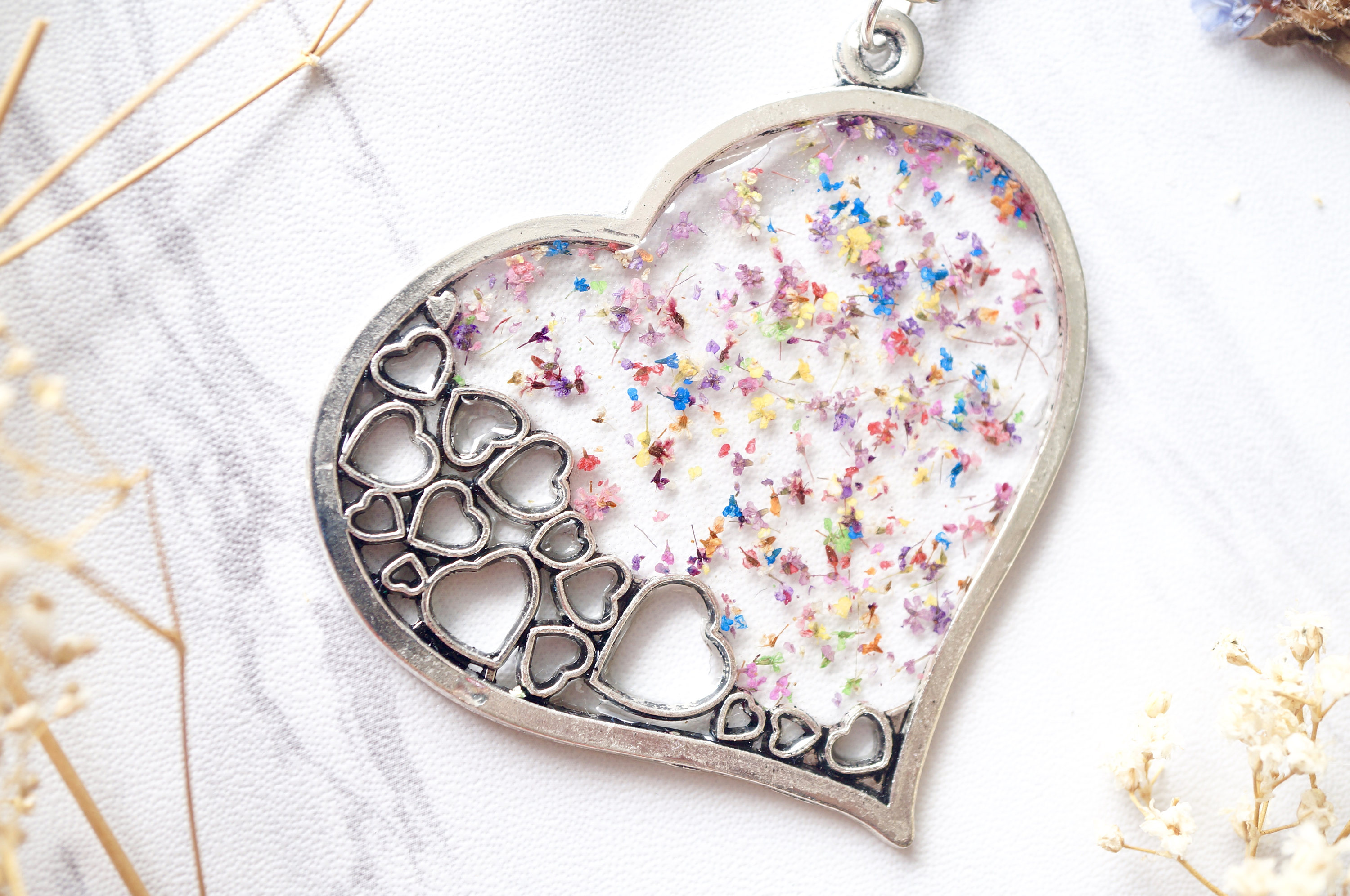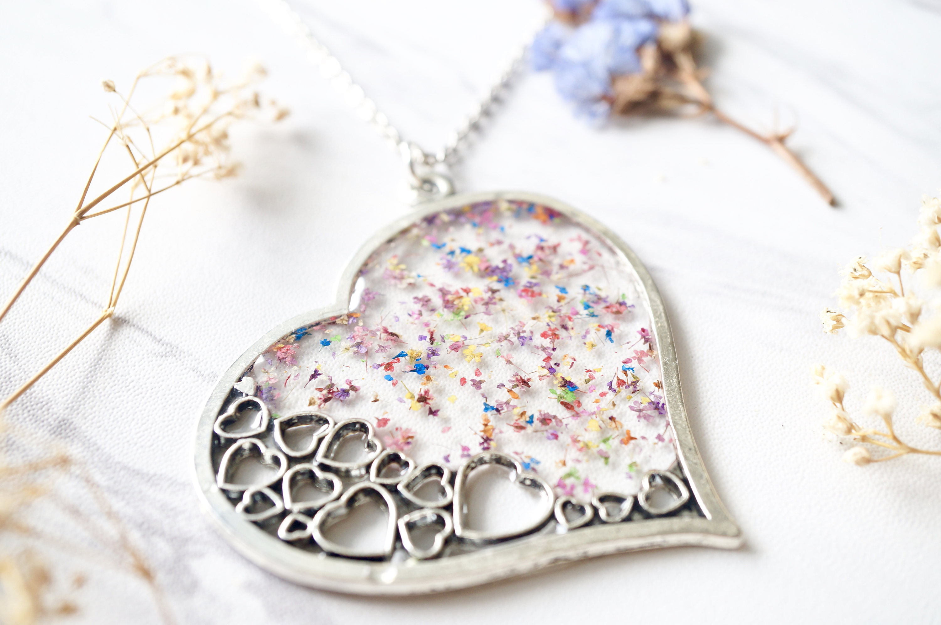 Real Dried Flowers in Resin Necklace, Big Silver Heart in Party Mix