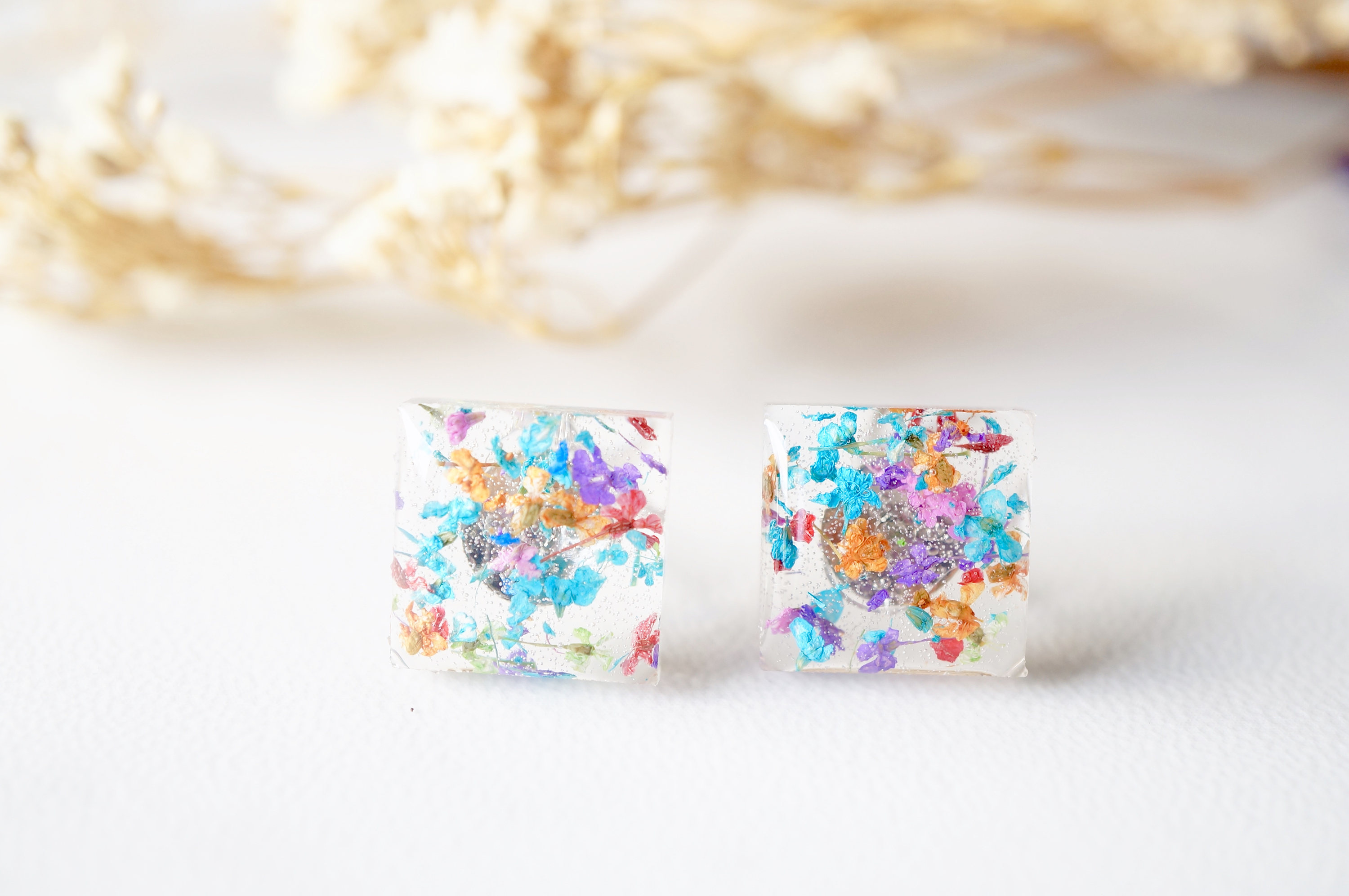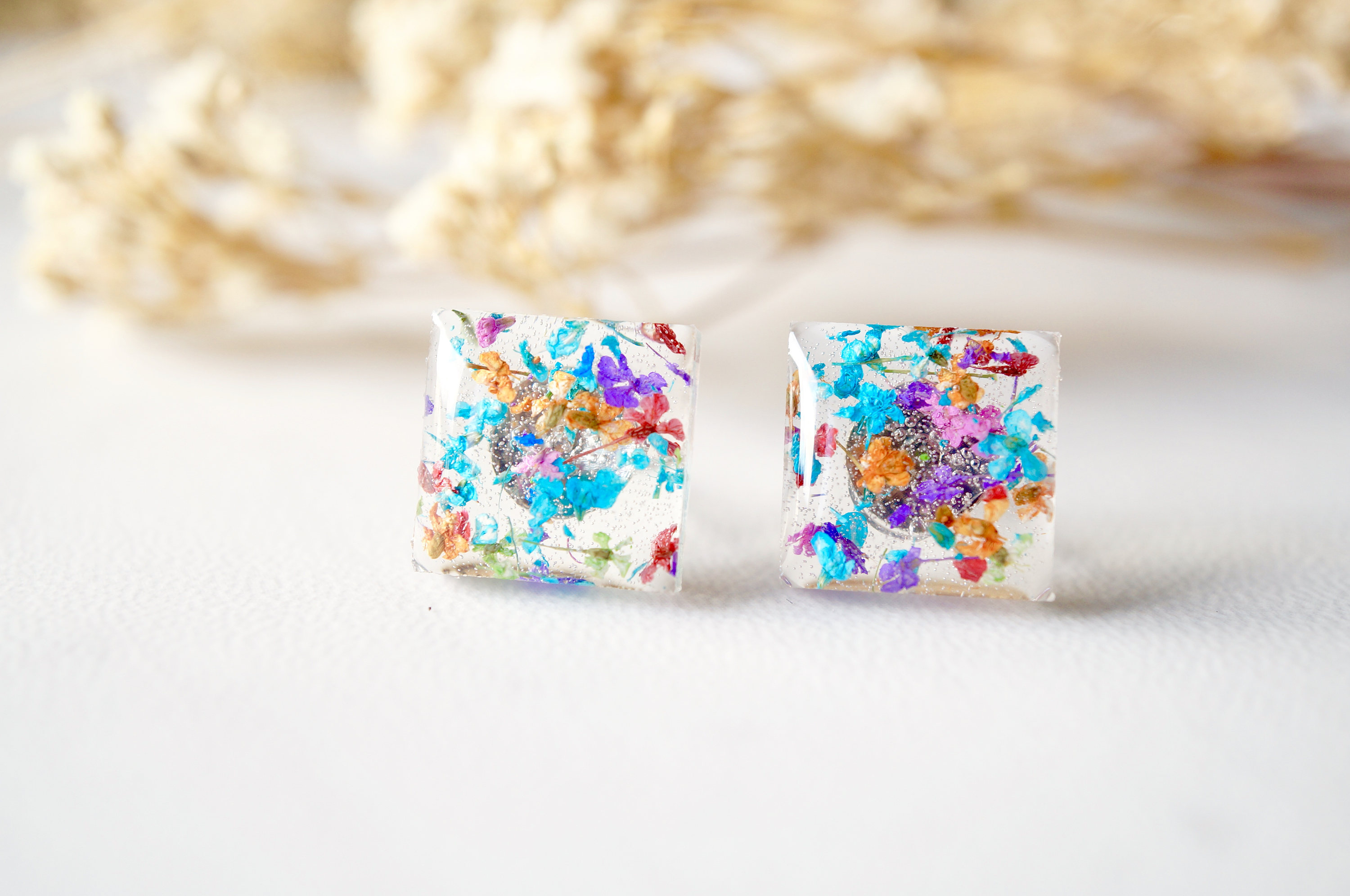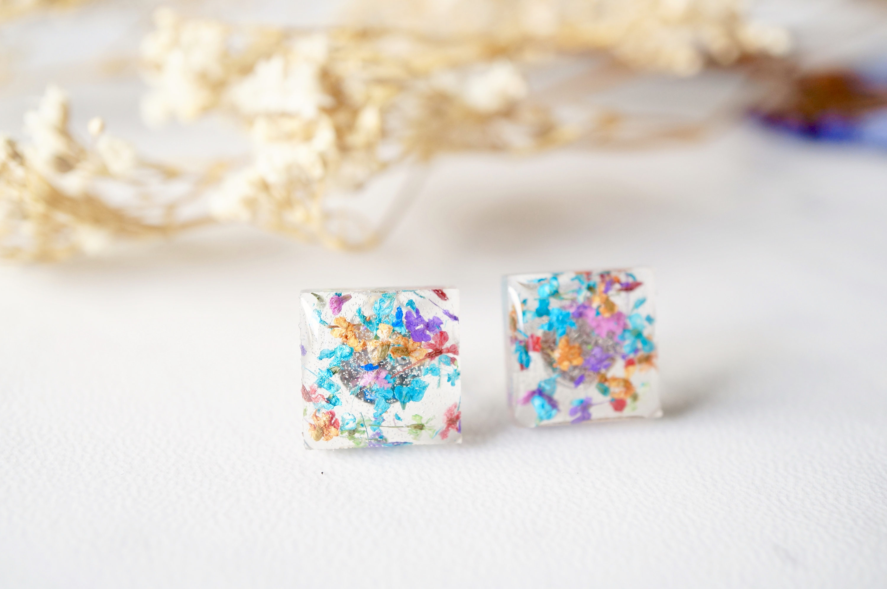 Real Dried Flowers and Resin Square Stud Earrings in Party Mix