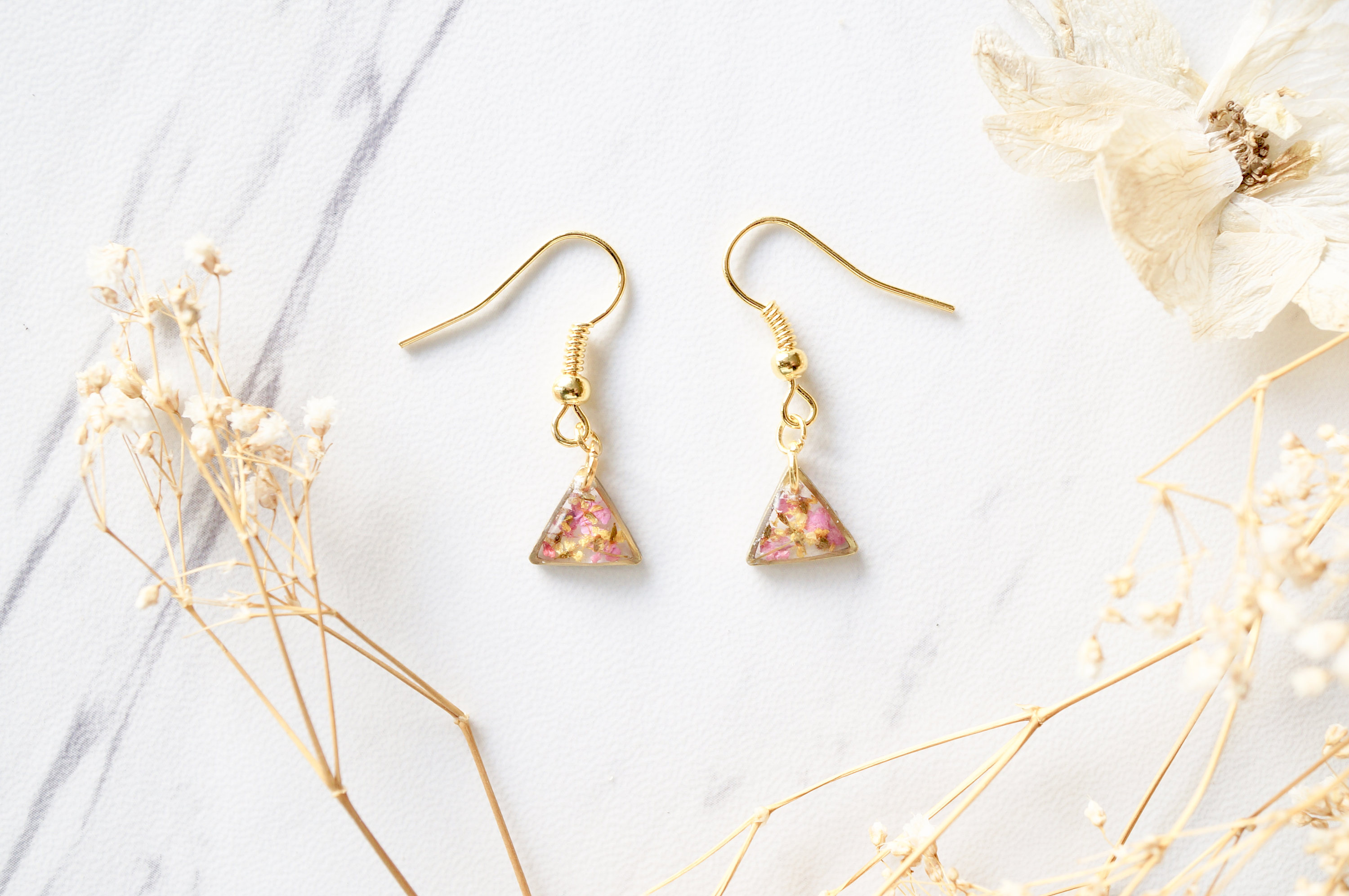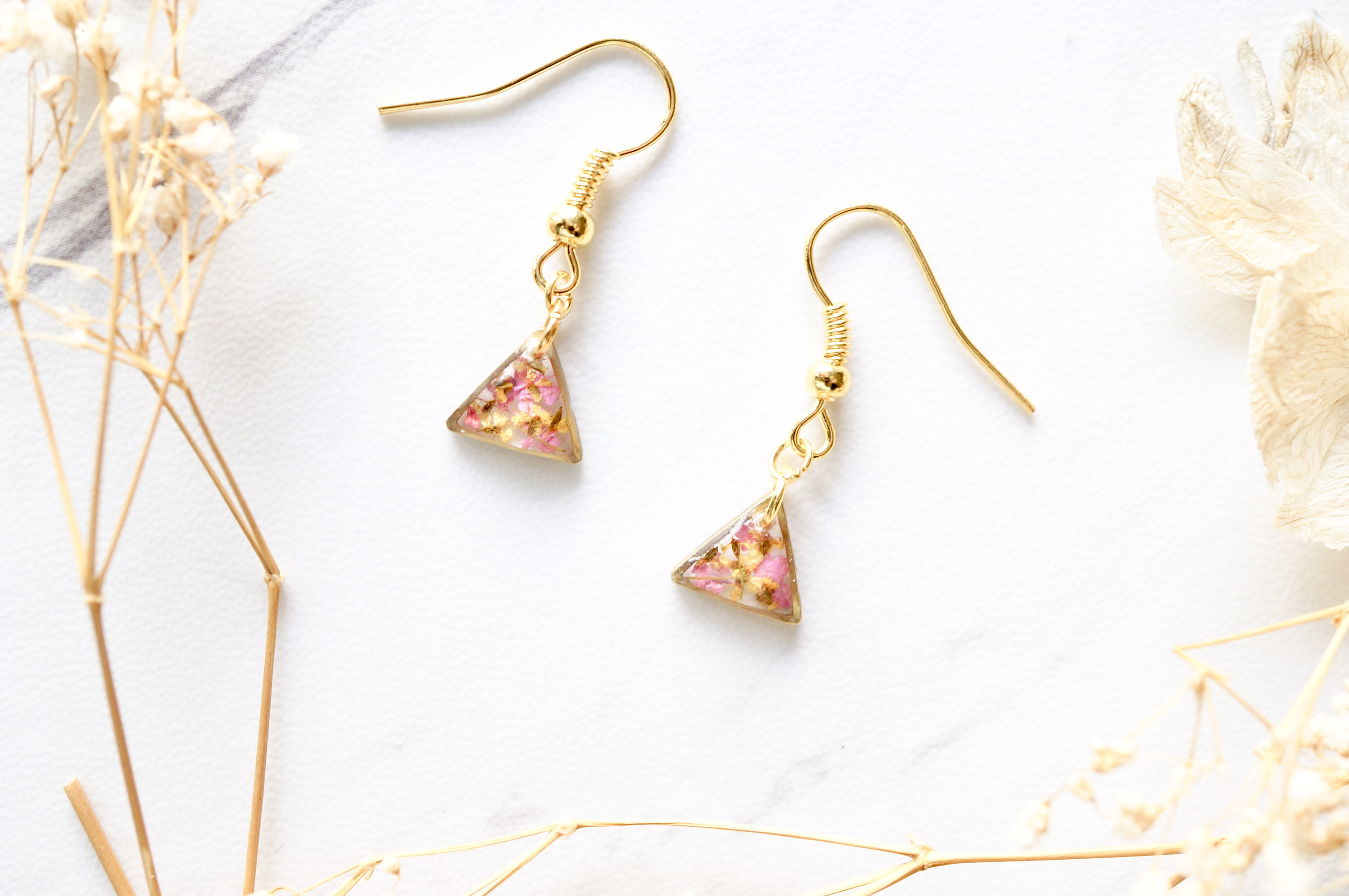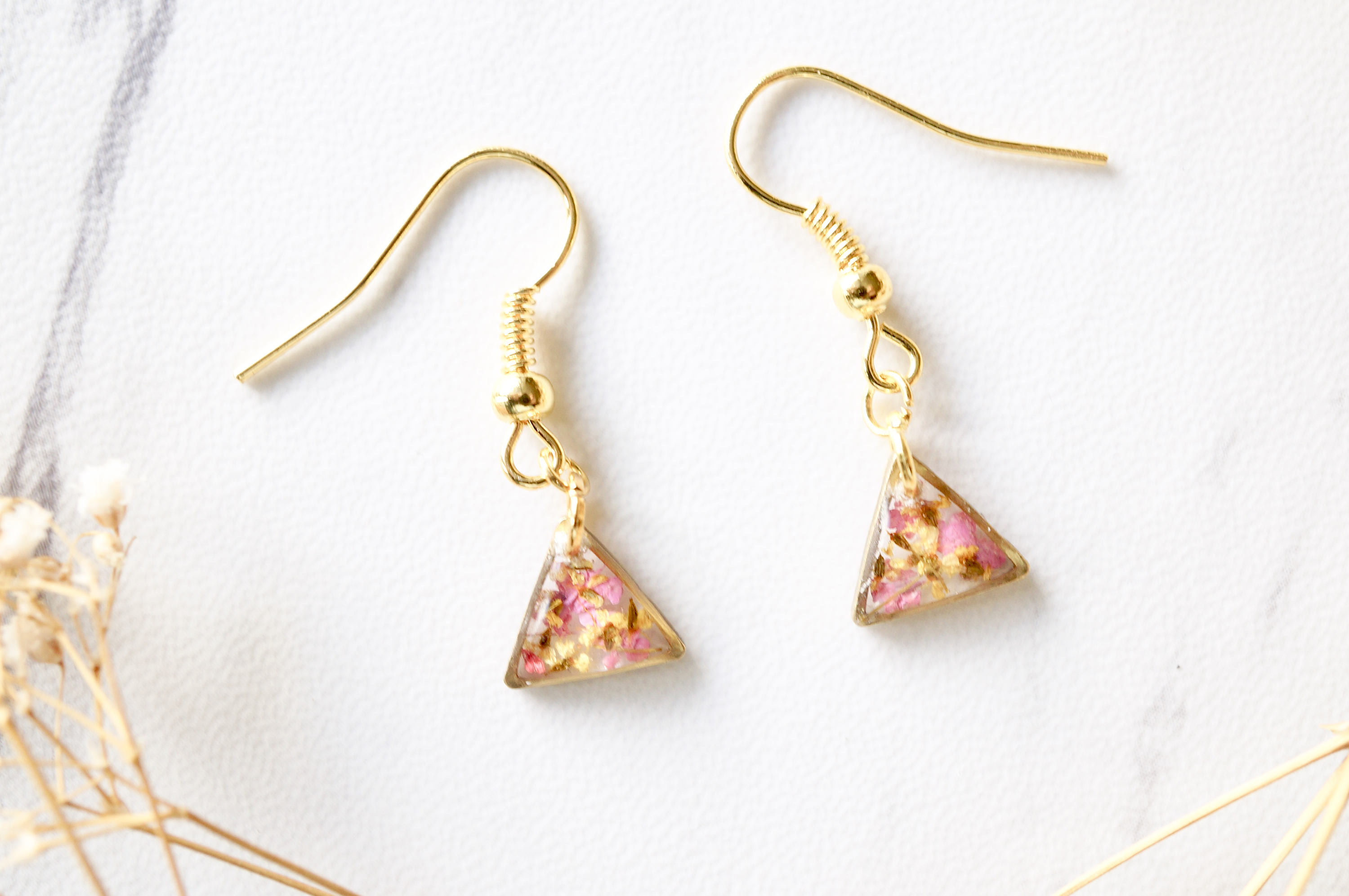 Real Dried Flowers and Resin Earrings, Gold Triangle Drops in Pink and Yellow