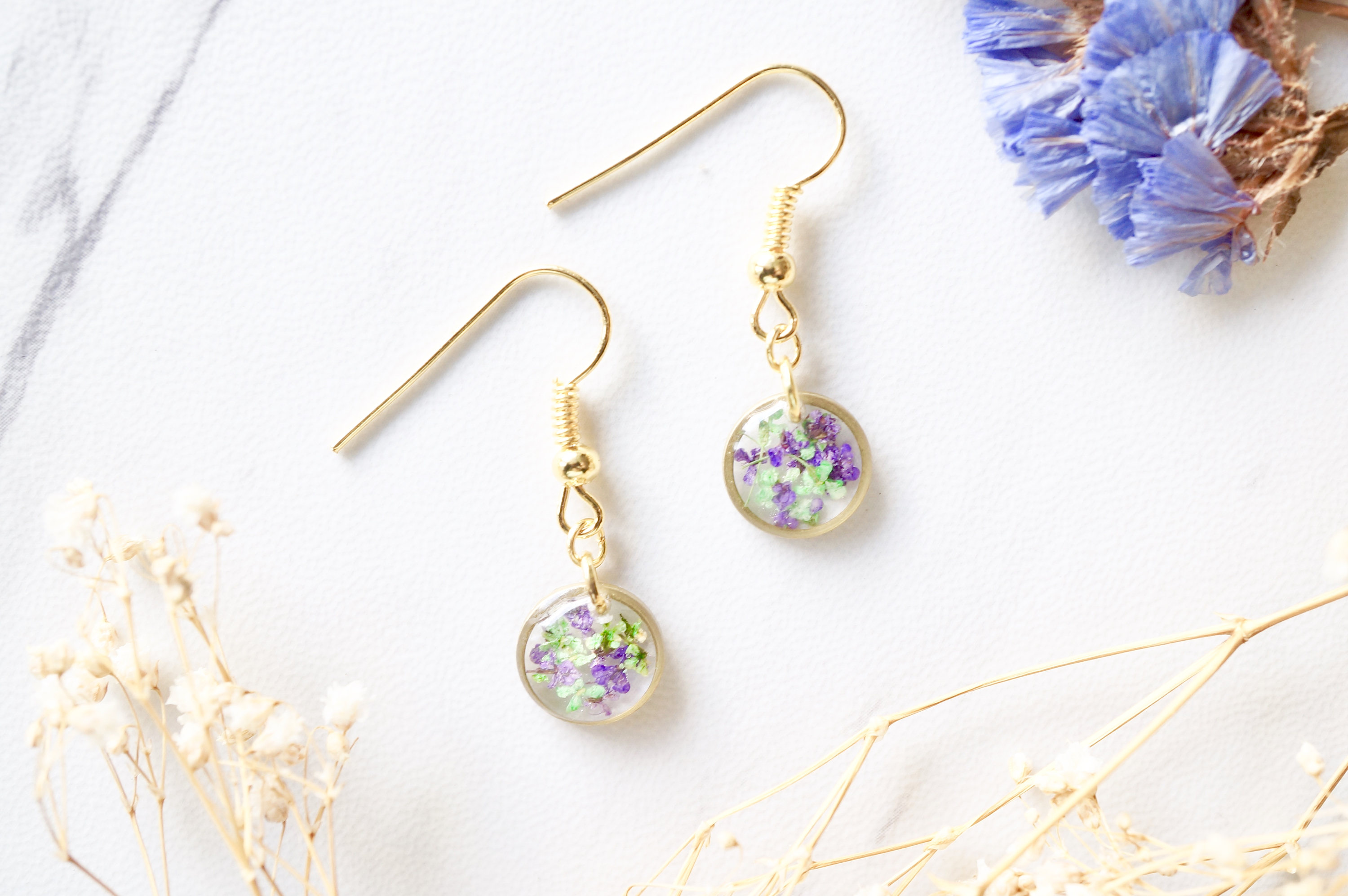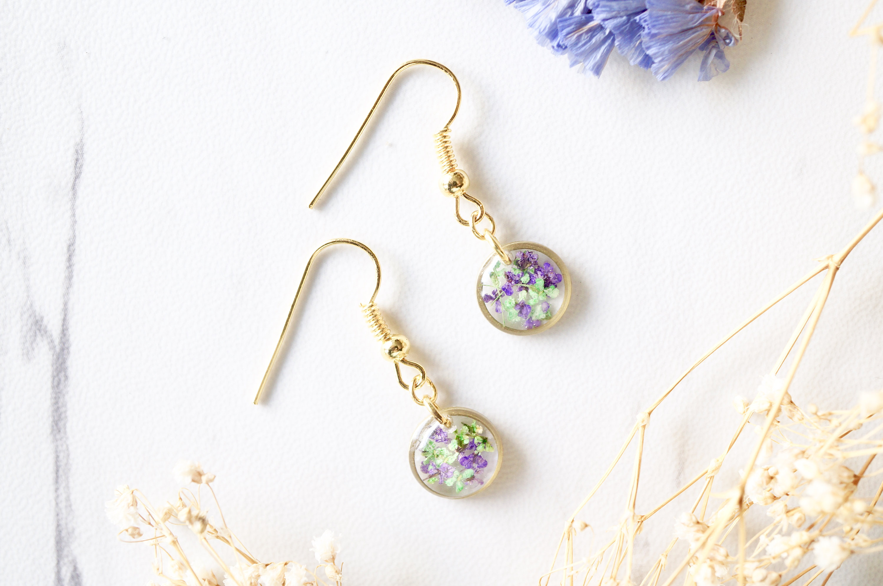 Real Dried Flowers and Resin Earrings, Gold Circle Drops in Purple Green
