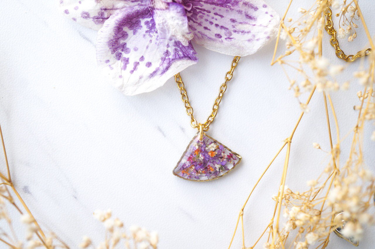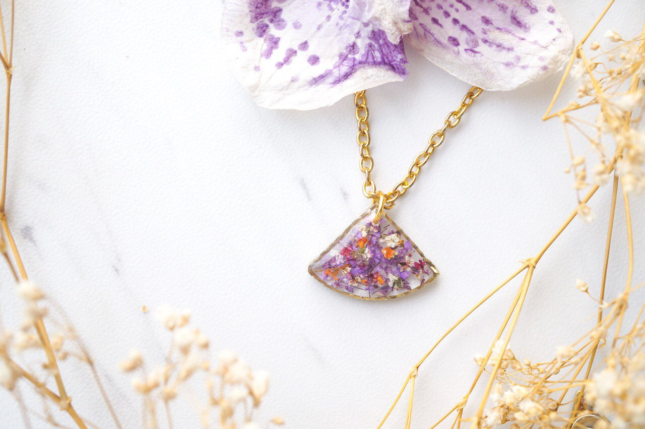 Real Dried Flowers and Resin Necklace, Small Gold Fan in Purples
