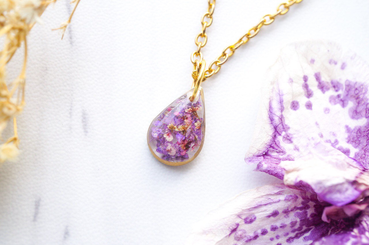 Real Dried Flowers and Resin Necklace, Small Gold Teardrop in Purples