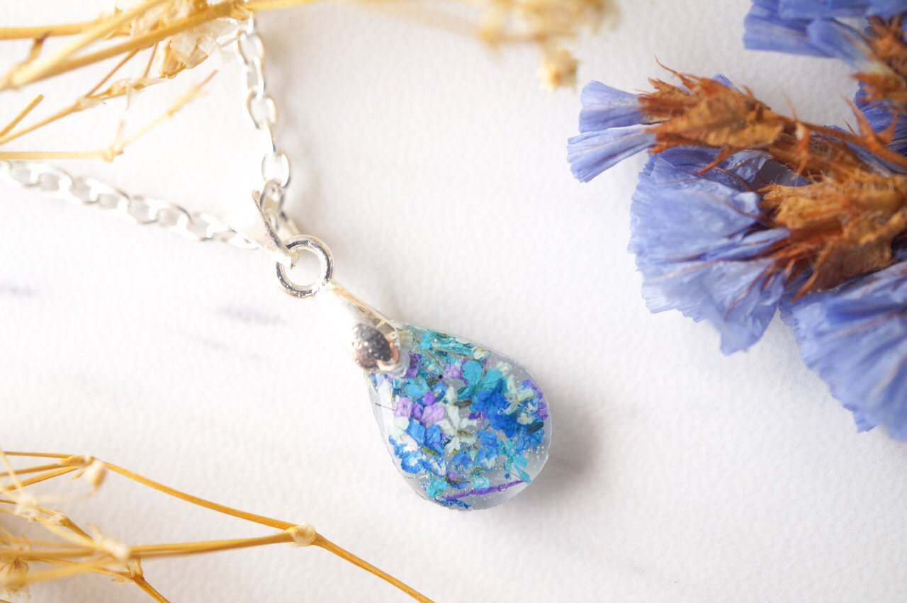Real Dried Flowers in Teardrop Resin Necklace in Blue Mint Teal Purple