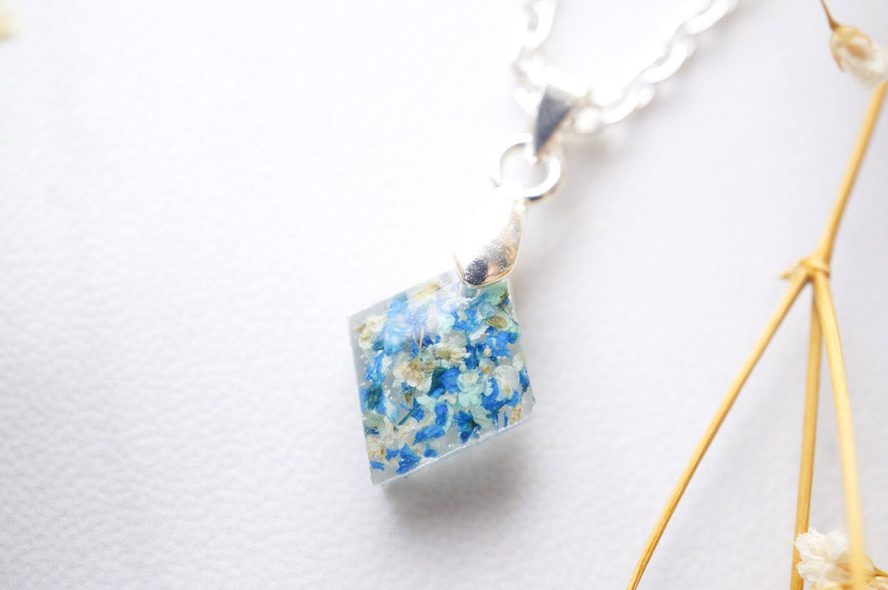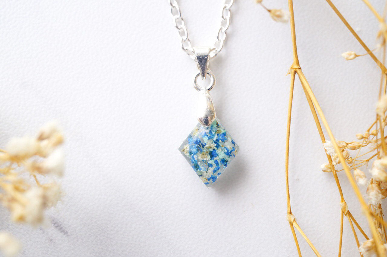 Real Dried Flowers in Diamond Resin Necklace in Blues