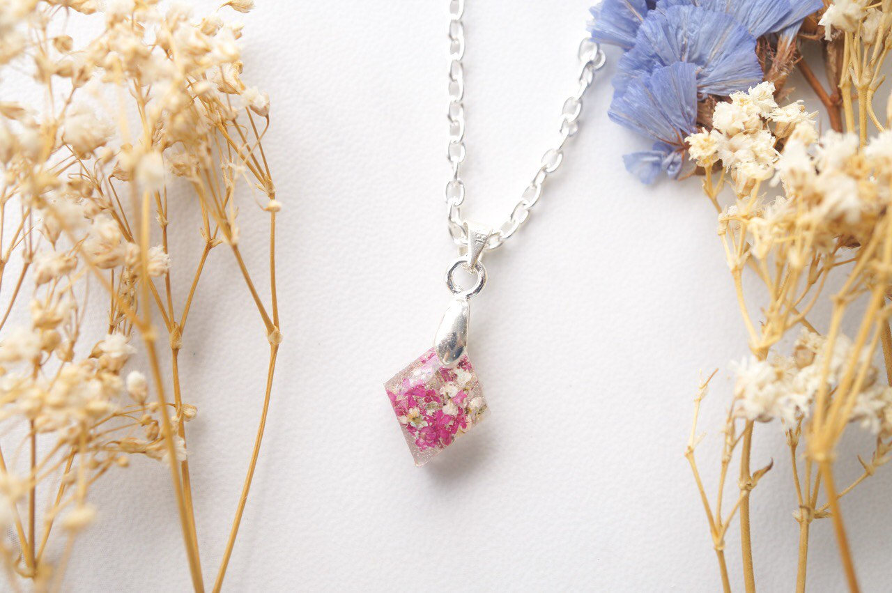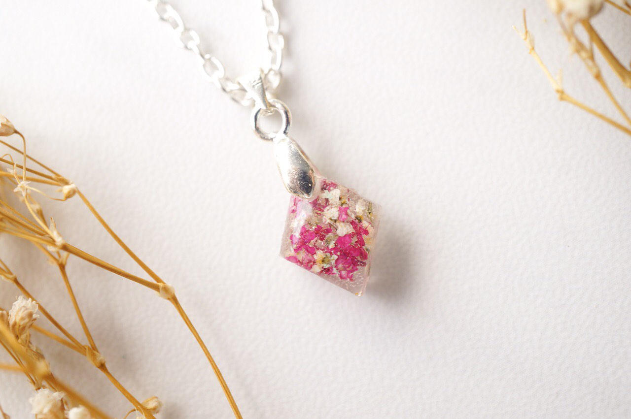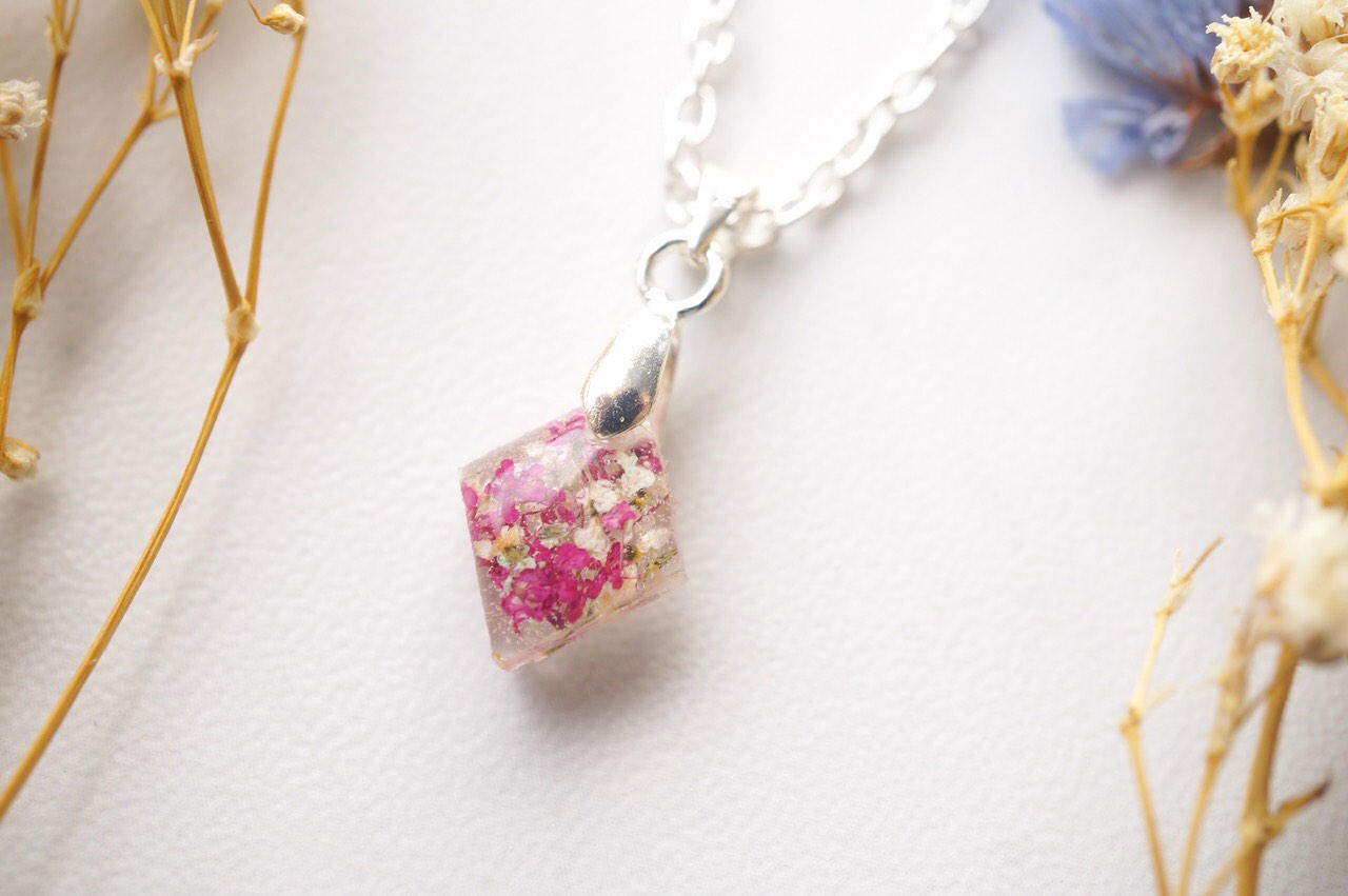 Real Dried Flowers in Diamond Resin Necklace in Pinks and White