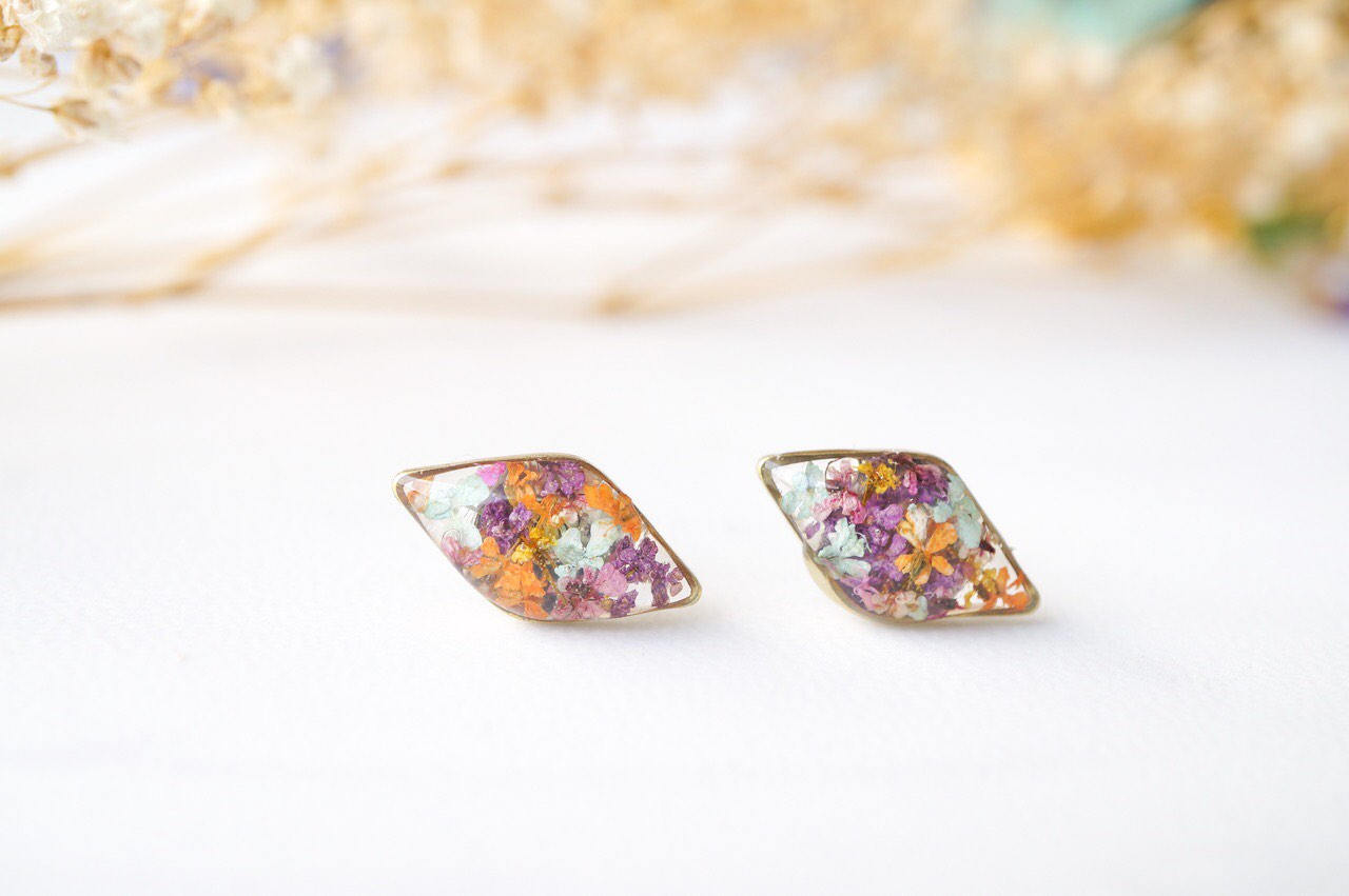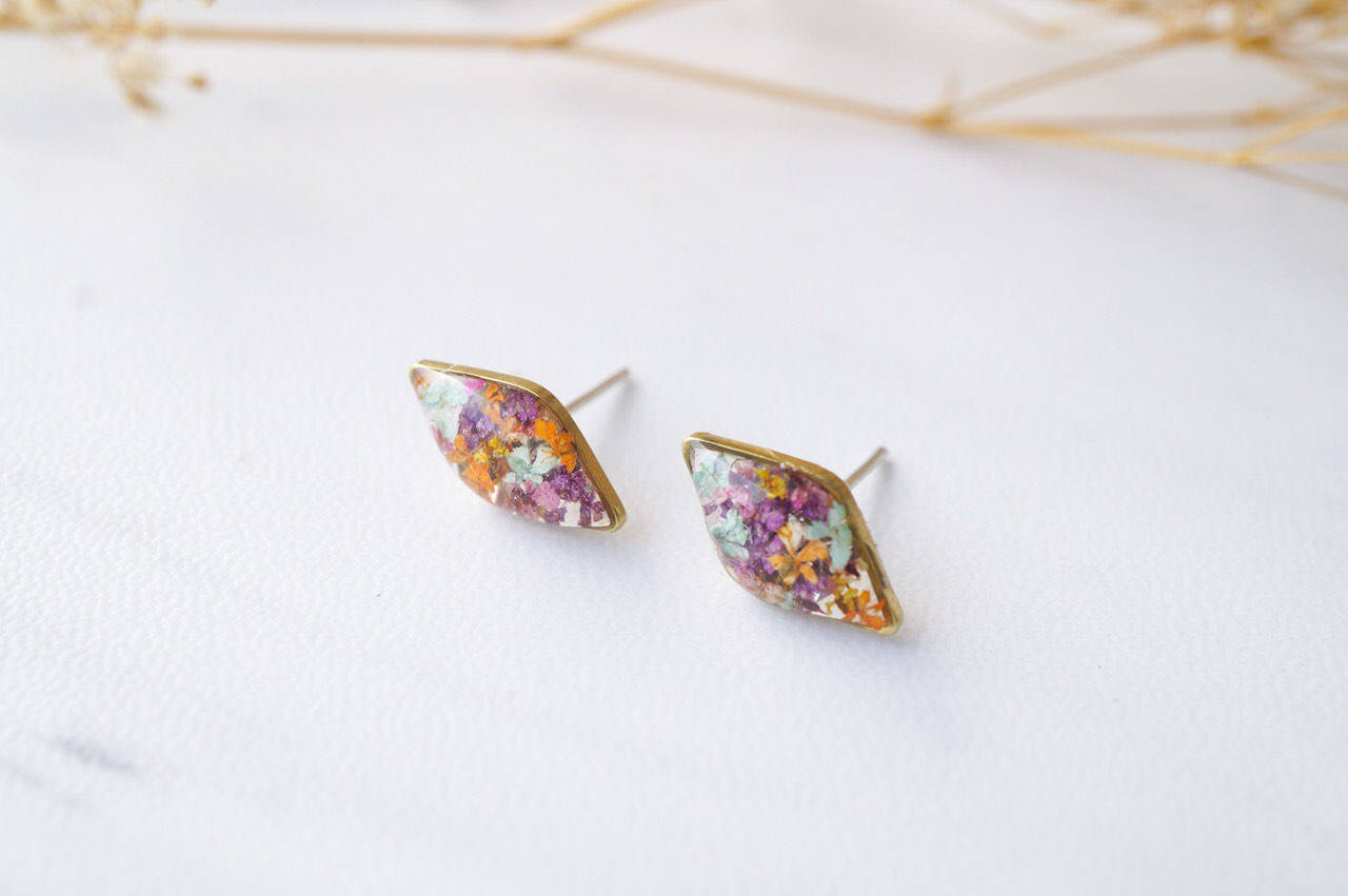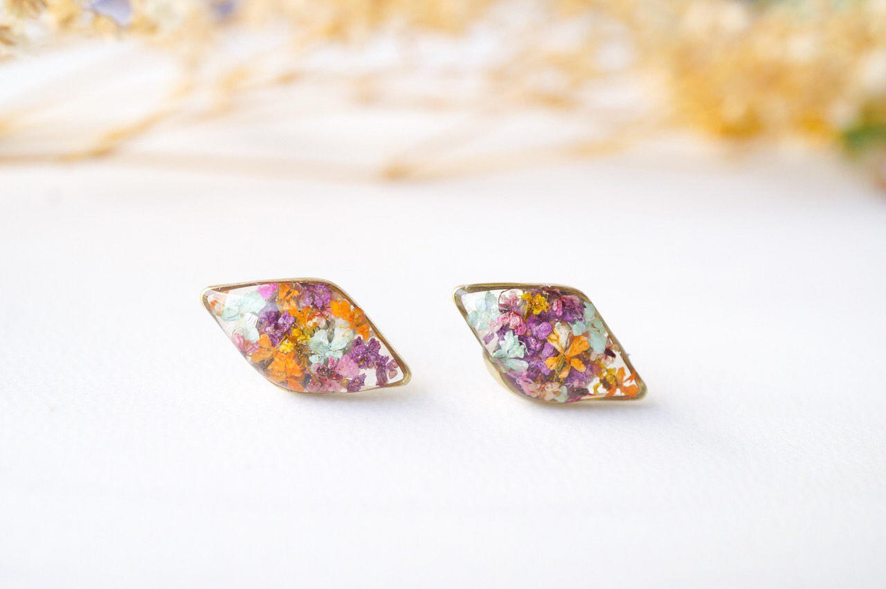 Real Dried Flowers and Resin Diamond Stud Earrings in Purple Pink Orange Mint