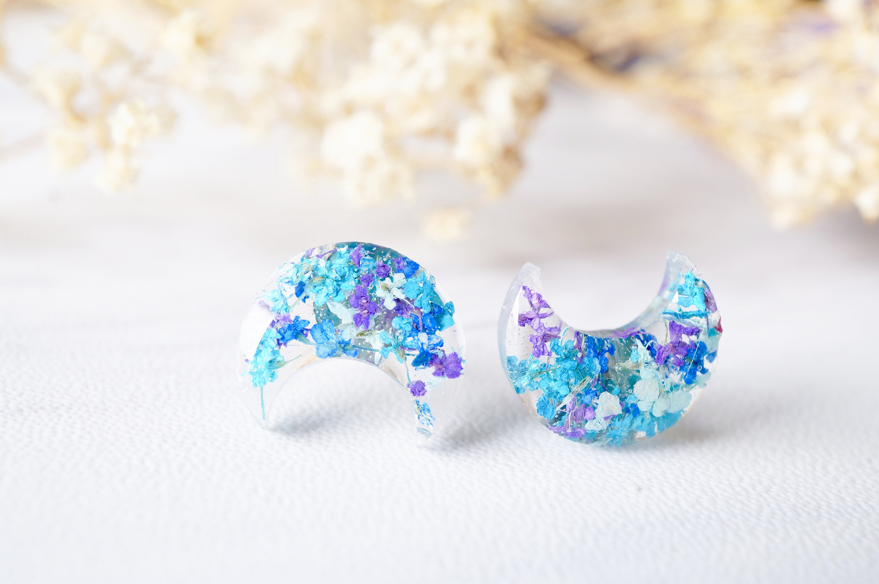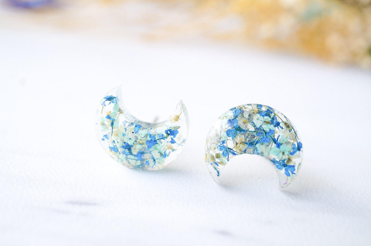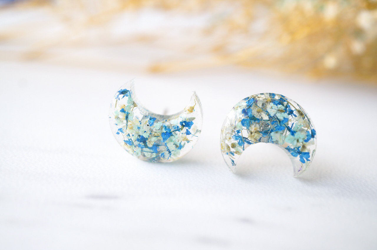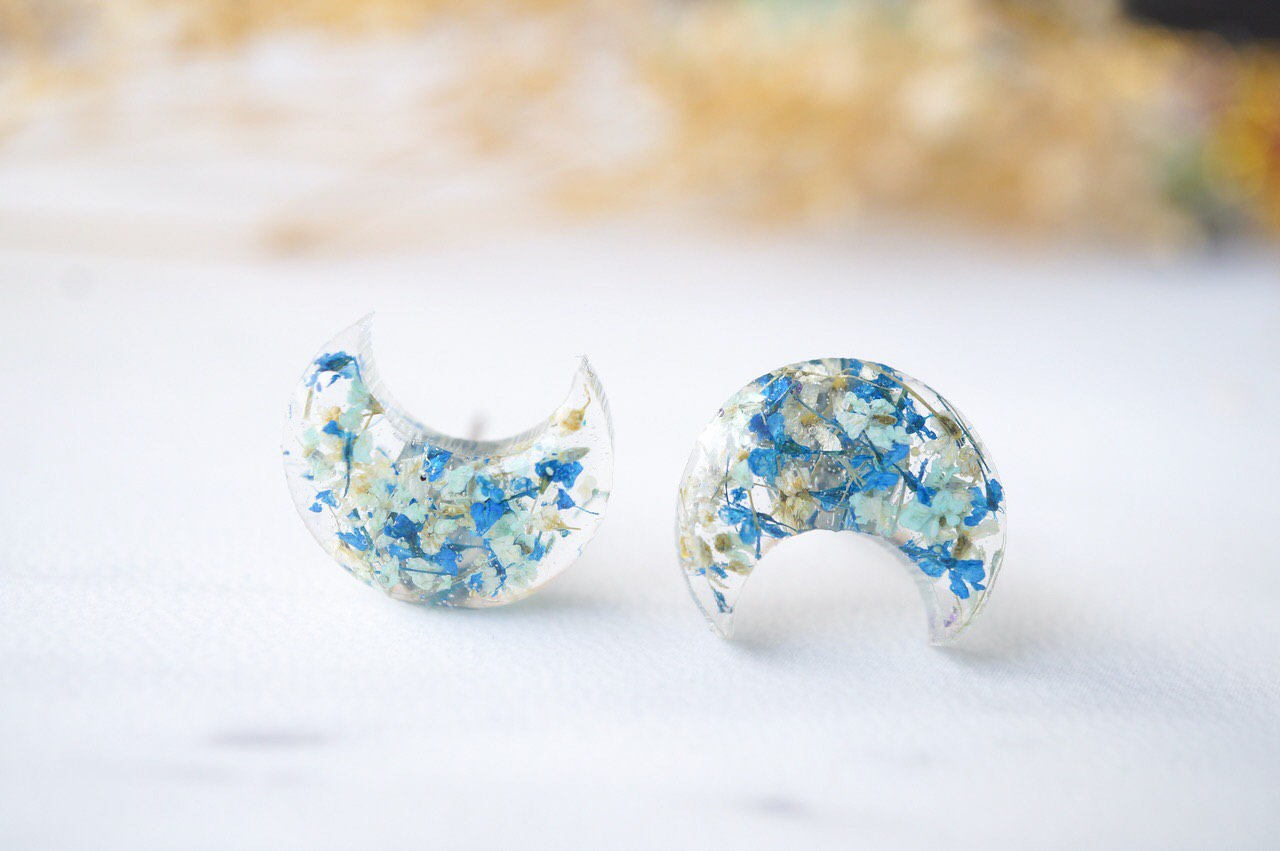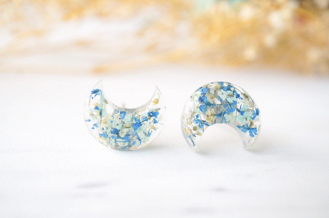 Real Dried Flowers and Resin Moon Stud Earrings in Mint Blue White