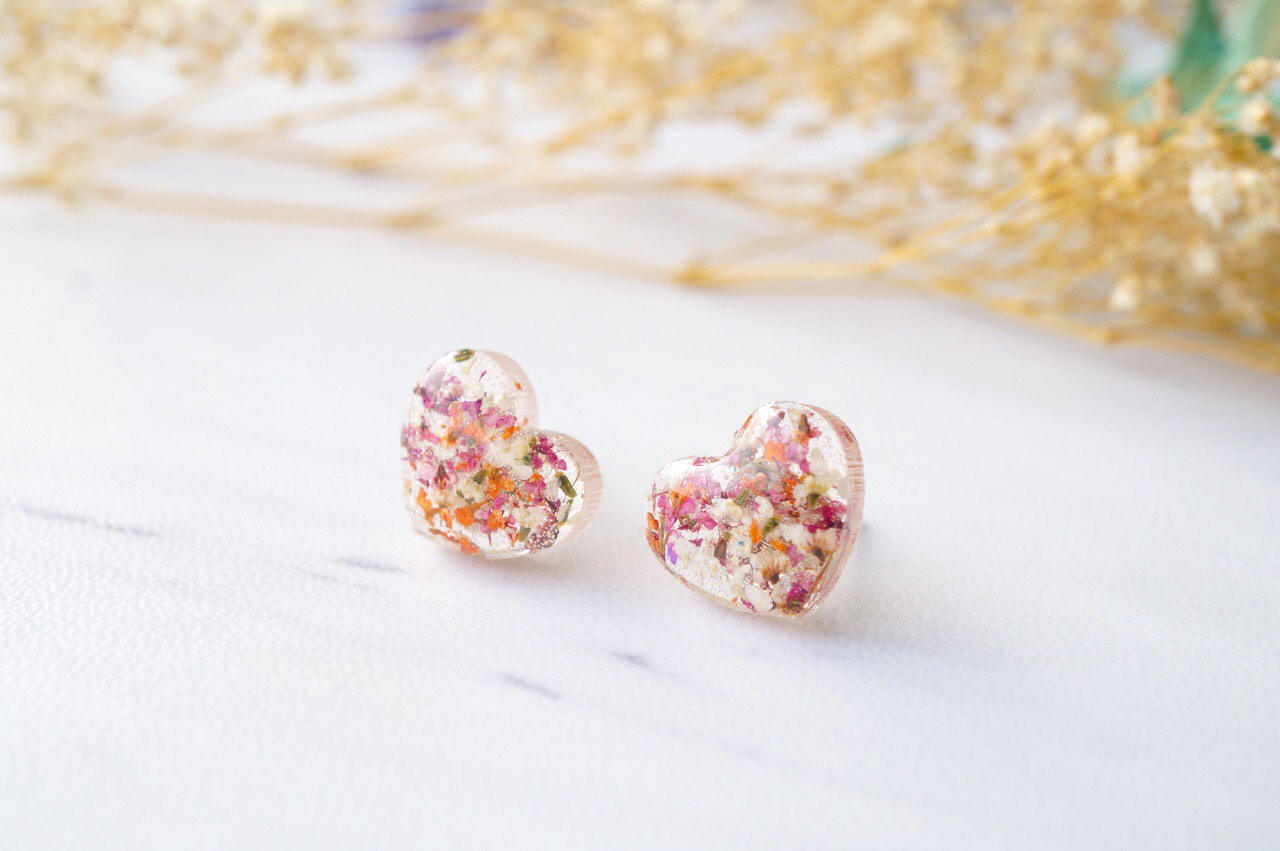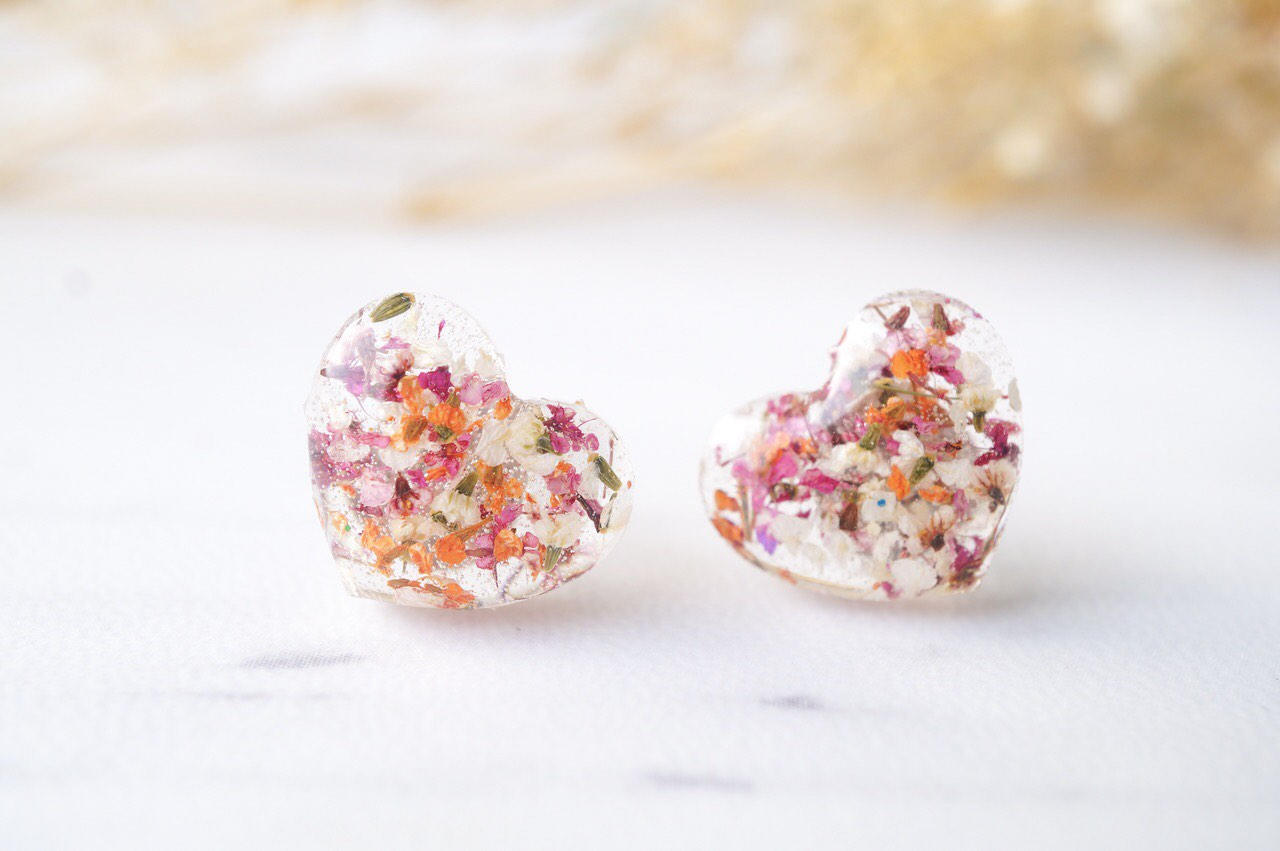 Real Dried Flowers and Resin Heart Stud Earrings in Pink Orange White