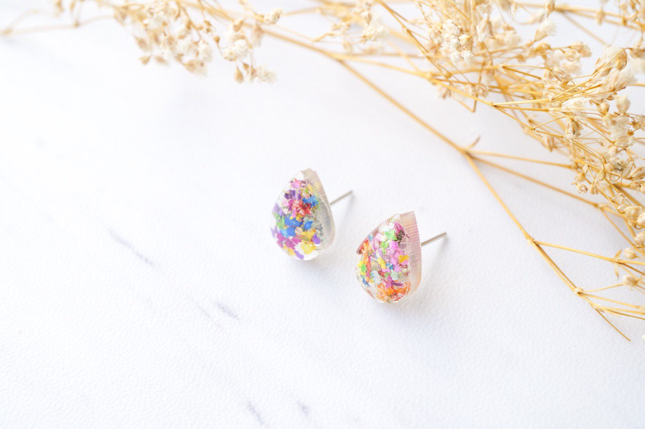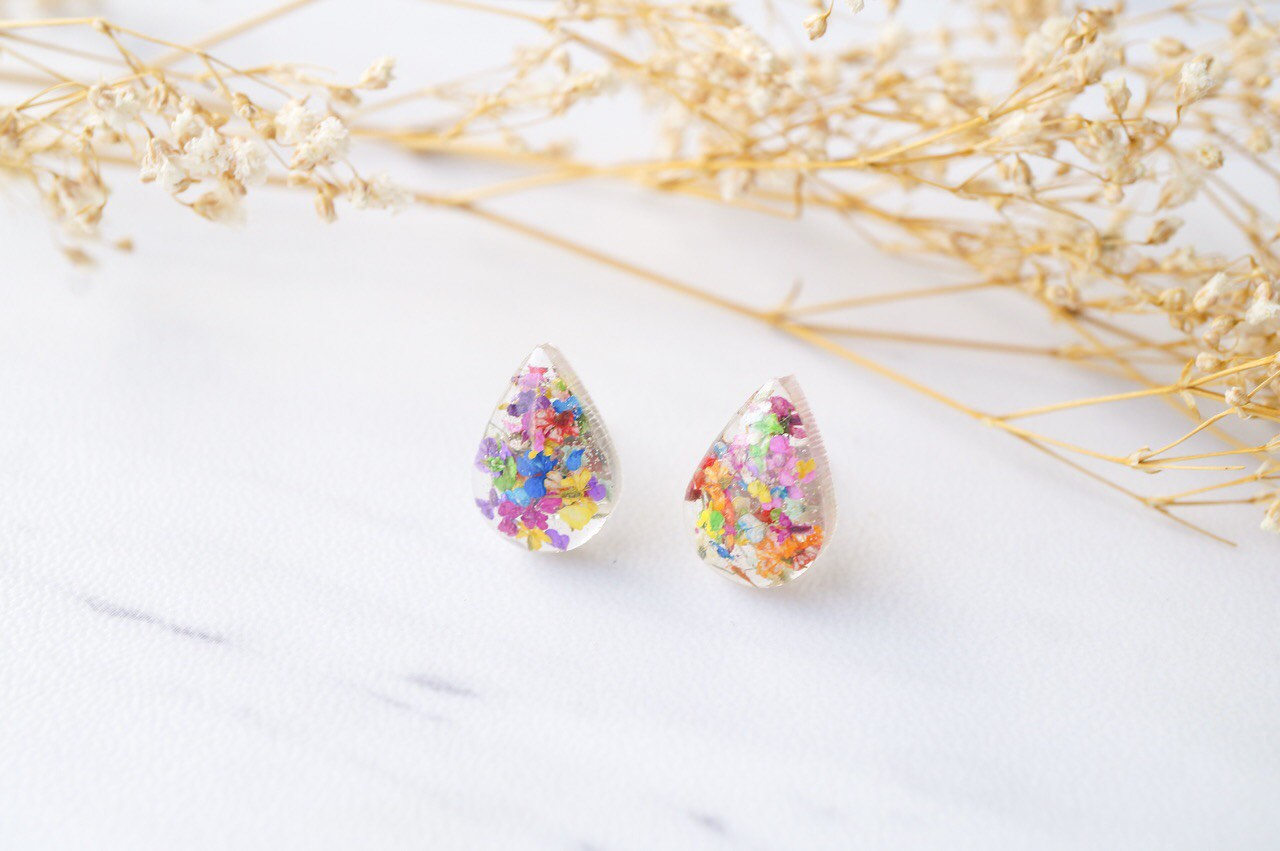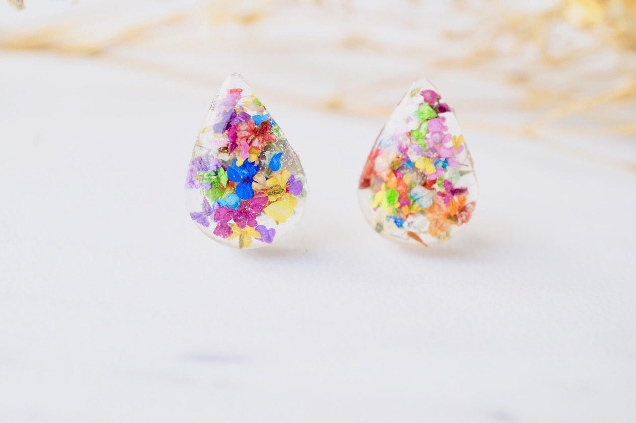 Real Dried Flowers and Resin Teardrop Stud Earrings in Party Mix