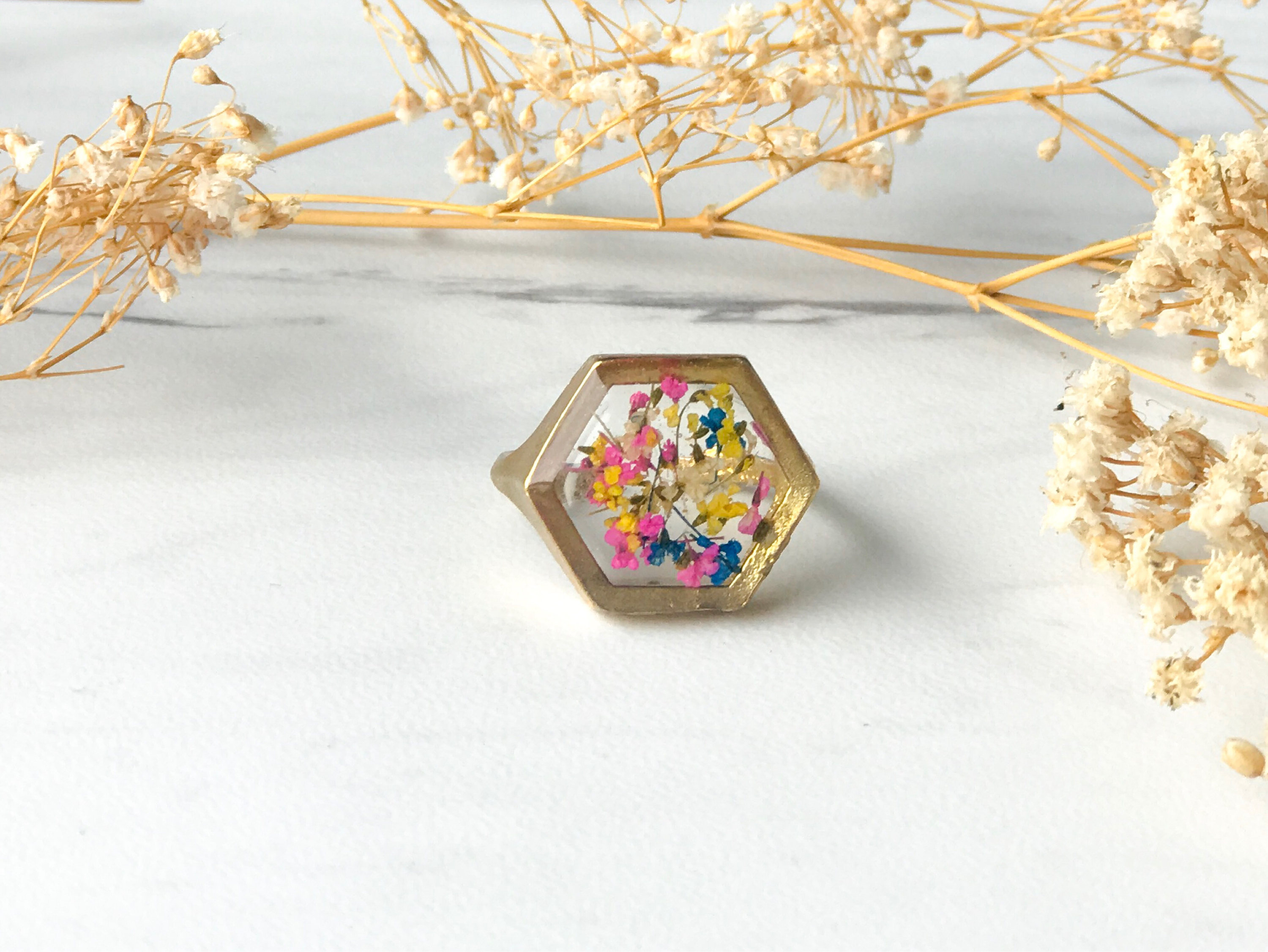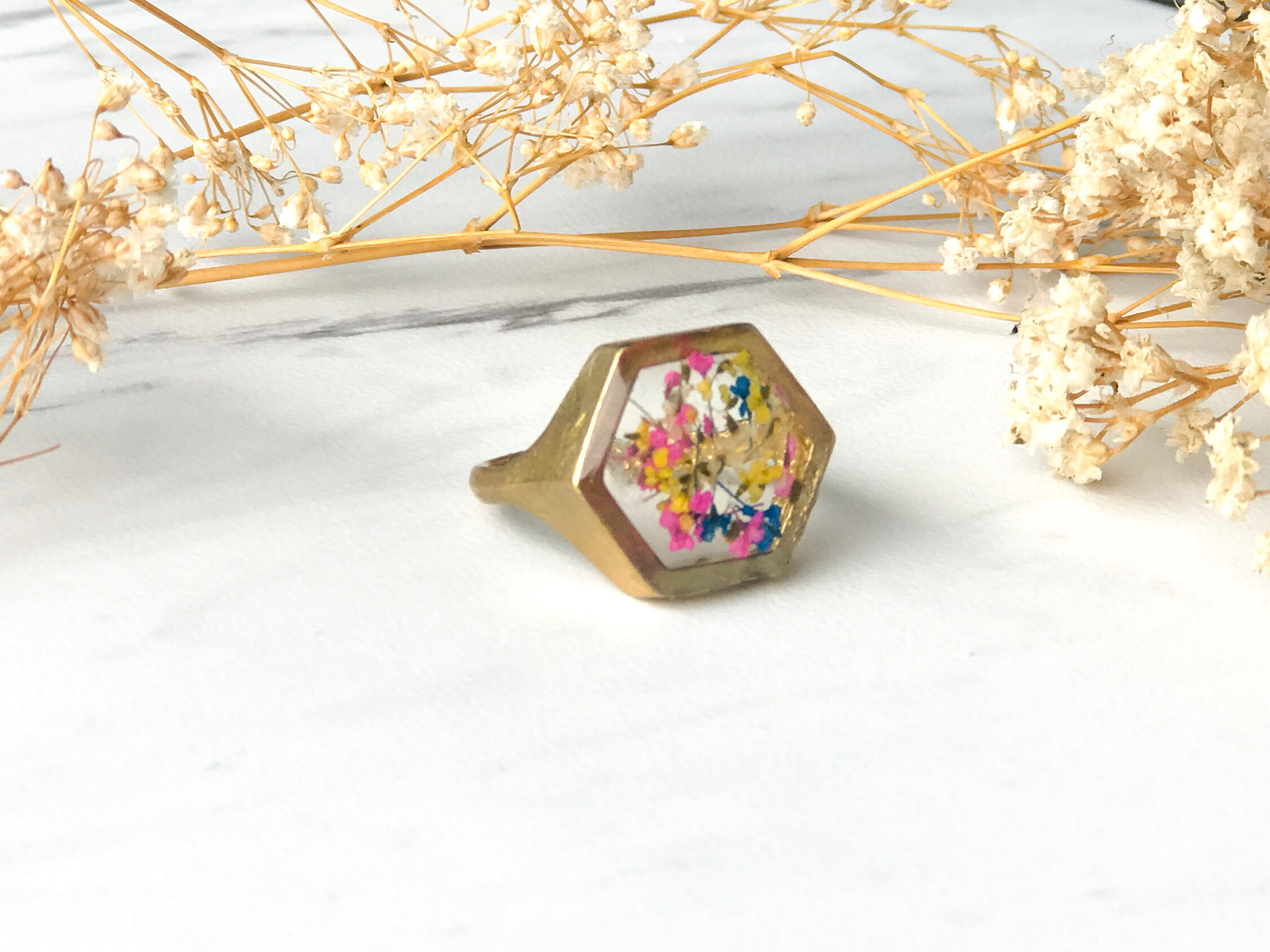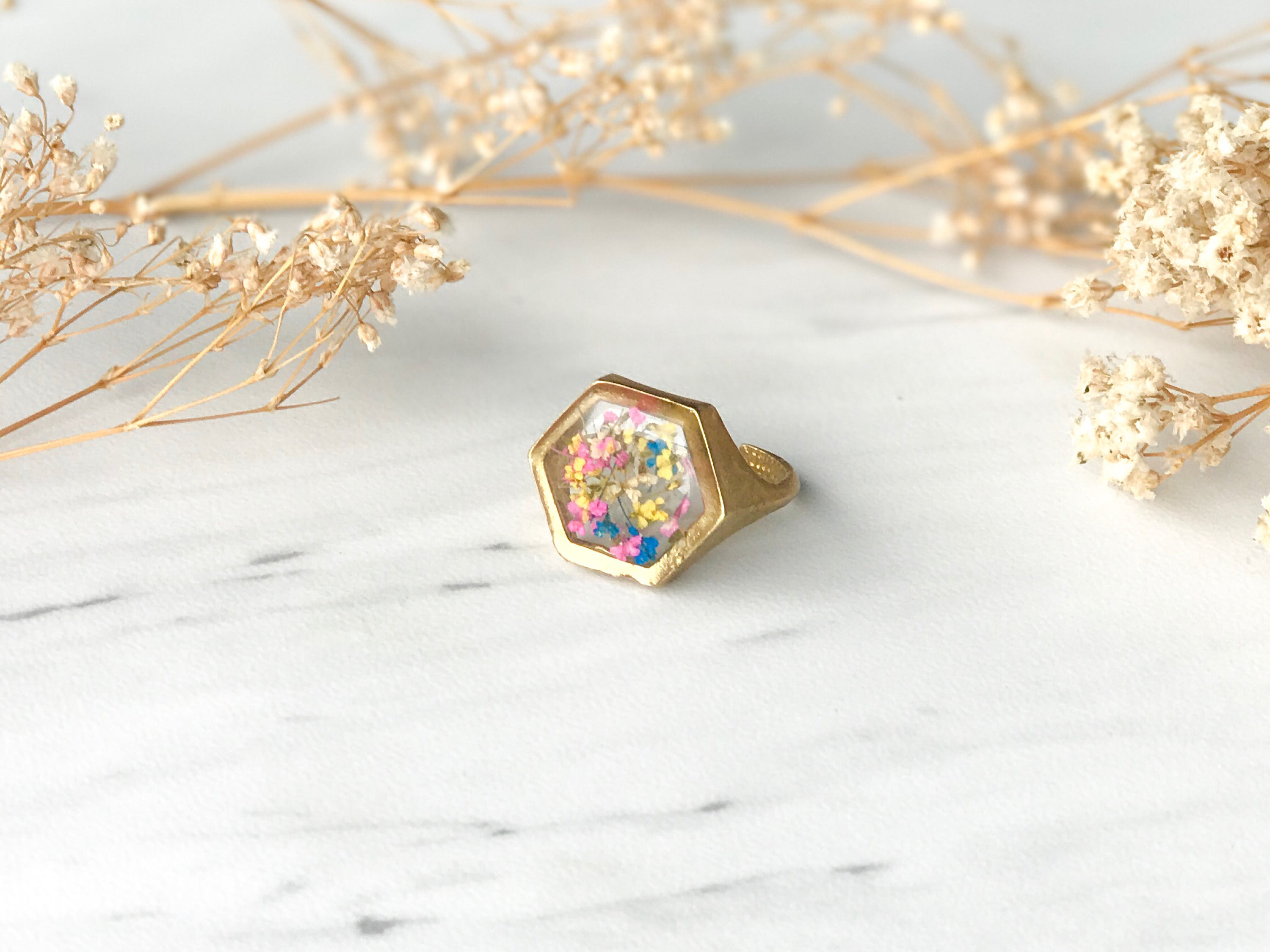 Real Pressed Flower and Resin Hexagon Gold Ring in Yellow Pink and Blue