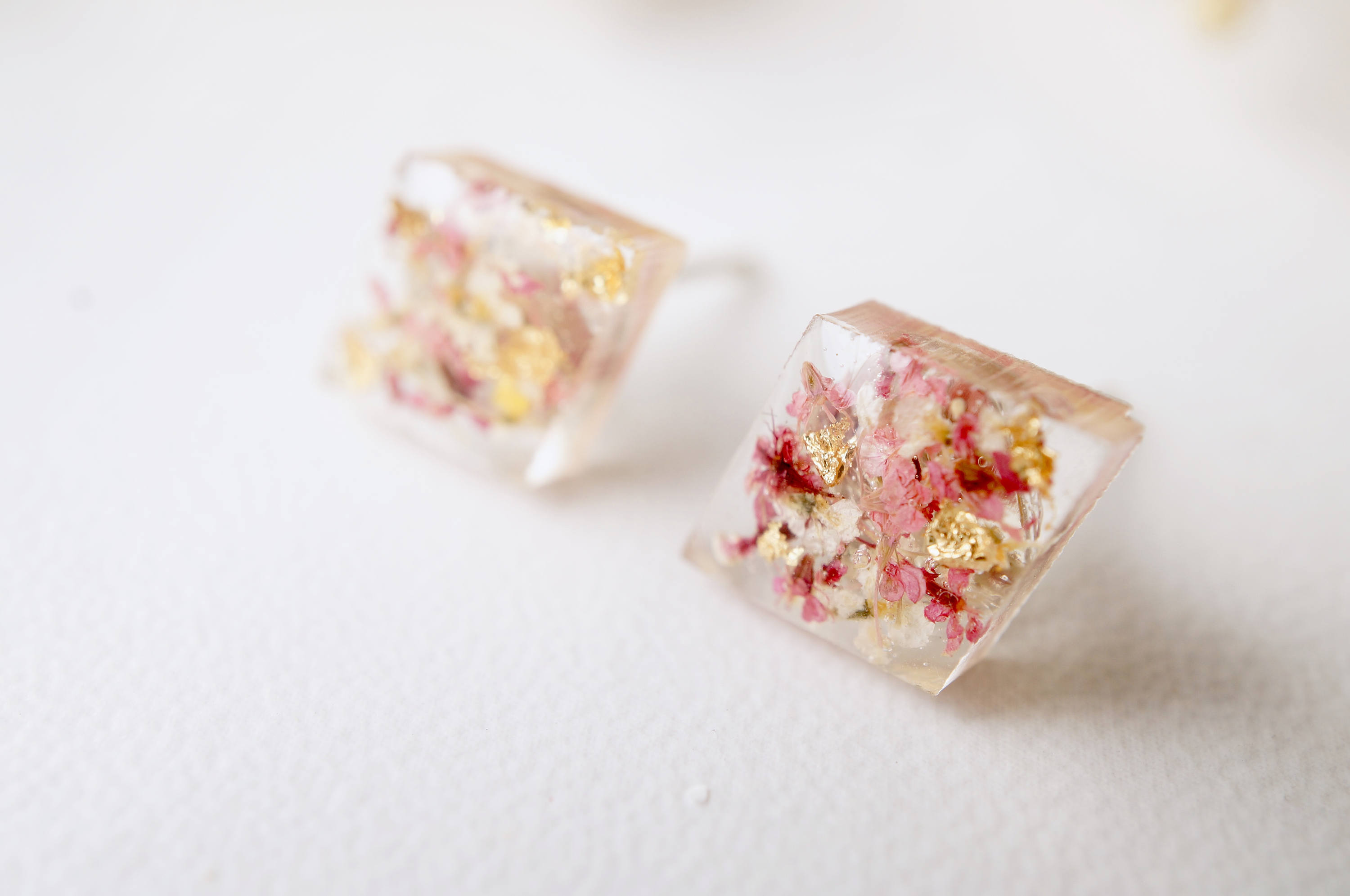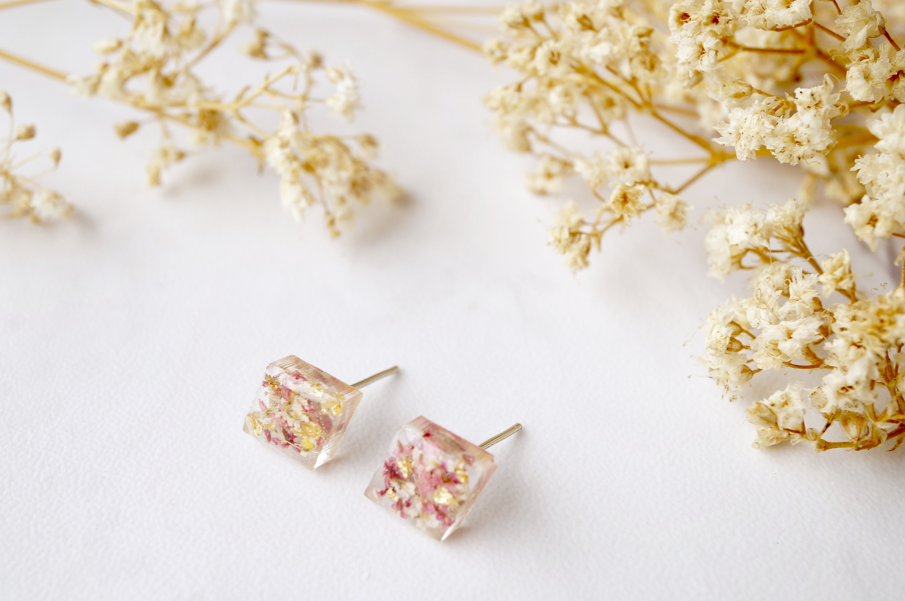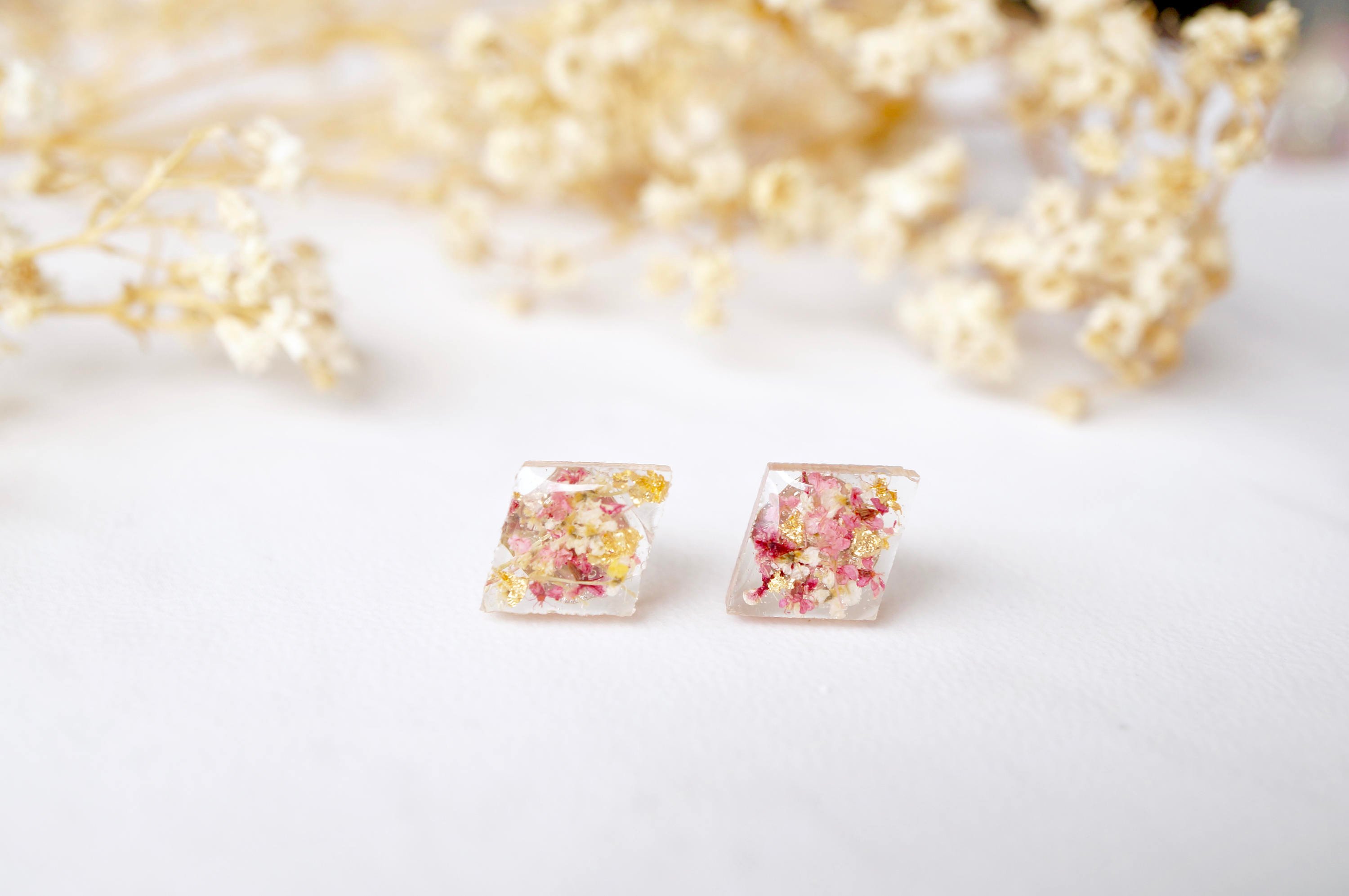 Real Dried Flowers and Resin Diamond Stud Earrings in Pink and White with Gold Foil