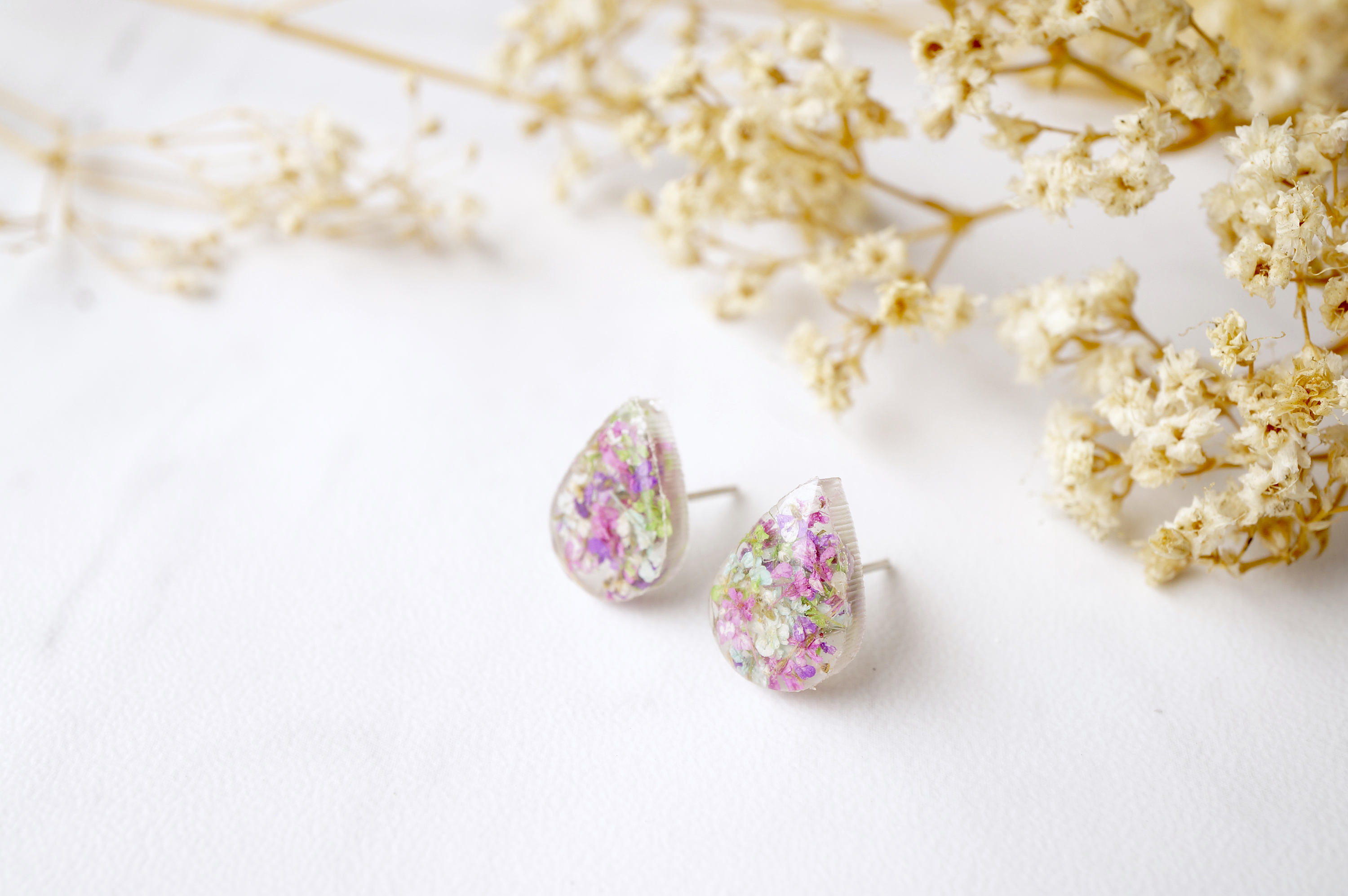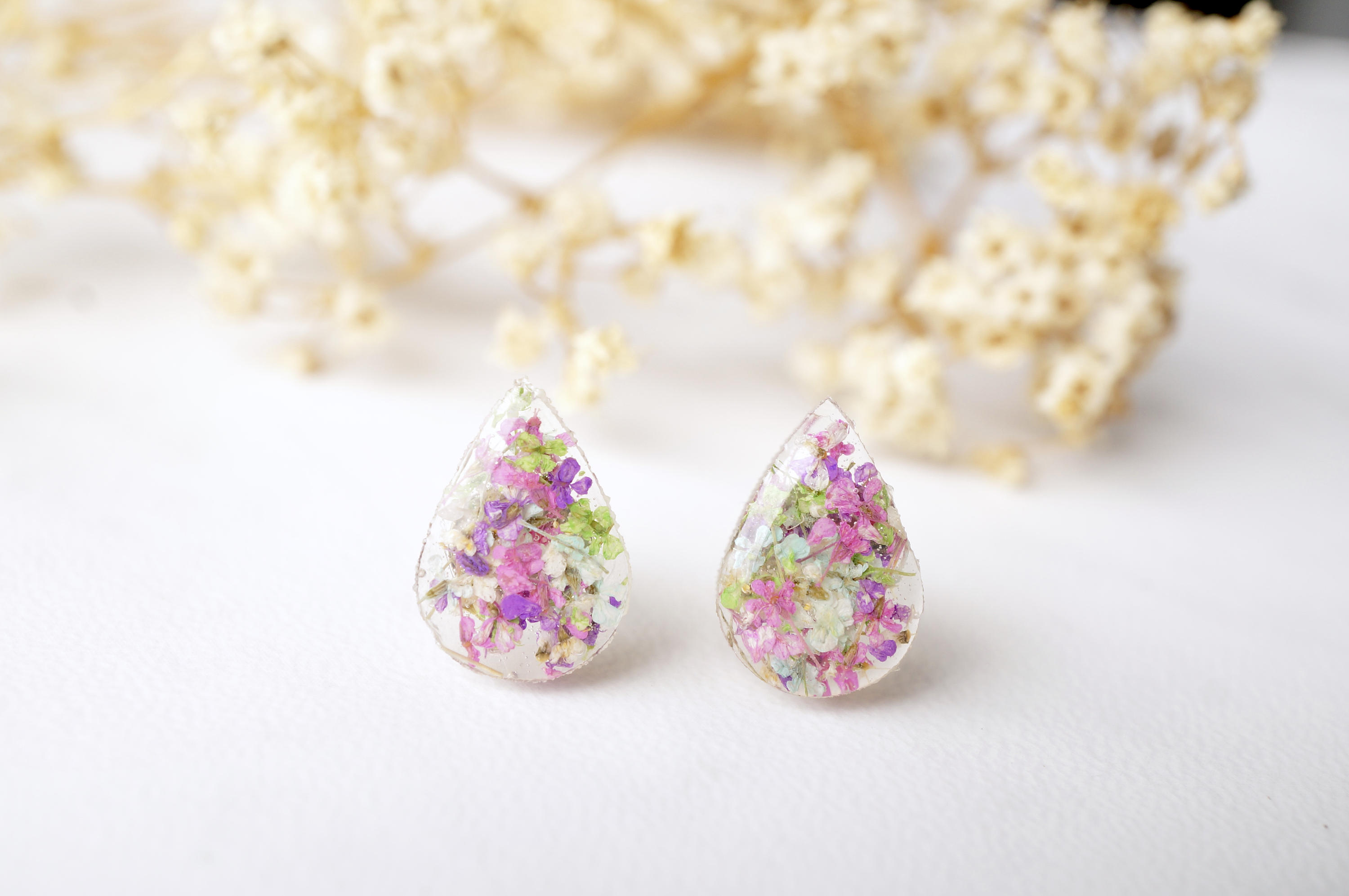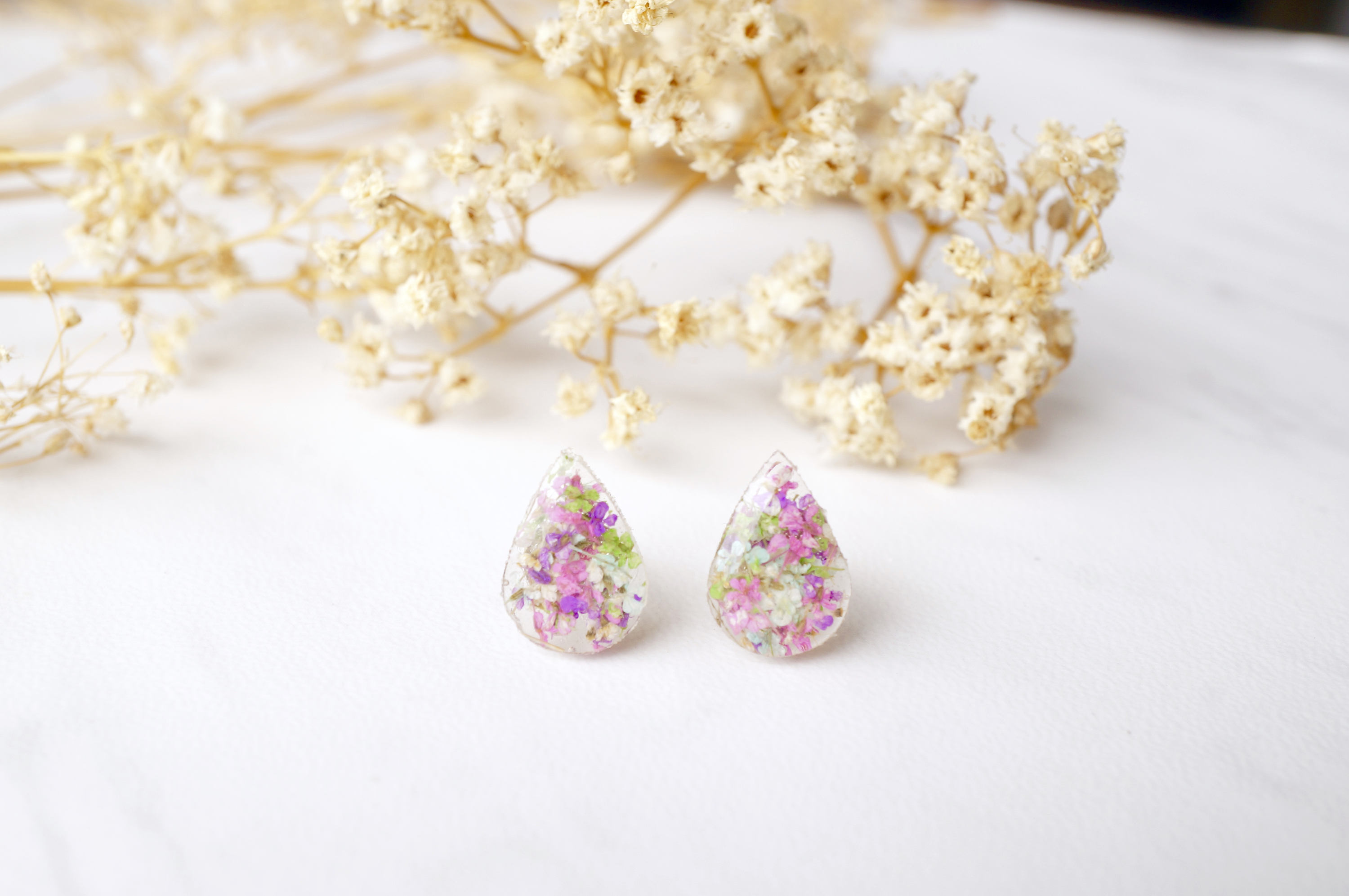 Real Dried Flowers and Resin Teardrop Stud Earrings in Pink Green Purple Mint and White